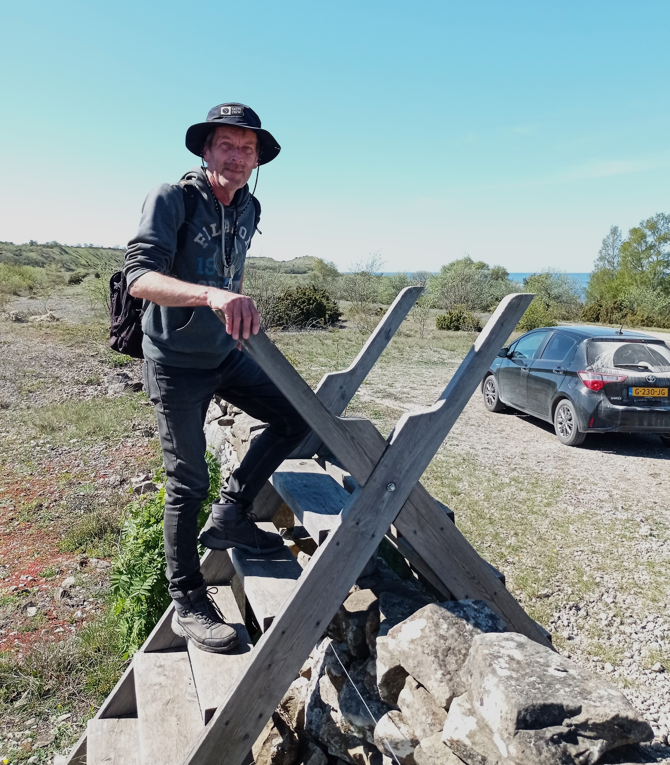 Deze te vinden was echter niet gemakkelijk. Een Zweedse motorrijder die vaak op Gotland kwam en een plaatselijke medewerker in het restaurant trokken hun schouders op. Ze hadden beiden nog nooit iets gehoord over zo’n steen. Dus moesten we zelf op zoek. Daarbij kwamen we terecht bij de vuurtoren en met een boog weer terug naar het Husrygg-natuurreservaat. Bijna ten einde raad zagen we tenslotte toch een vervallen aanwijzer langs het pad: ‘Gullstainen’.