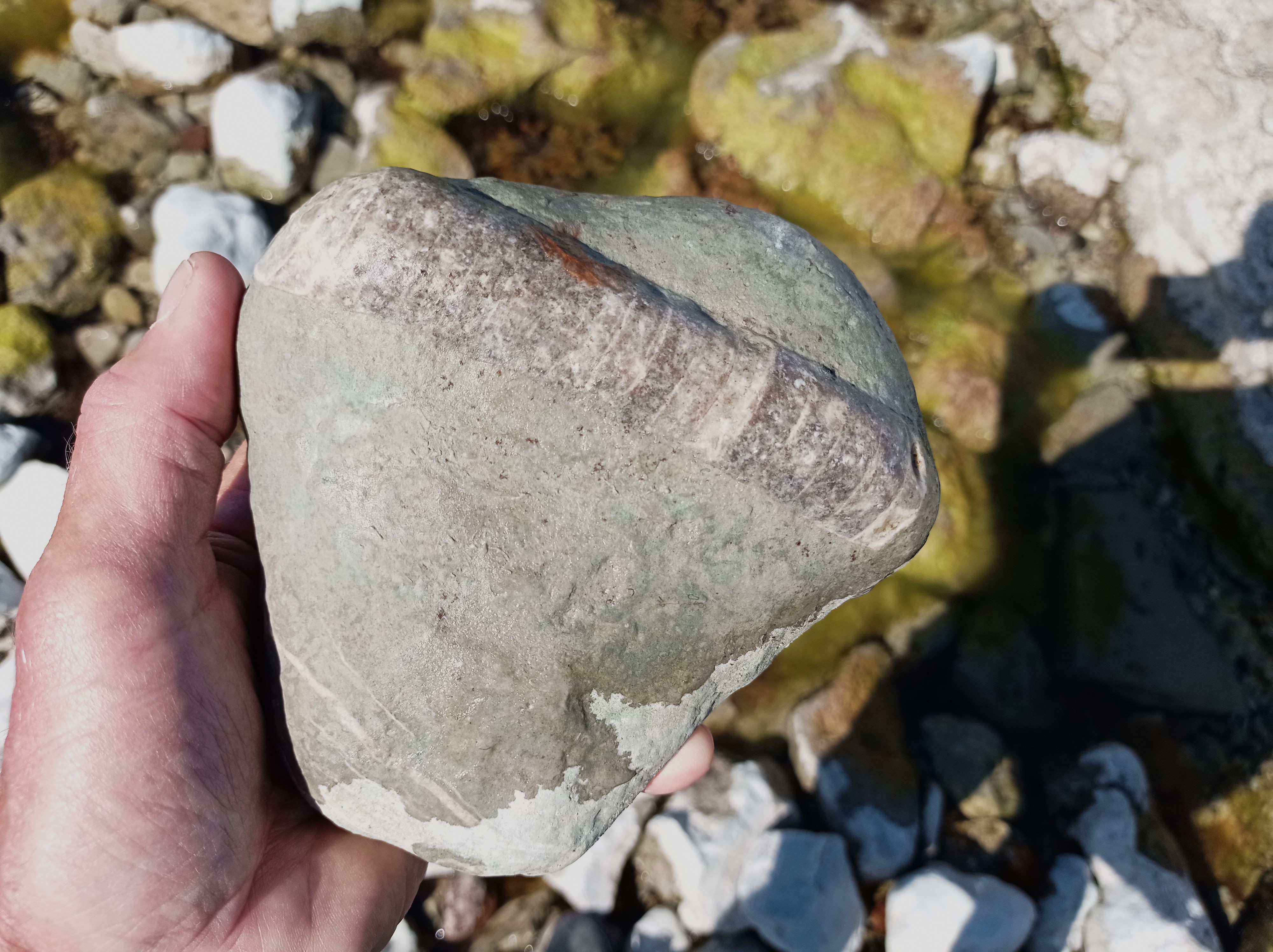 Als eerste hebben we Katthammarsvik aangedaan. Vlakbij de haven aan het keienstrand vonden we diverse stromatoporen. Helaas waren veel stenen weer overtrokken met een witte laag secundaire kalk waardoor de buit bescheiden bleef. Vervolgens door naar Grogarnshuvud. Daar werden we opgewacht door een koppeltje echte Gotland-schapen die ondanks de zorg voor hun lammetjes heel nieuwsgierig waren. Vlakbij het natuurreservaat Grogarnsberget konden we op het prachtige keienstrand fijn zoeken. Ik had me van tevoren al voorgenomen om hier speciaal te letten op een bepaalde schelp: Ilionia prisca. Dit is tot nu toe de oudstbekende cirkelschelp (behorende tot de Lucinidae).