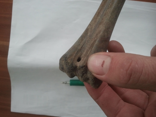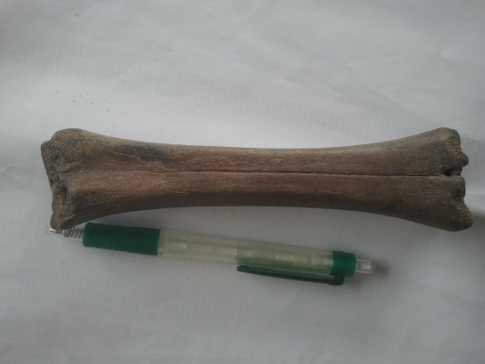 Het is een middenvoetsbeen van een jong dier nu de gewrichten nog niet aan elkaar waren gegroeid. De geul in het midden loopt door, dus ik denk aan rund : http://www.natuurinformatie.nl/nnm.doss ... 05359.html