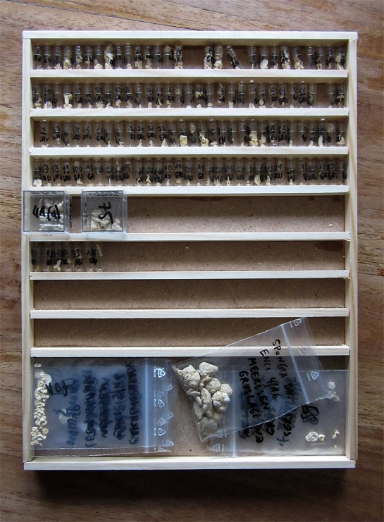 In dit soort zetkastjes archiveer ik de fossielen uit een bepaalde stratigrafische laag in het Limburgs Krijt. Hier zien jullie ca. 120 bryozoa-soorten als ook brachiopoden, sponzen, zeeegels, serpuliden en een foraminiferen. Alles op zo'n 30 x 20 x 1,5 cm.