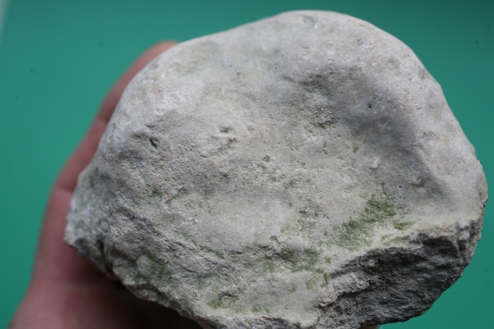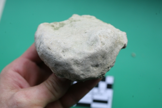 Dit item heb ik op een strand in Normandië gevonden (ik weet helaas niet meer welk strand). De ene keer zie ik er niets in en wil ik het weggooien, de andere keer heb ik het idee dat het een stuk (de hoed) van een spons is. Iemand enig idee of het een fossiel is en zo ja welk?