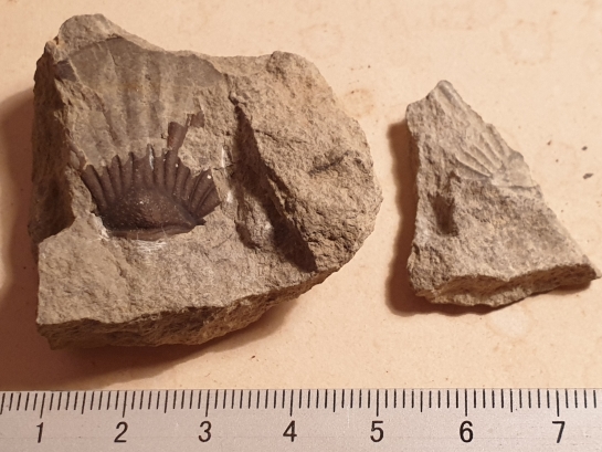 Dank voor je reactie. Is de structuur niet enorm groot en waaiervormig voor een pygidium? Het grootste deel van de waaier is weliswaar alleen als afdruk aanwezig maar geeft wel duidelijk grootte en vorm aan. Deze vorm ben ik niet eerder tegengekomen bij Trilobieten daar. De door mij daar gevonden Trilobieten zijn over het algemeen ook veel kleiner dan dit deel, in totaal hooguit 2cm. groot.