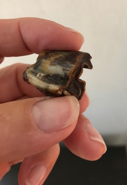 Deze fossiel heb ik gevonden op het strand van Vrouwenpolder. Van welk dier is het een tand? Ongeveer 2,5 cm.