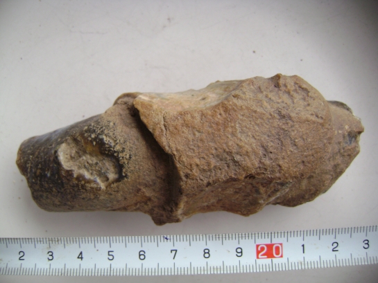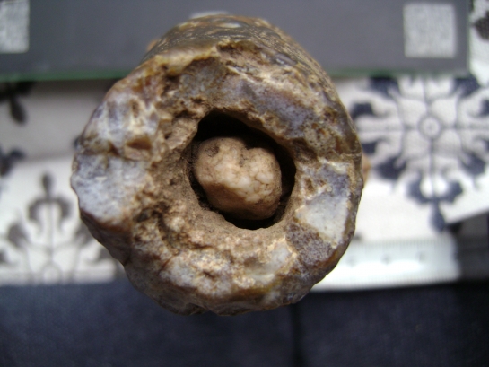 Het is zeker een stuk vuursteen. Vuursteen wordt in holle ruimten in een fossiele zeebodem gevormd. Ik zie geen bewerkings of slagsporen.