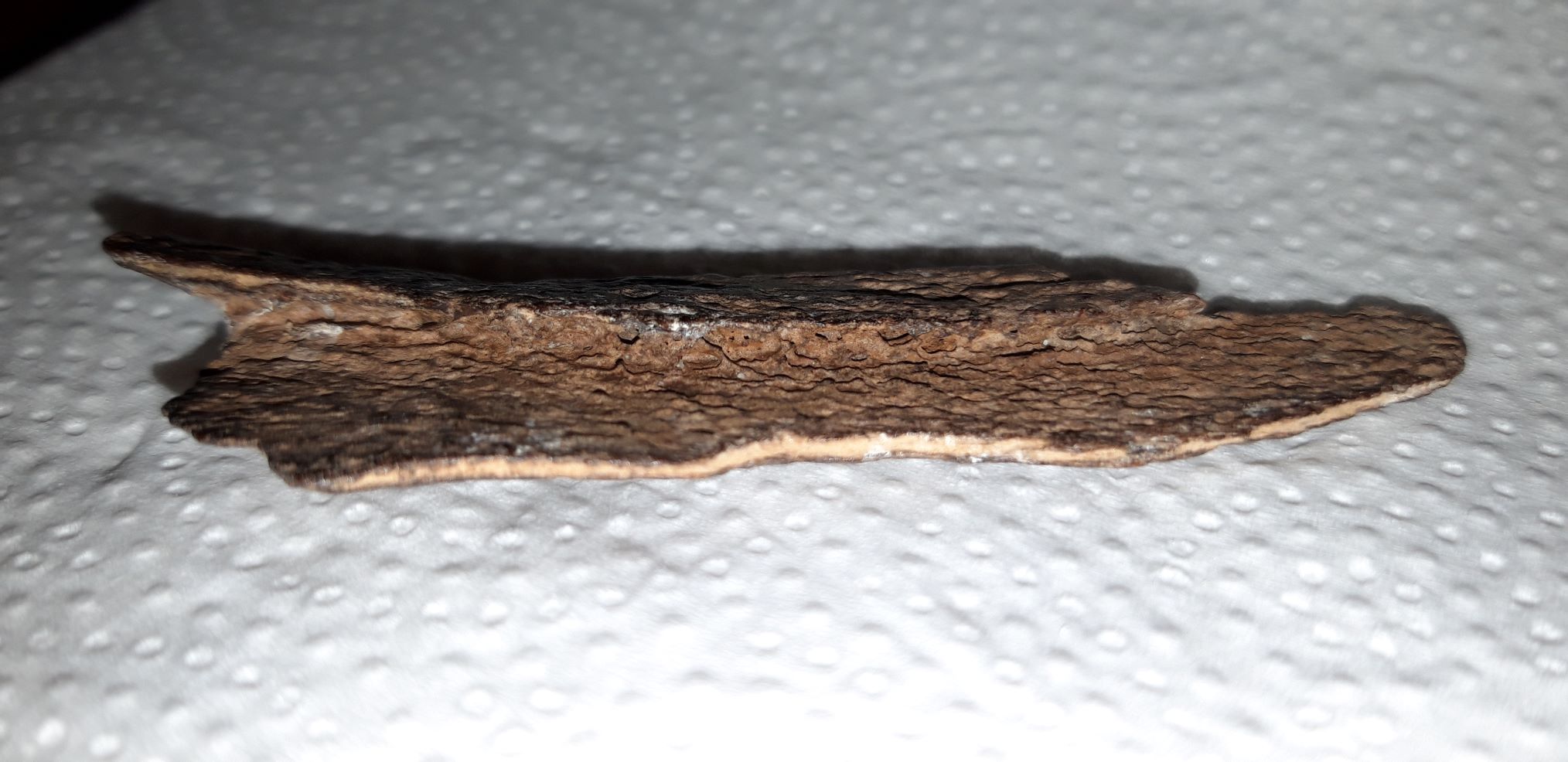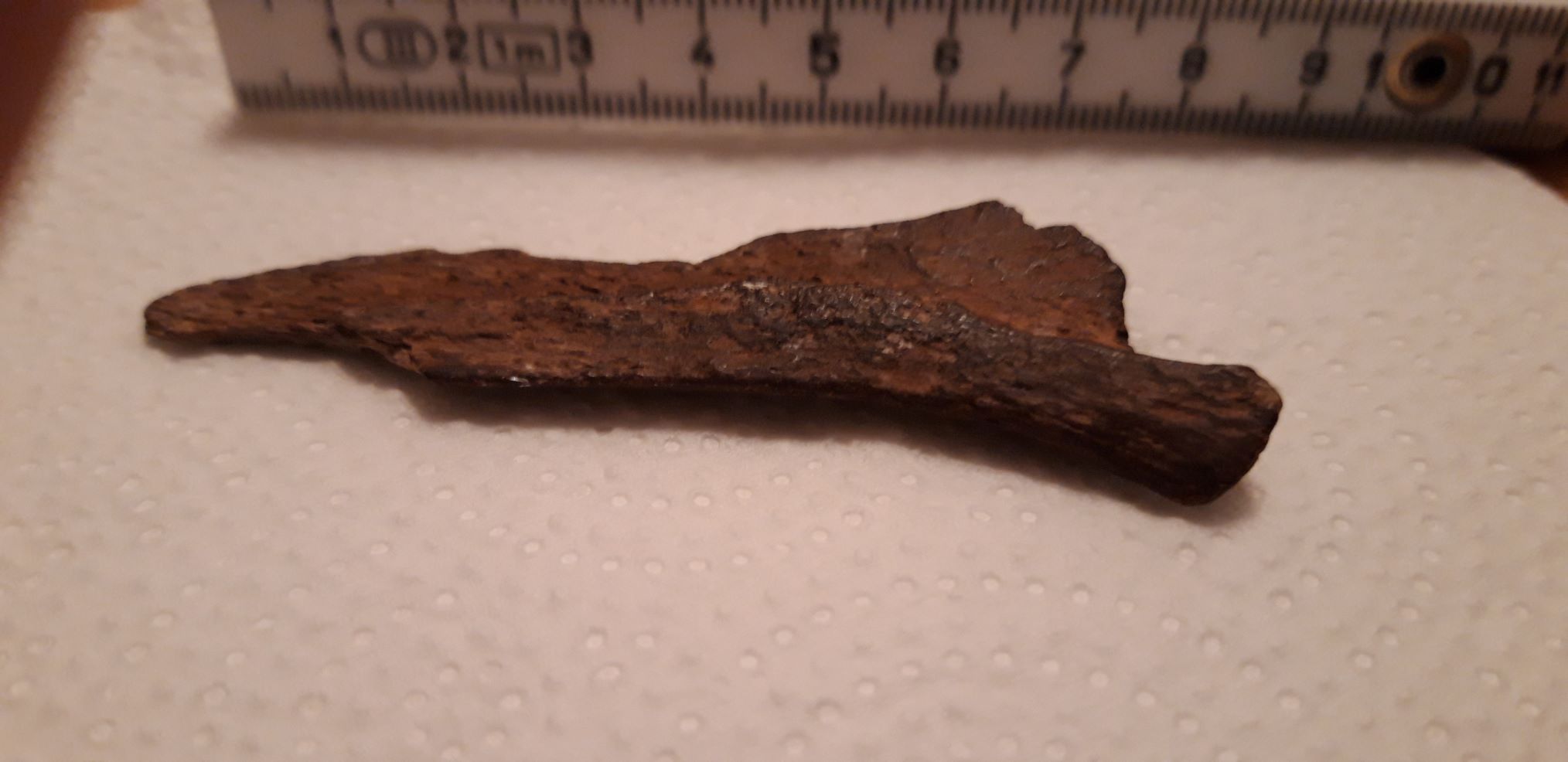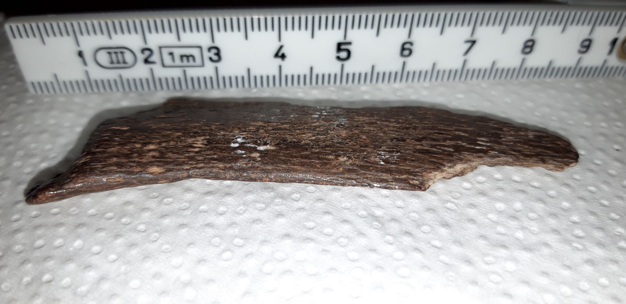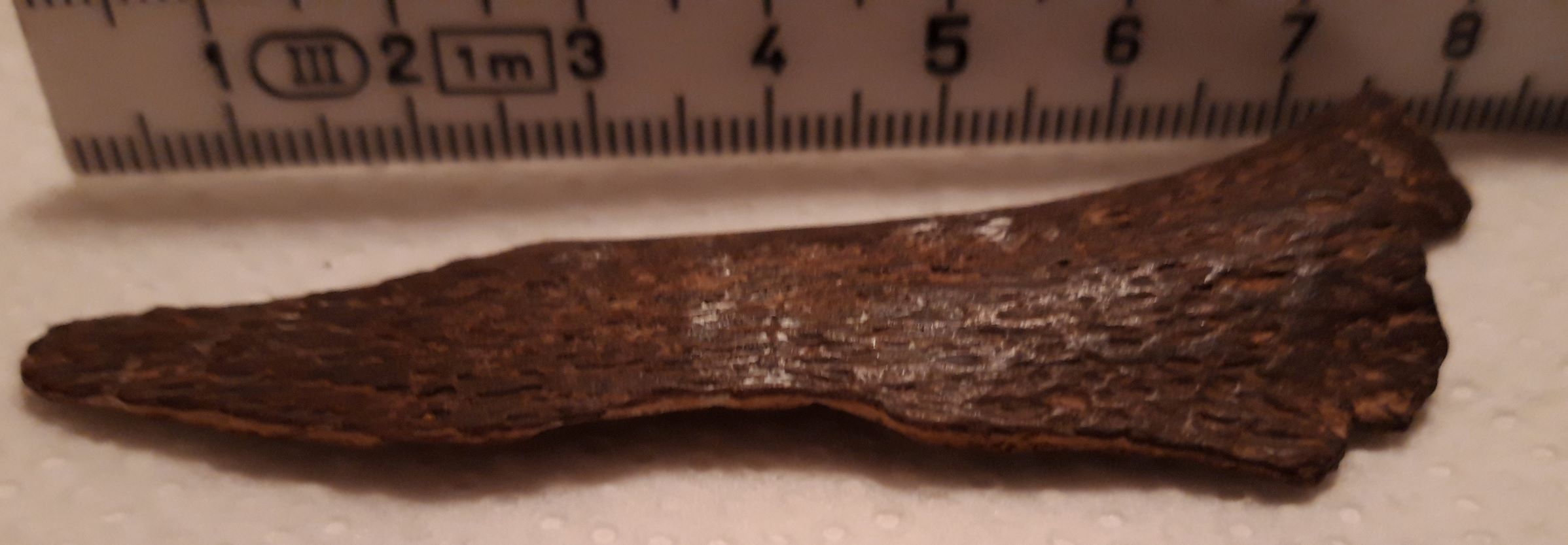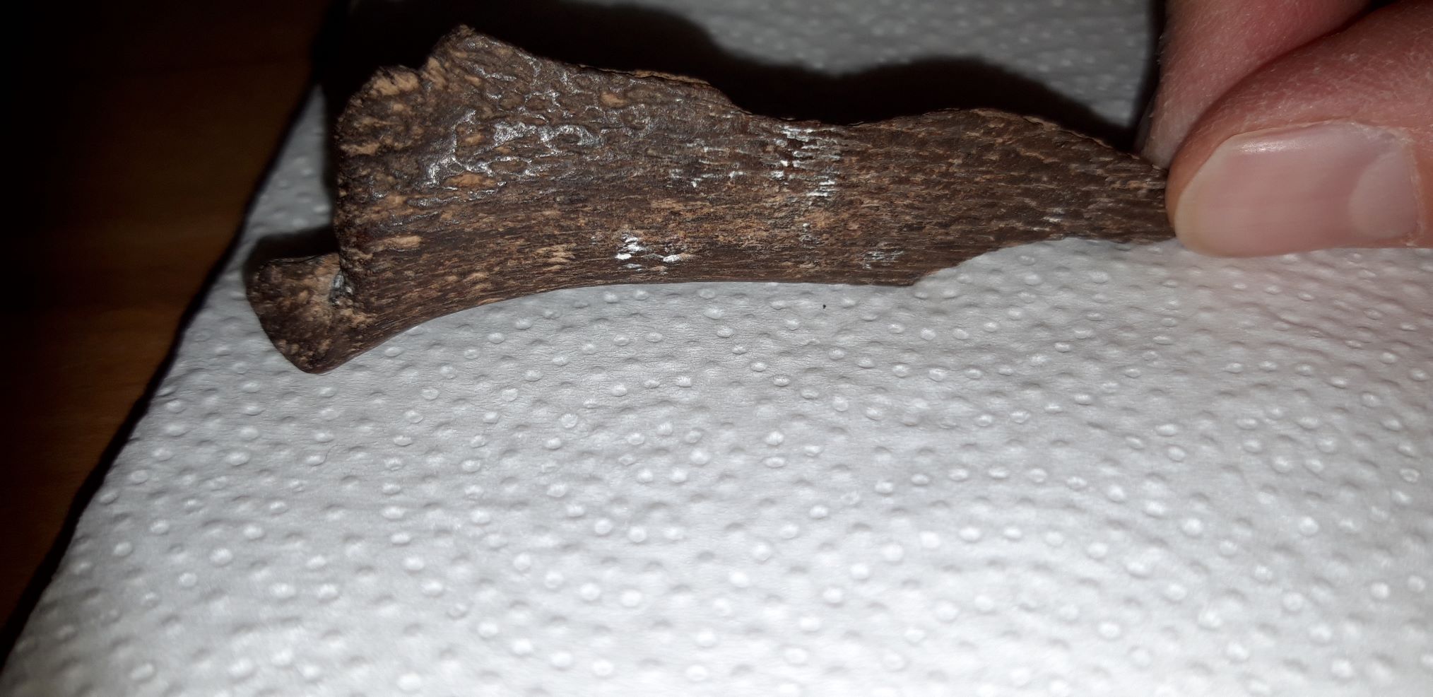 Maar de structuur kan ook een fossiel zijn. We kunnen een deel van een hoorn of een gewei vermoeden. Misschien is het ook het deel van een elleboog of spaakbeen van een dier? Het object is ongeveer 7,5 cm lang en weegt 6 gram.