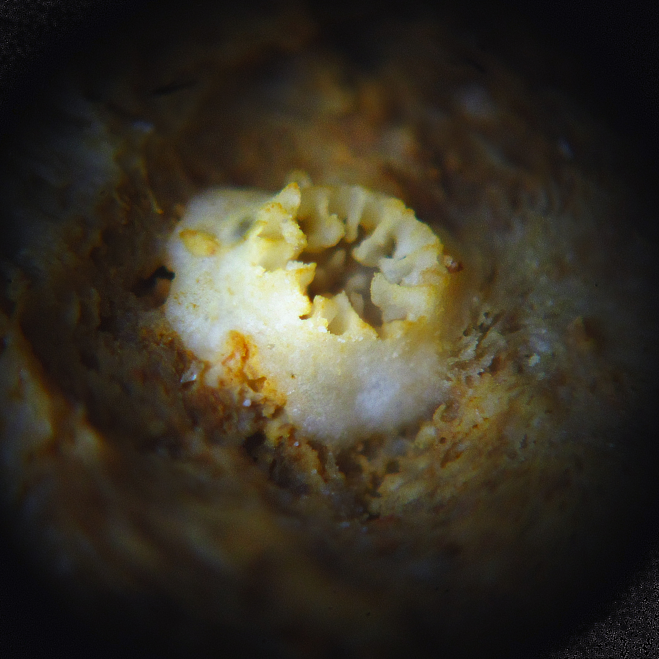 bij deze een klein koraaltje (ca. 1,7 mm breed) uit de Meerssen member van Maastricht.