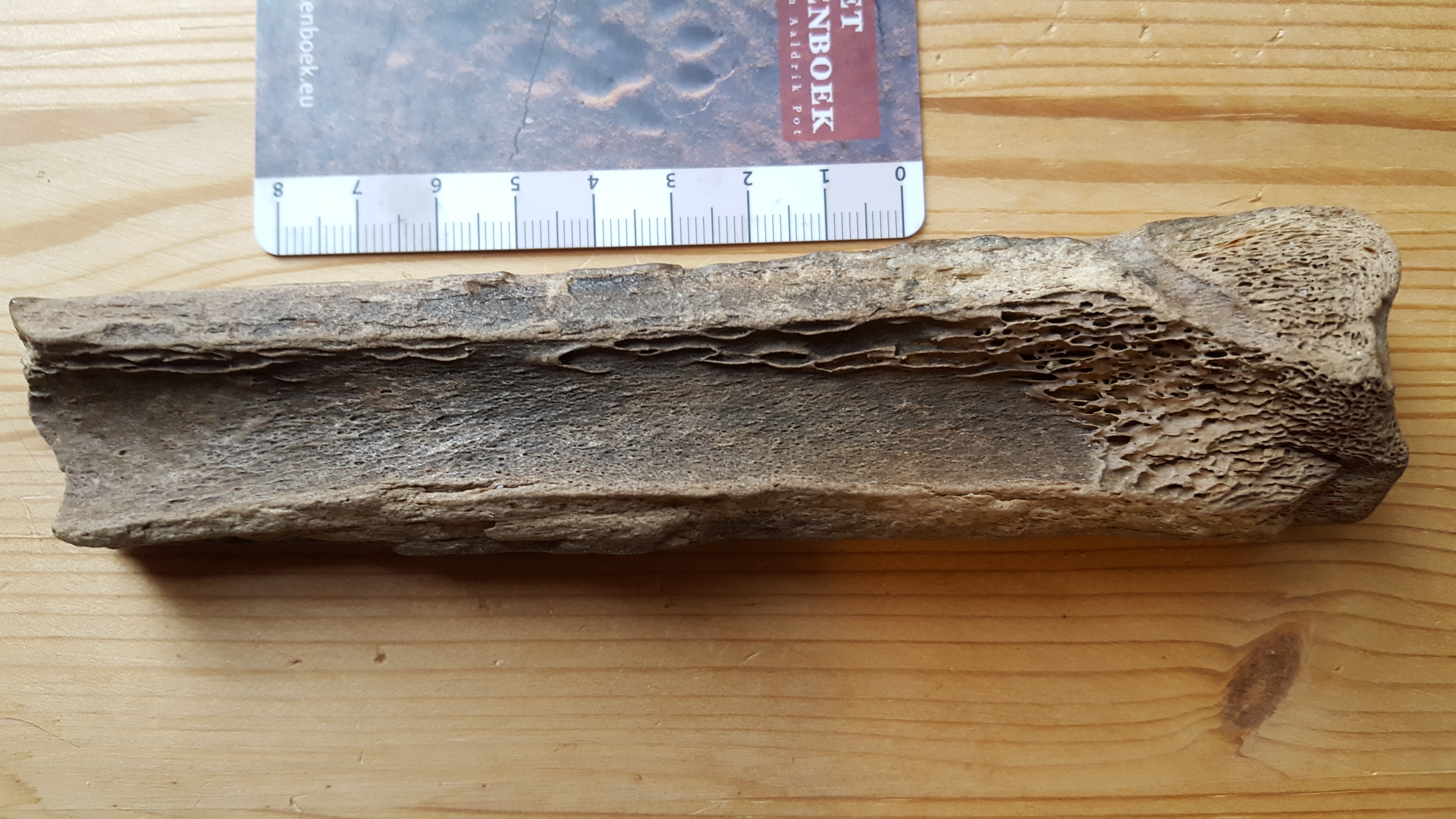 Eerst een groot stuk bot. Zit ook een gangetje/gat in. Lijkt alsof dat al bij leven gebeurt was omdat de botstructuur daarop aangepast is?