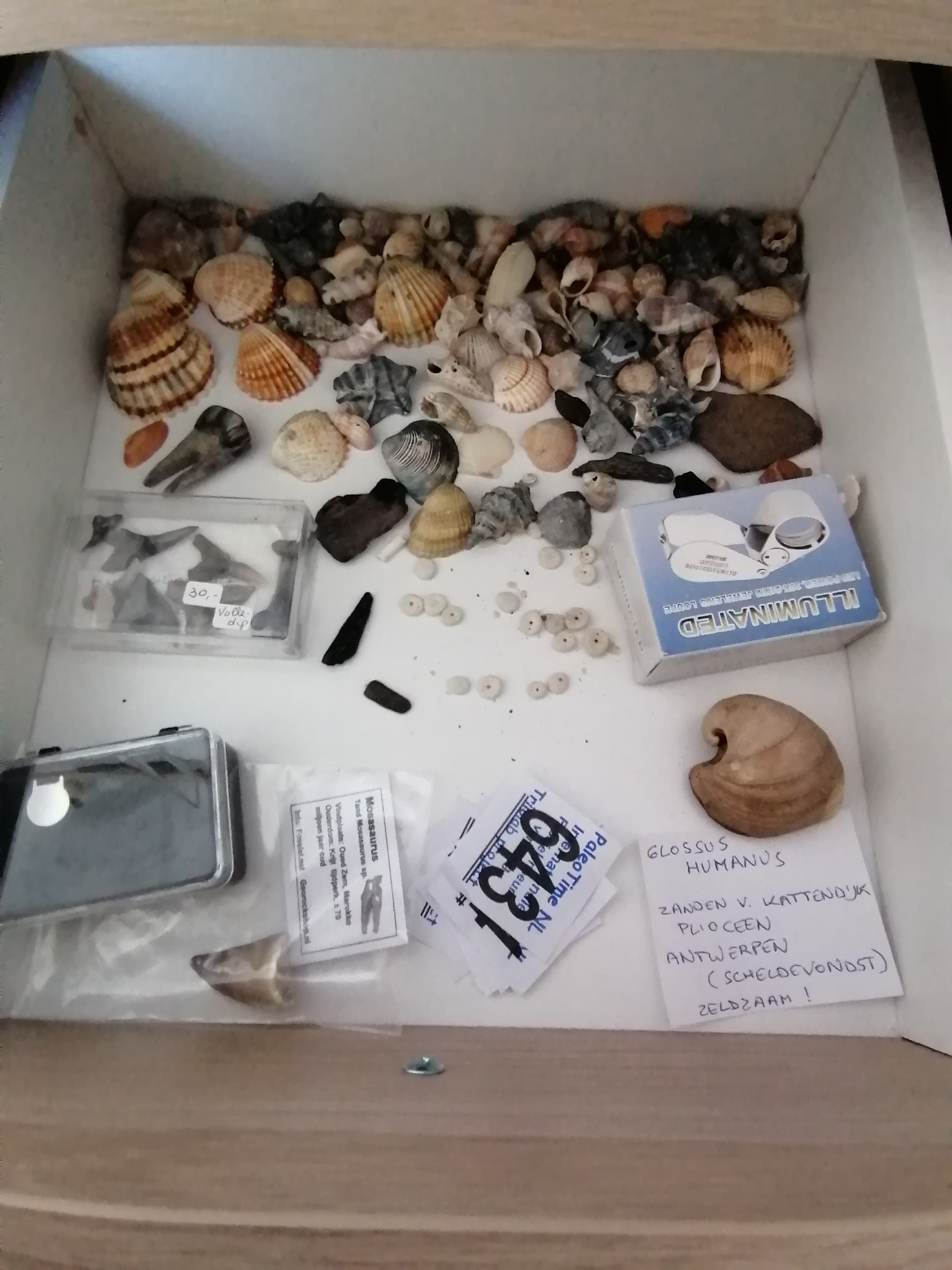Hier is mijn fossielen collectie zoals hij eruit ziet na 12 jaar verzamelen. Het meeste komt uit het tertiair en kwartiar van de Nederlandse stranden maar er is ook een hoop (aangekocht.) materiaal uit het mesozoicum van nederland en buitenland, ook zelf gevonden. Bijna alles in mijn collectie is zelf gevonden tenzij anders vermeld. Ook heb ik een bescheiden aantal vondsten uit het paleozoicum. Ik hoop dat Jullie er veel plezier aan beleven, ik zeker! ;)
