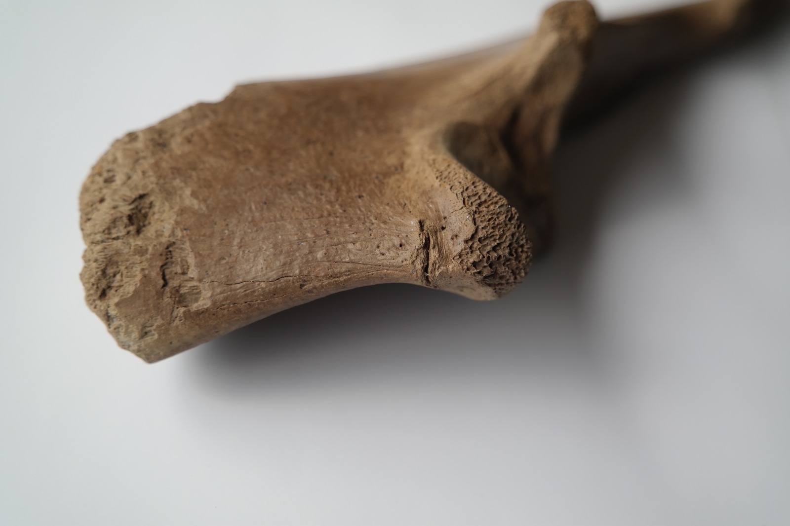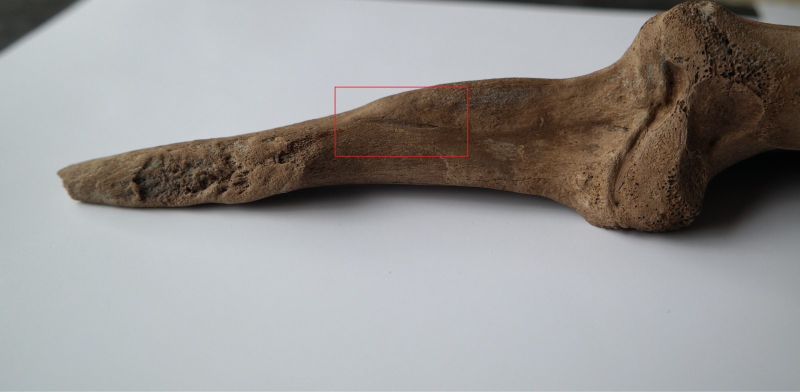 Op 08-02-2020 heb ik deze ulna (paard?) gevonden. Het viel mij op dat er 2 gleuven te zien zijn in het bot. Diegene aan de achterkant van het bot lijkt ook een stuk dieper te zijn. Zou het hier mogelijk om snijsporen kunnen gaan?