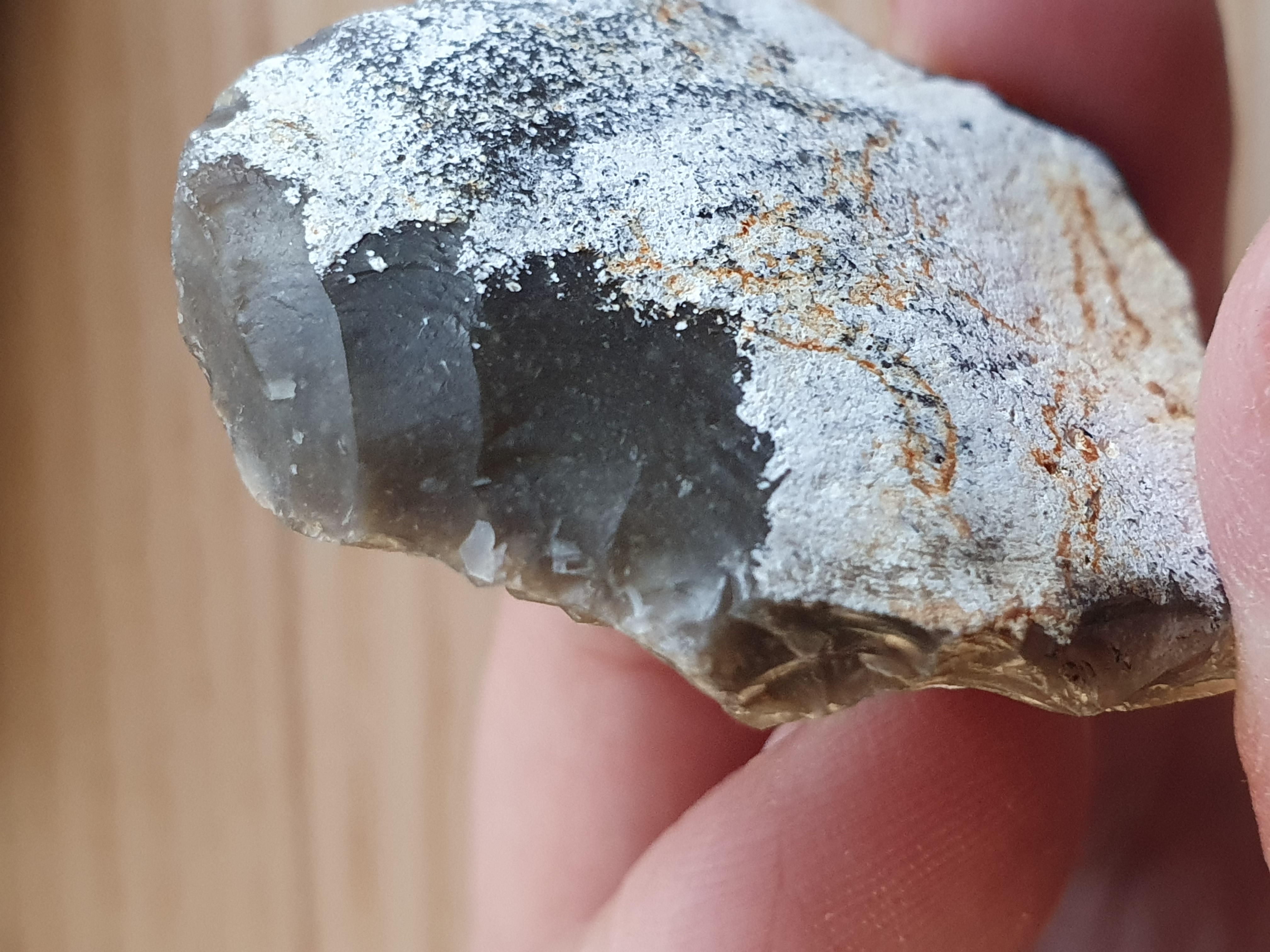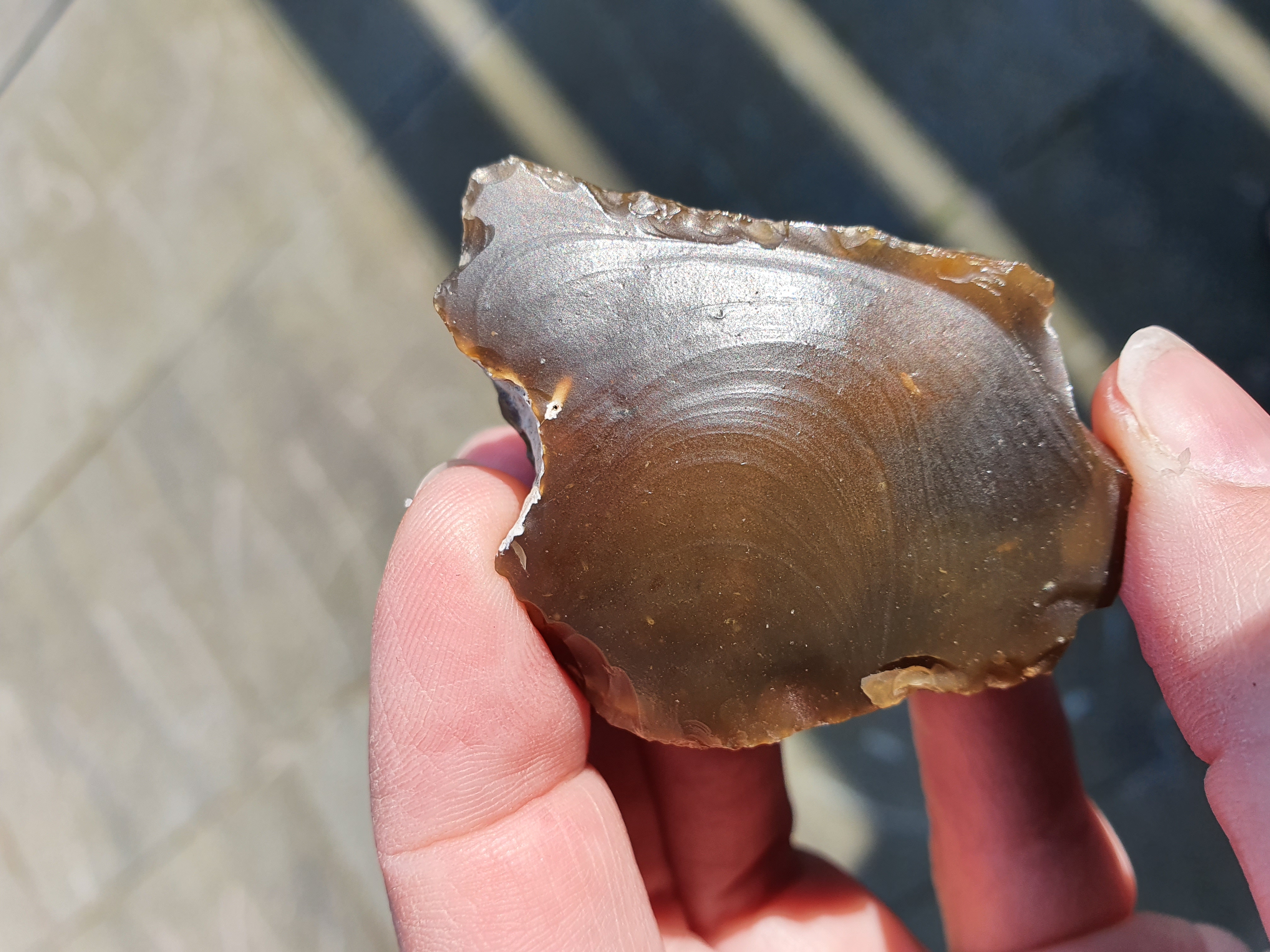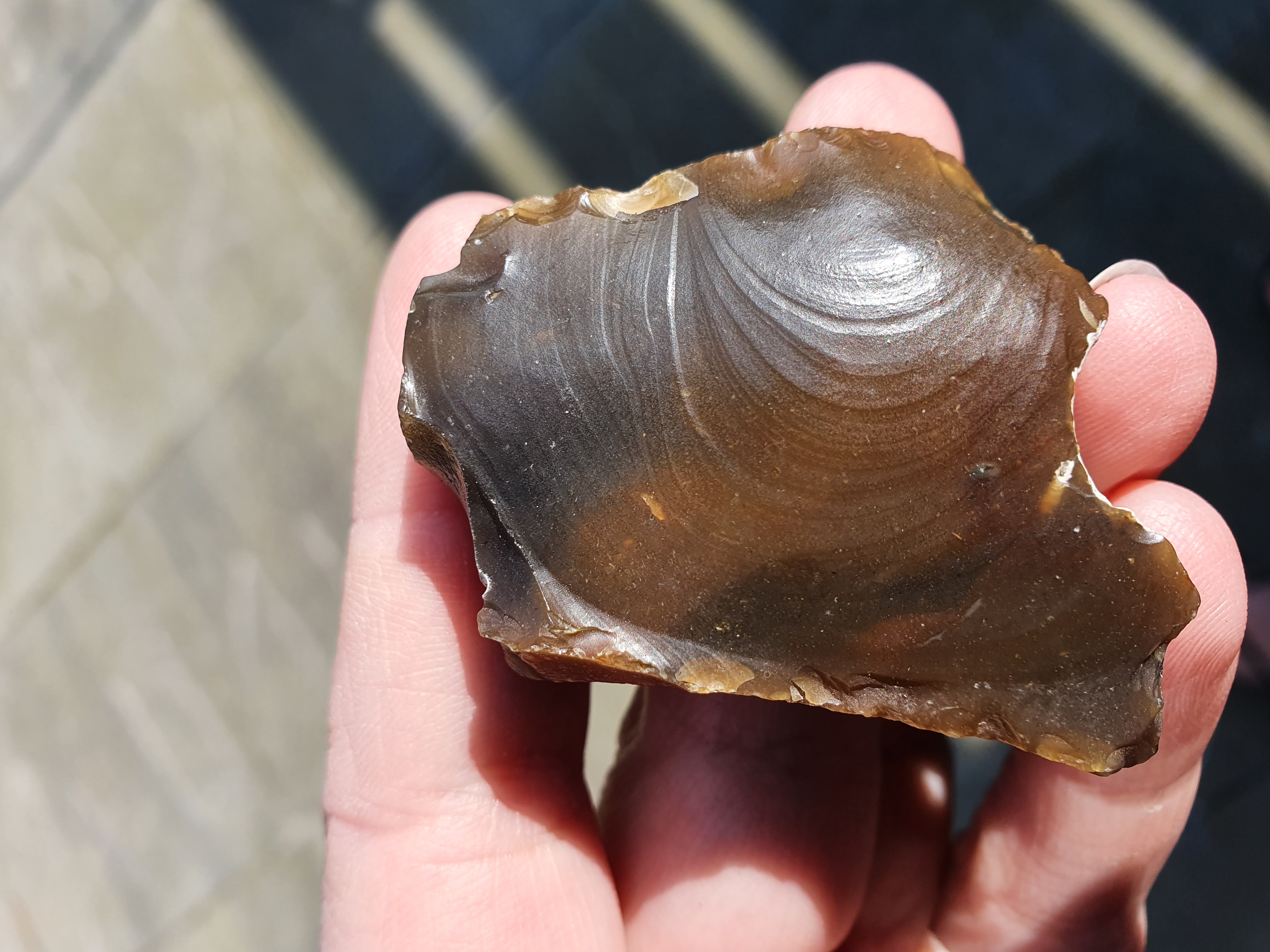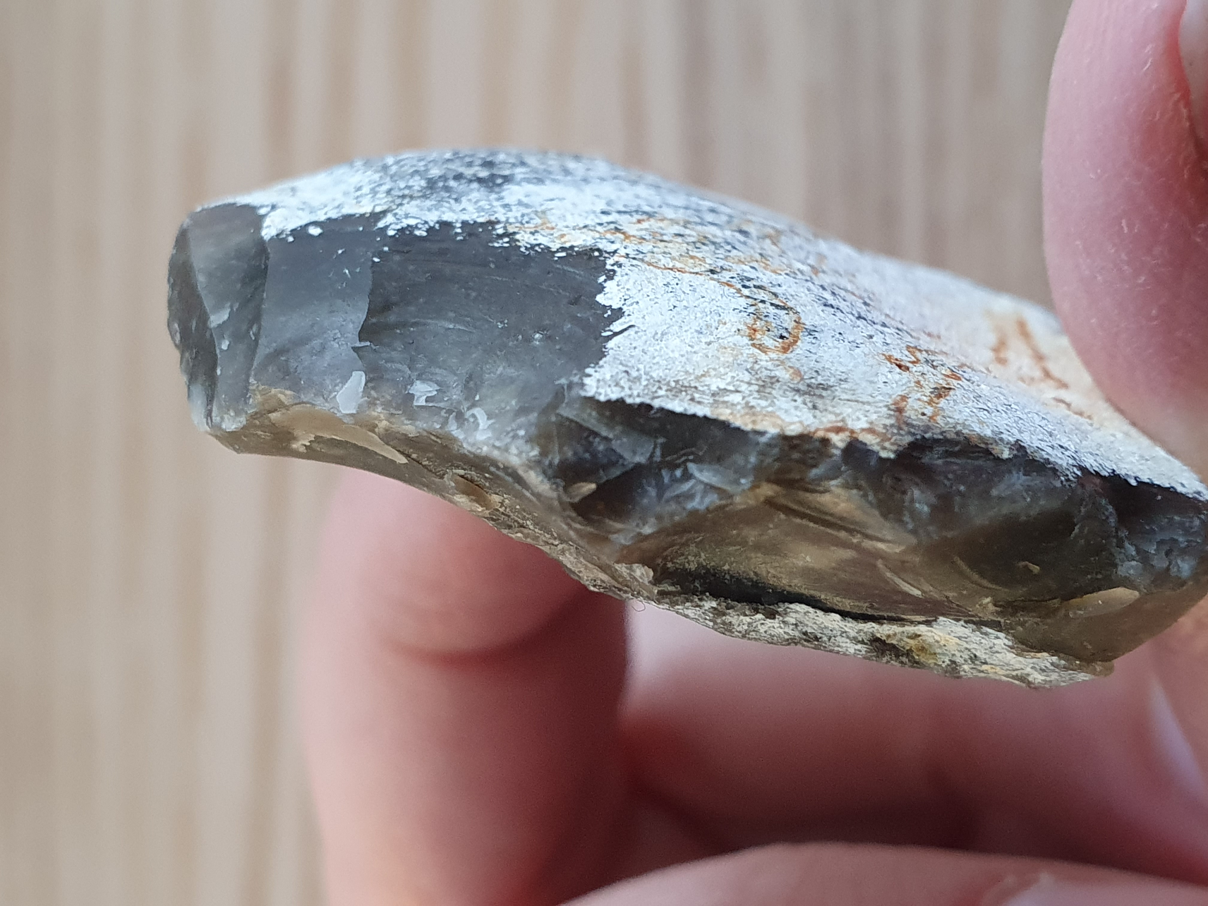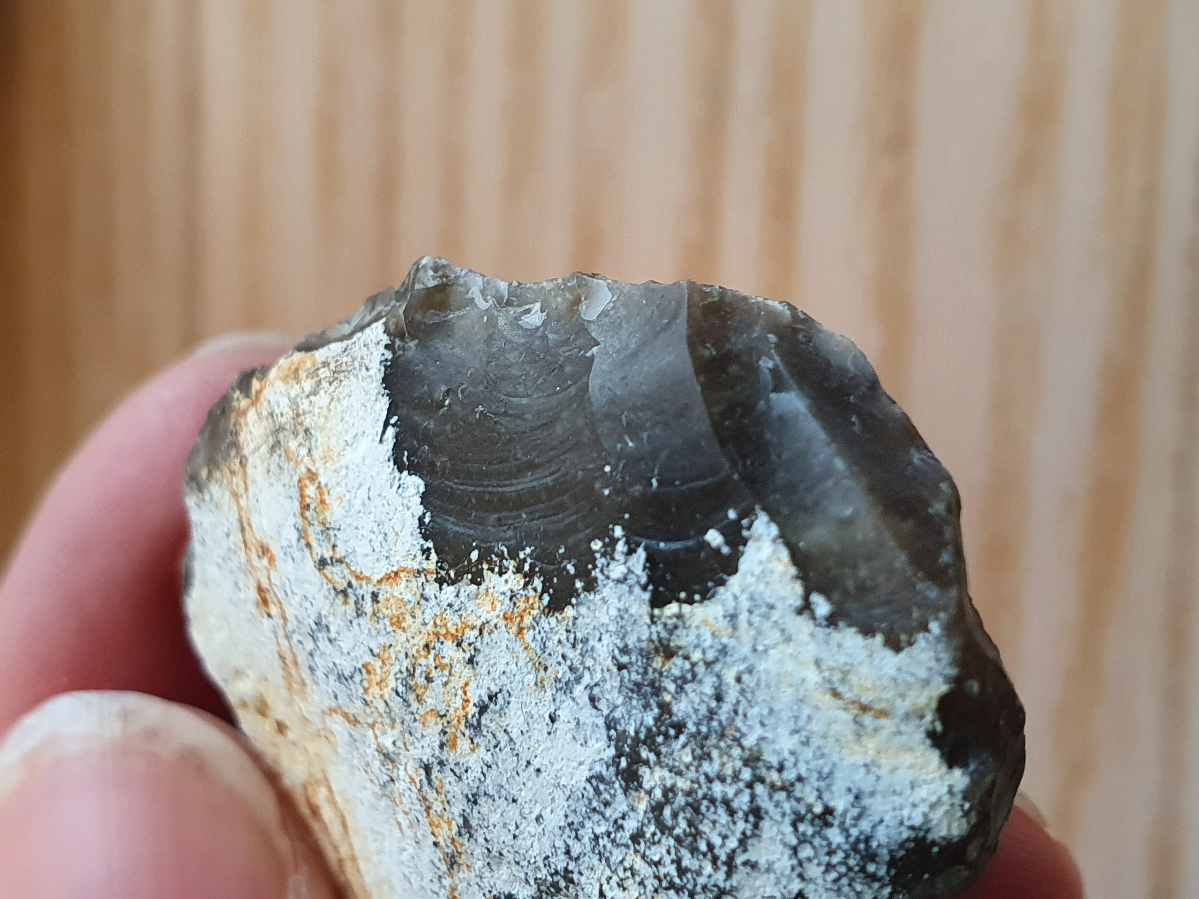 op de eerste 4 foto's zie je mooi hoe de slaggolven lopen, het stuk is van een andere steen afgekomen, Ik denk gezien de slaggolven en de andere beschadigingen, dat het geen door mensen afgeslagen stuk is, maar natuurlijk is ontstaan, het kan door botsing met andere stukken steen losgekomen zijn. Wellicht hebben anderen echter een andere mening.