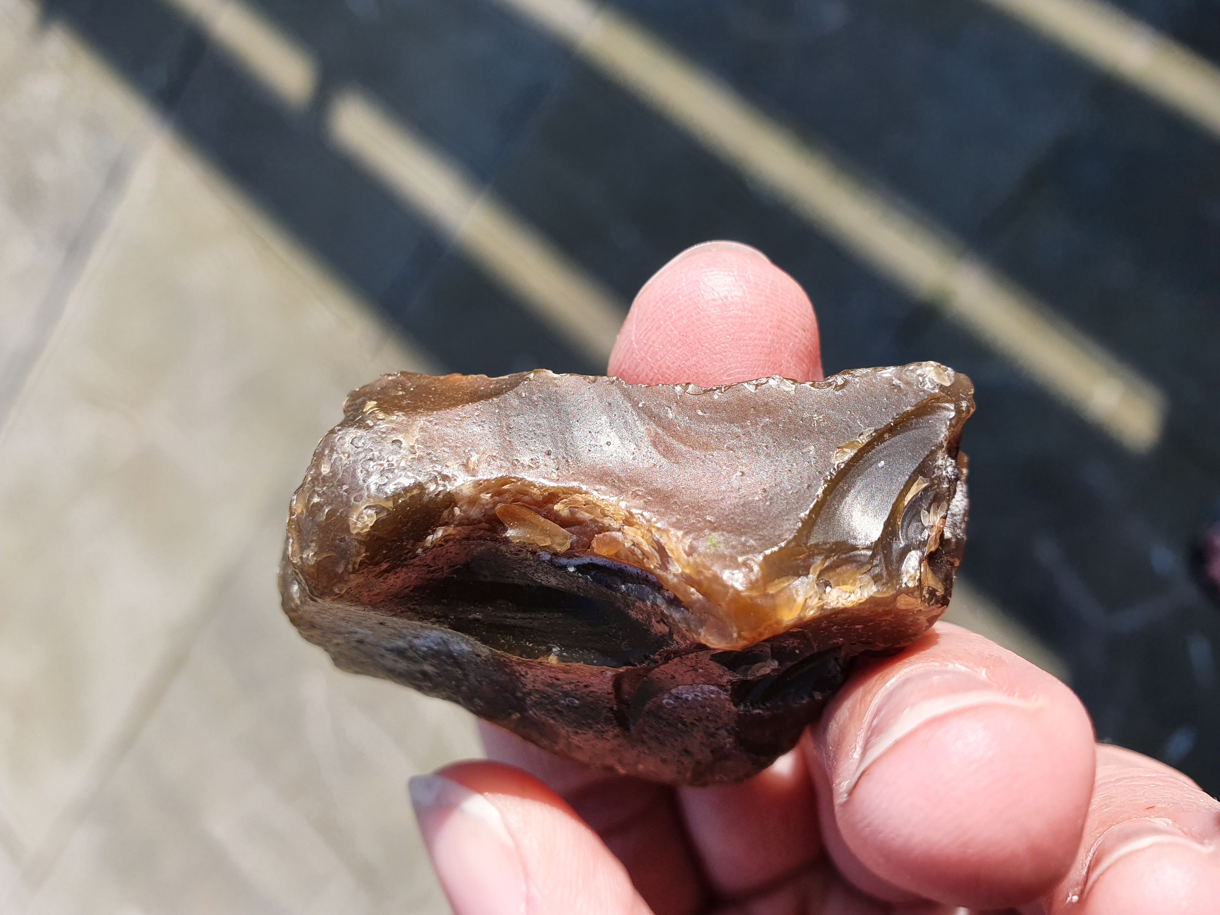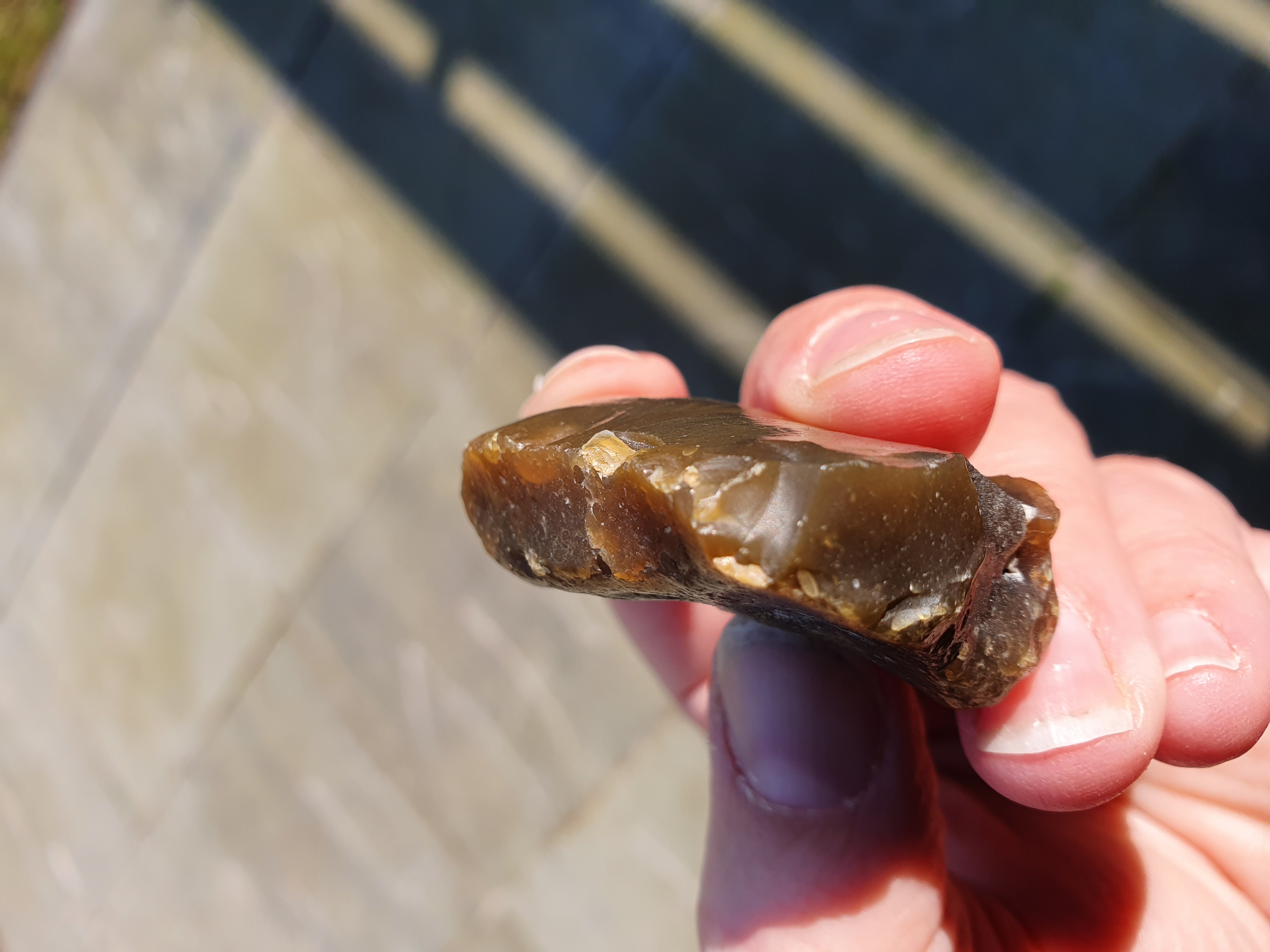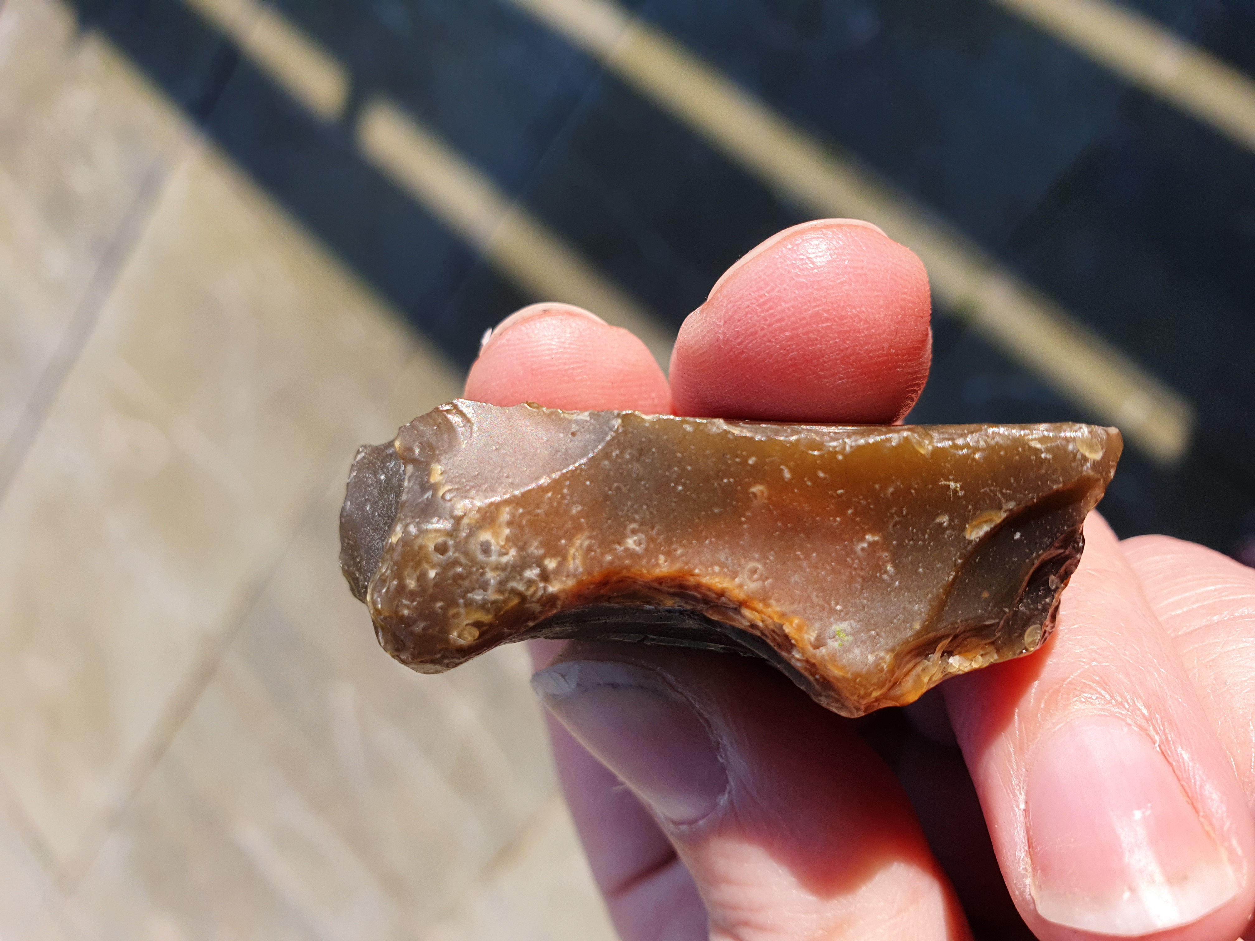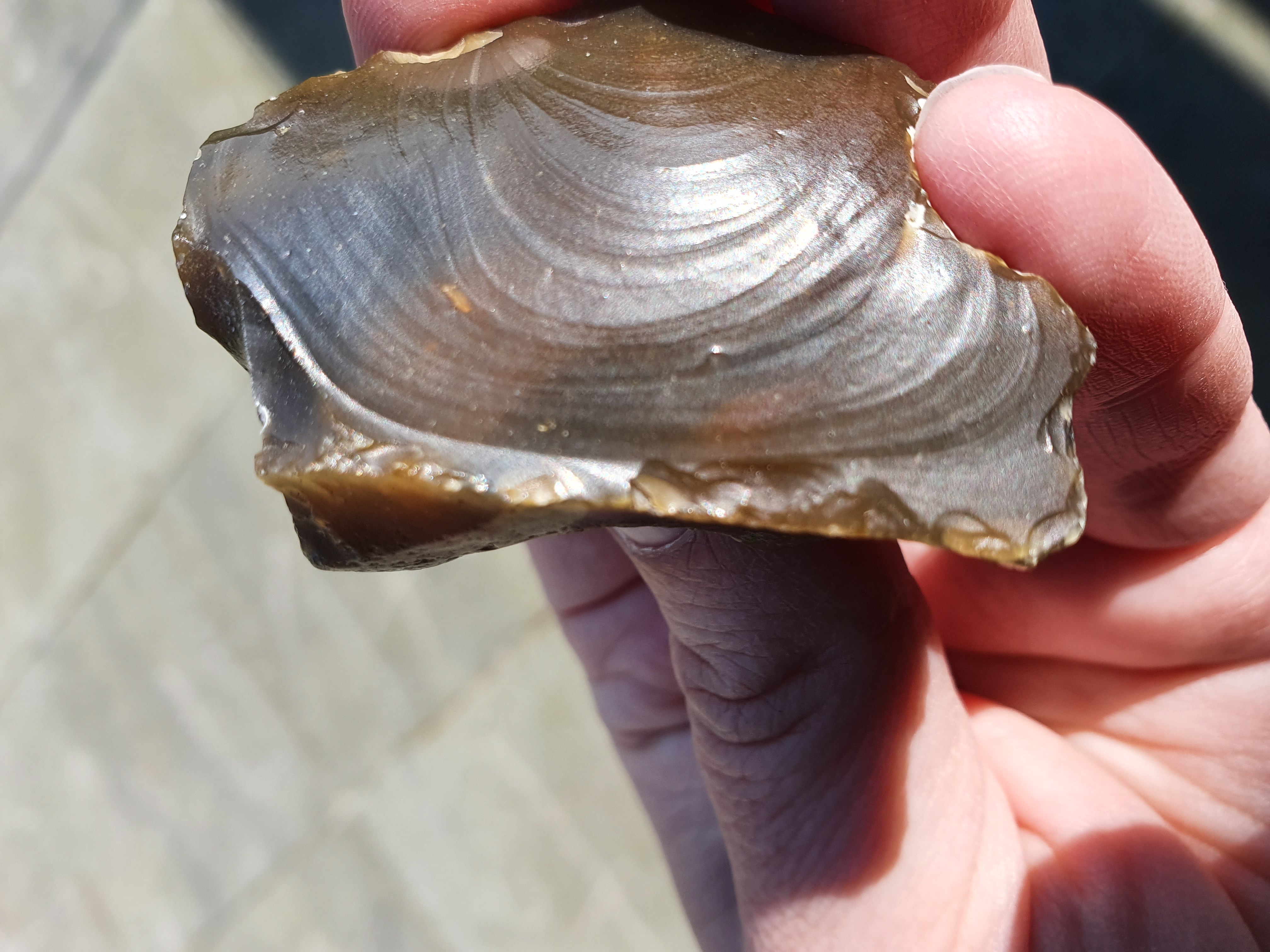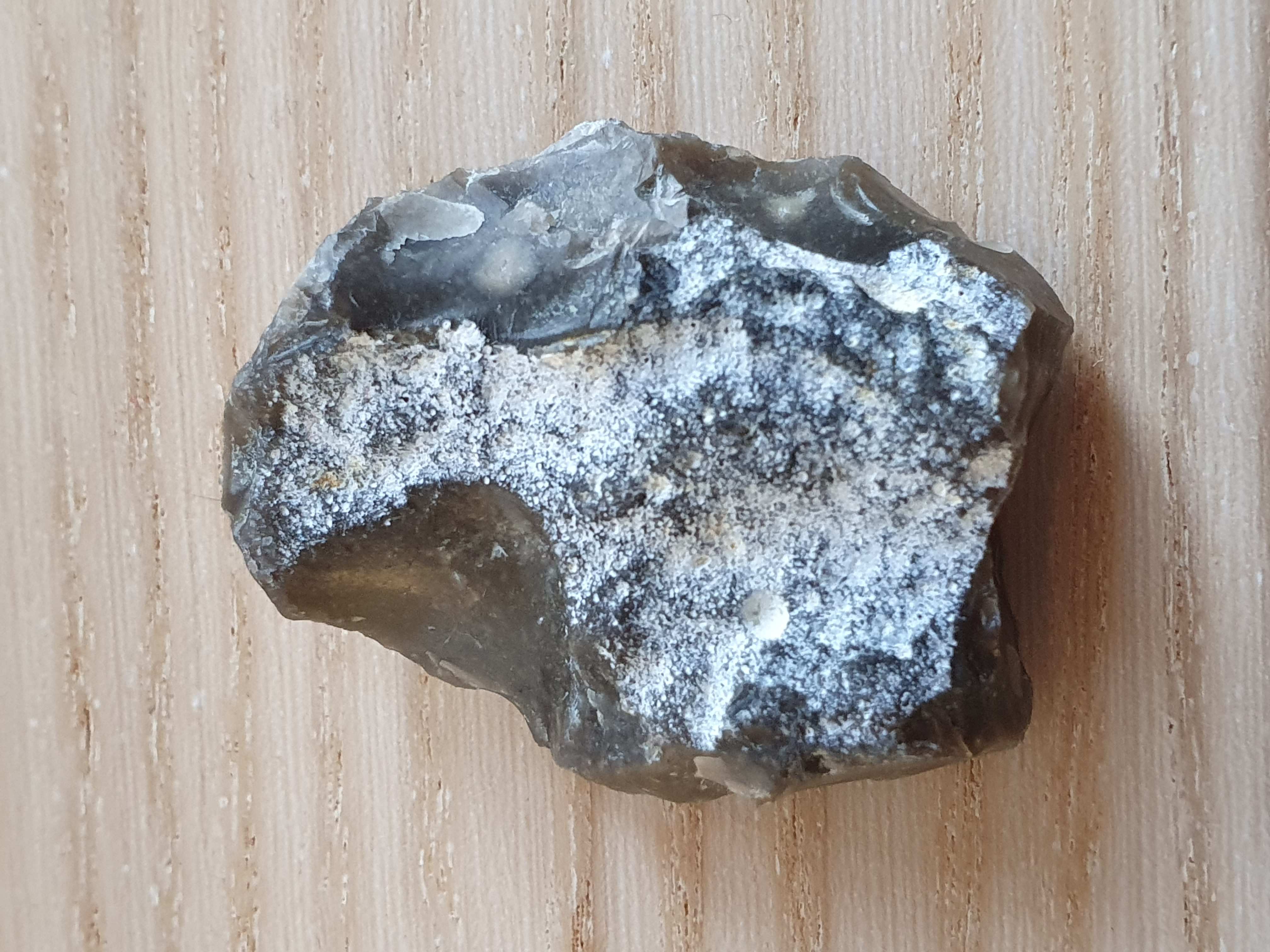 op de eerste 4 foto's zie je mooi hoe de slaggolven lopen, het stuk is van een andere steen afgekomen, Ik denk gezien de slaggolven en de andere beschadigingen, dat het geen door mensen afgeslagen stuk is, maar natuurlijk is ontstaan, het kan door botsing met andere stukken steen losgekomen zijn. Wellicht hebben anderen echter een andere mening.