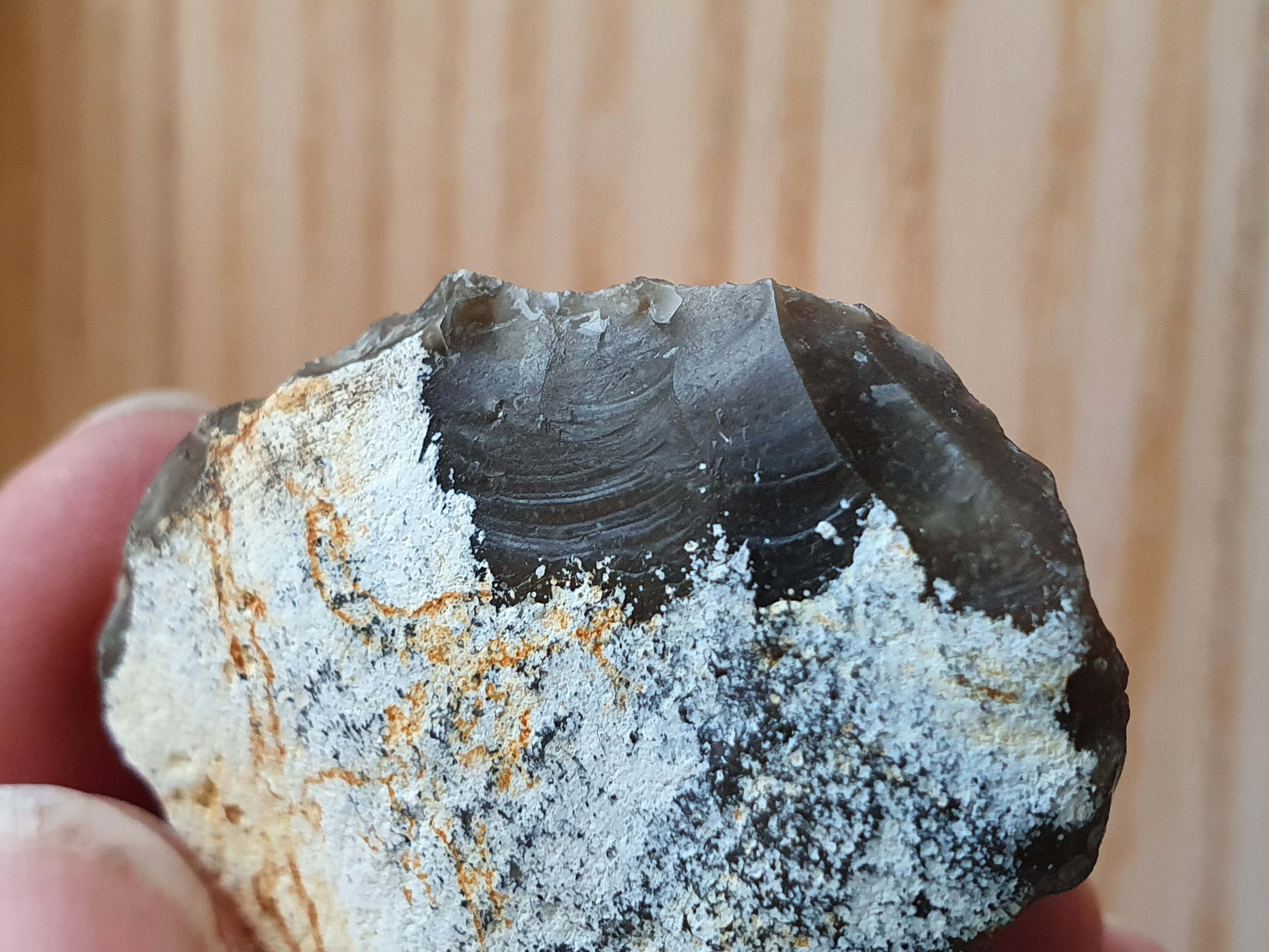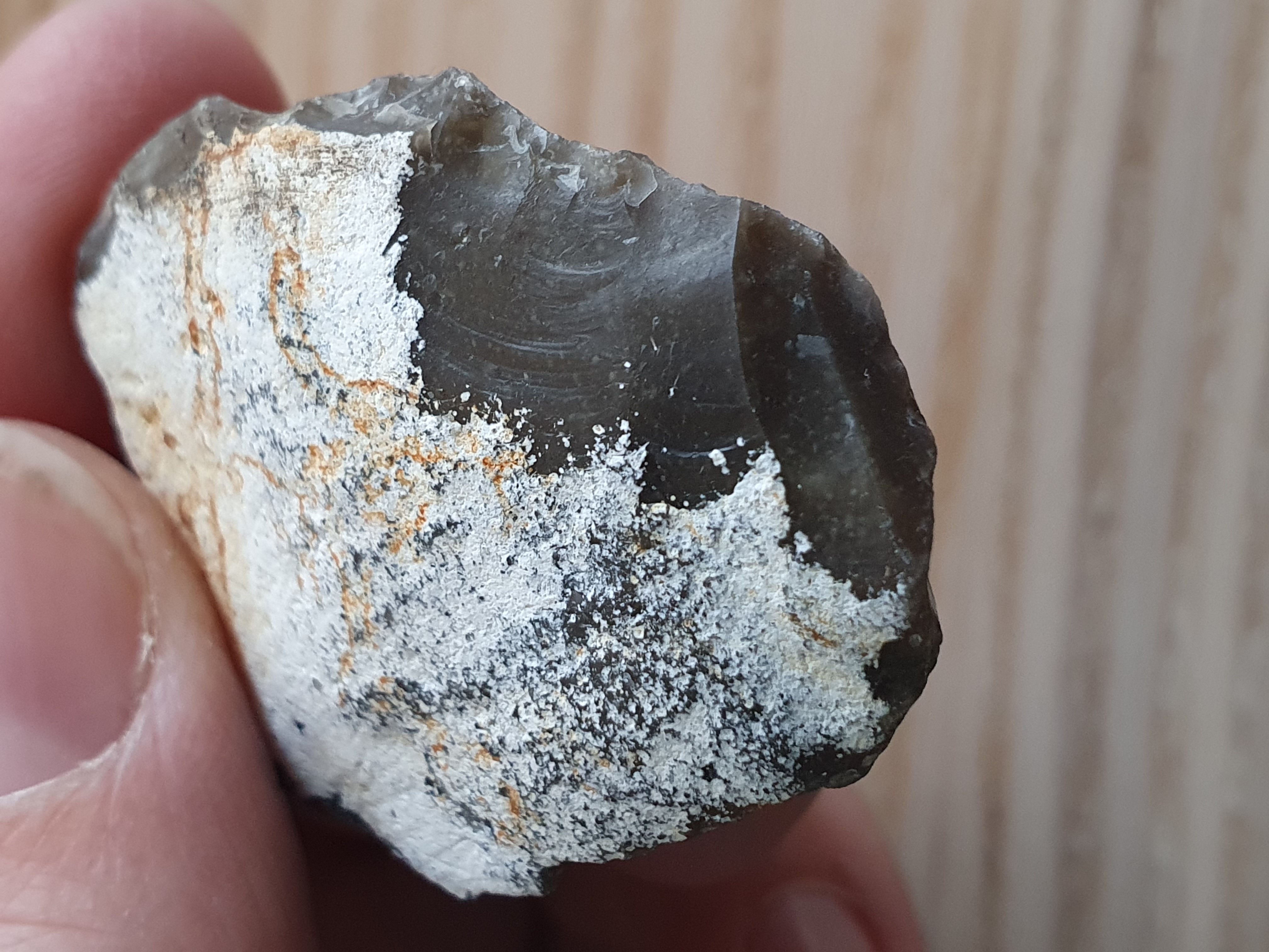 Gisteren raapte ik deze vuursteen. Tot de dag van vandaag heb ik nog geen steen gevonden die door mensen is bewerkt. Hoopvol post ik deze. Is er ooit iemand begonnen met bewerken en daar snel mee opgehouden? En zijn de roestkleurige afdrukken op de cortex nog iets?