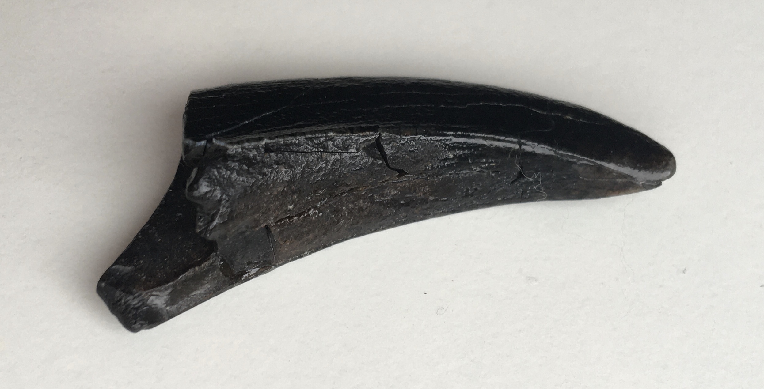 Hoektand roofdier, flink beschadigd, maar ik zou hem vergelijken met een hoektand uit de onderkaak van een hyena. Deze tand is nog driehoekig.