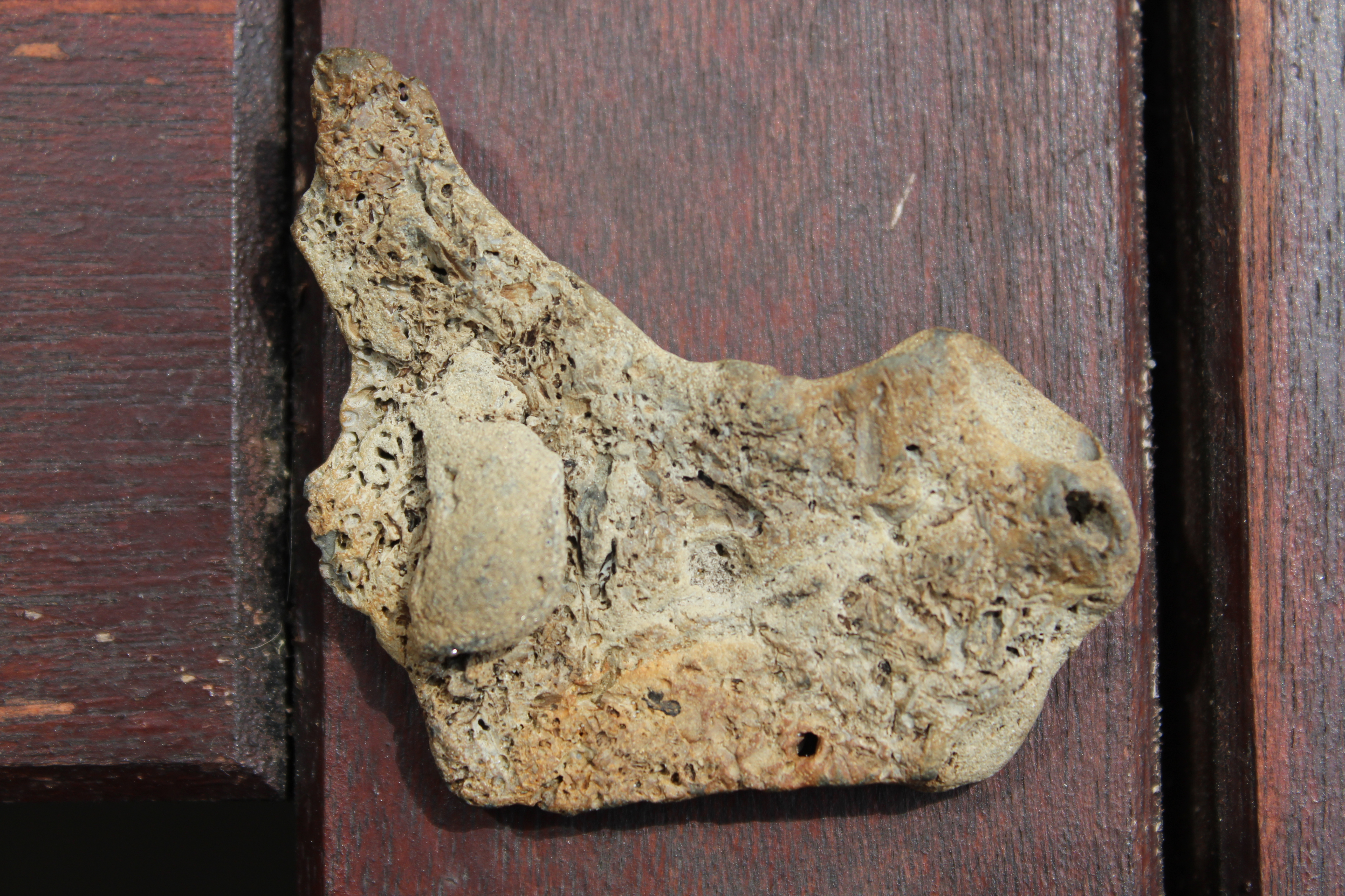 Het lijkt botstructuur maar het is een steentje. Volgens mij komt dit door borende schelpdieren iets dergelijks.