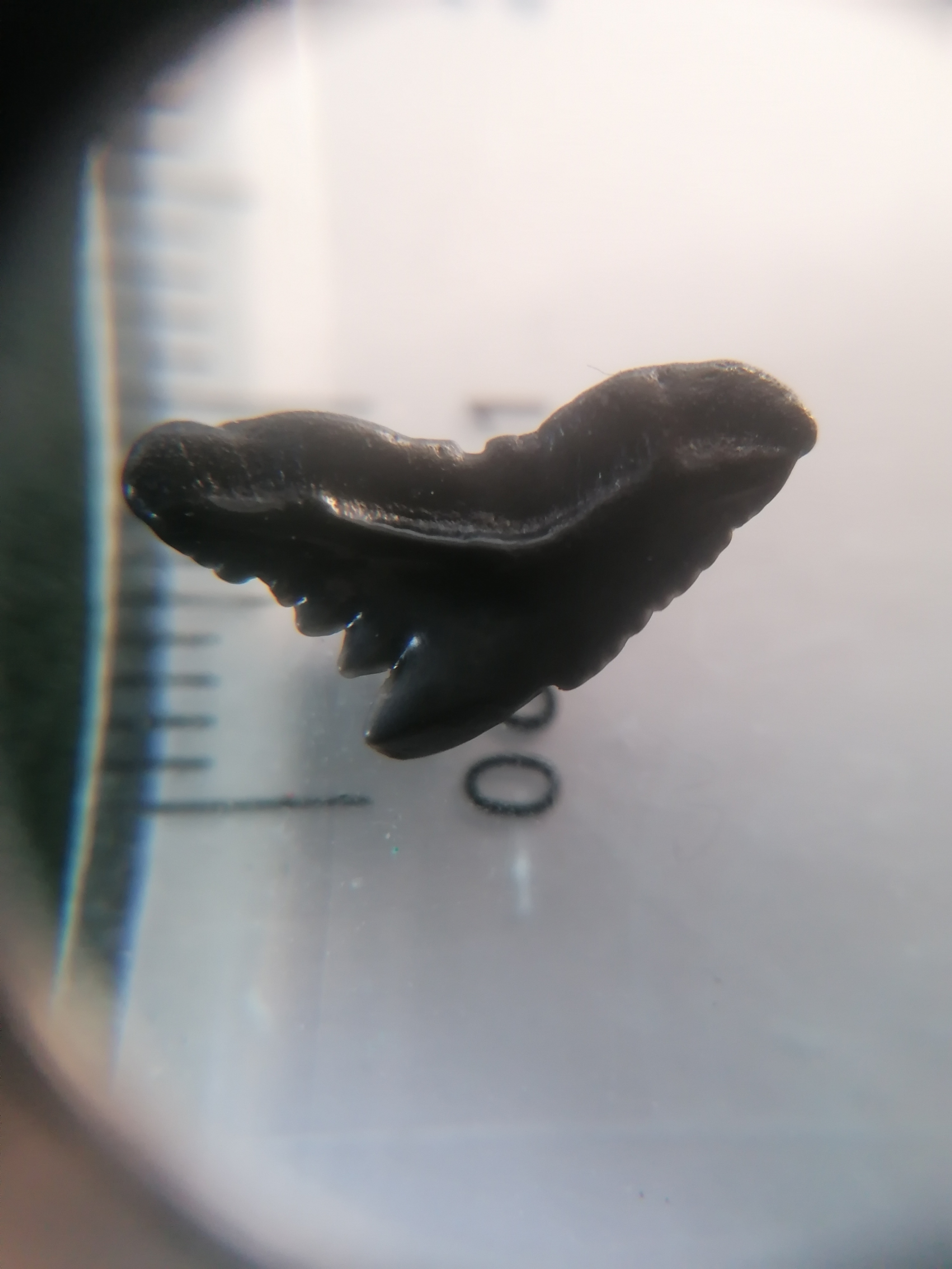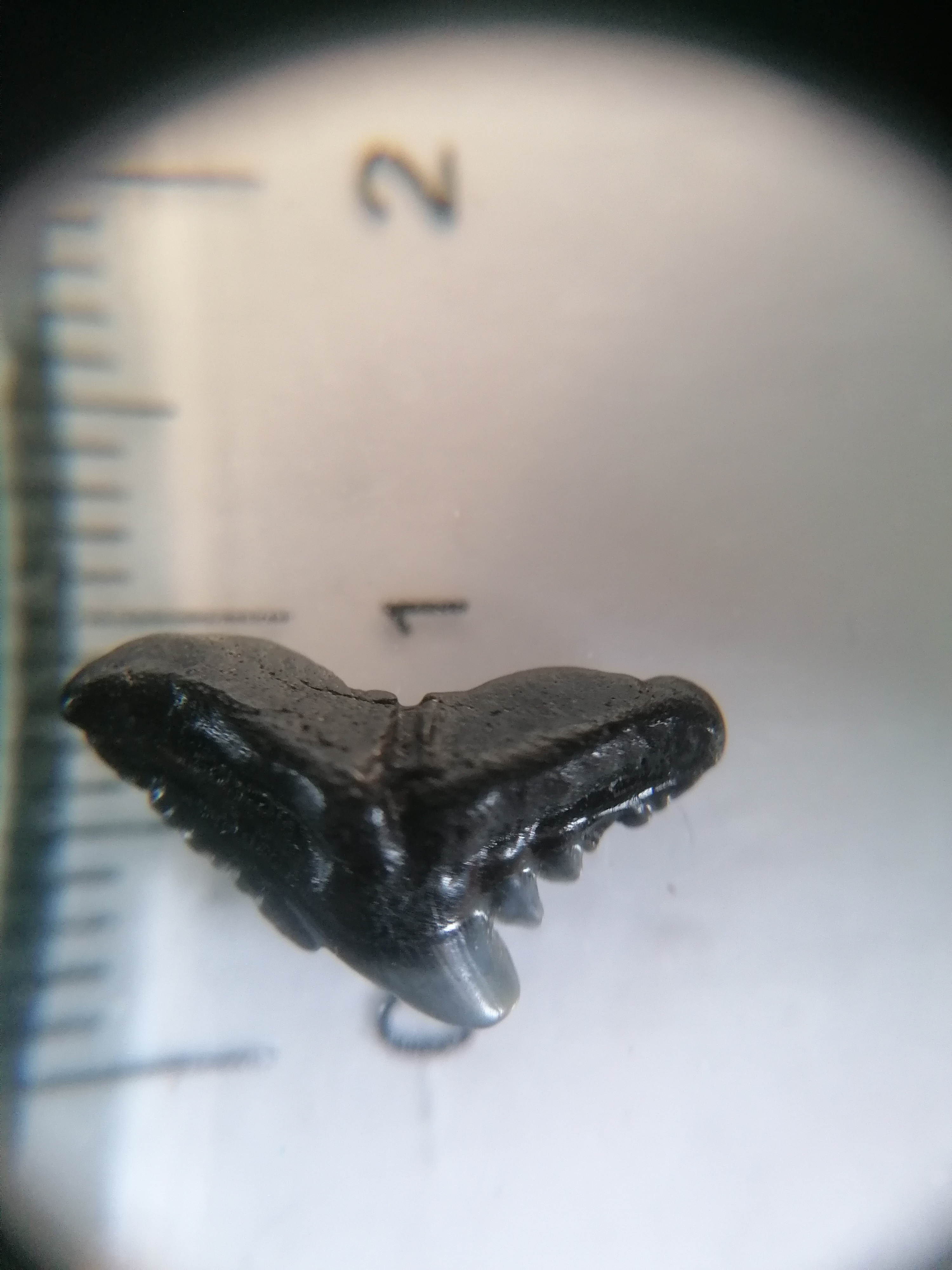 Het is of de eocene galeocerdo latidens of de oligocene physogaleus latus, maar ik krijg deze twee soms moeilijk uit elkaar gehouden. maar de bewaring suggereert toch een eocene tand, maar de vorm komt ook overeen met p. Latus. Wat het zo lastig maakt is dat de punt van de kroon is afgebroken en is gepolijst door de elementen. Lastig tandje.