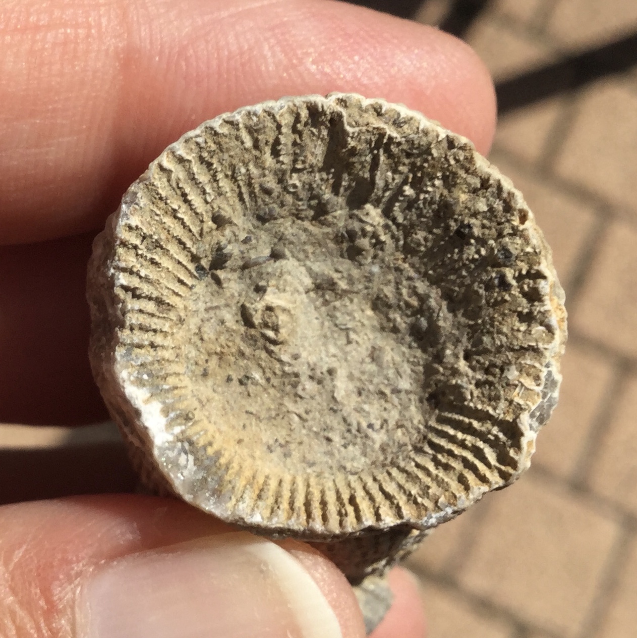 Het lijkt erg op het solitaire rugose koraal. Ik zie de ruwe buitenkant, de groeilijnen, bij dit exemplaar de schuine groei richting omdat ze in losse ondergrond groeiden en de septa. Als je goed kijkt zie je op de eerste foto rechts beneden een kleine beschadiging waar precies wat dissepiment zichtbaar is.