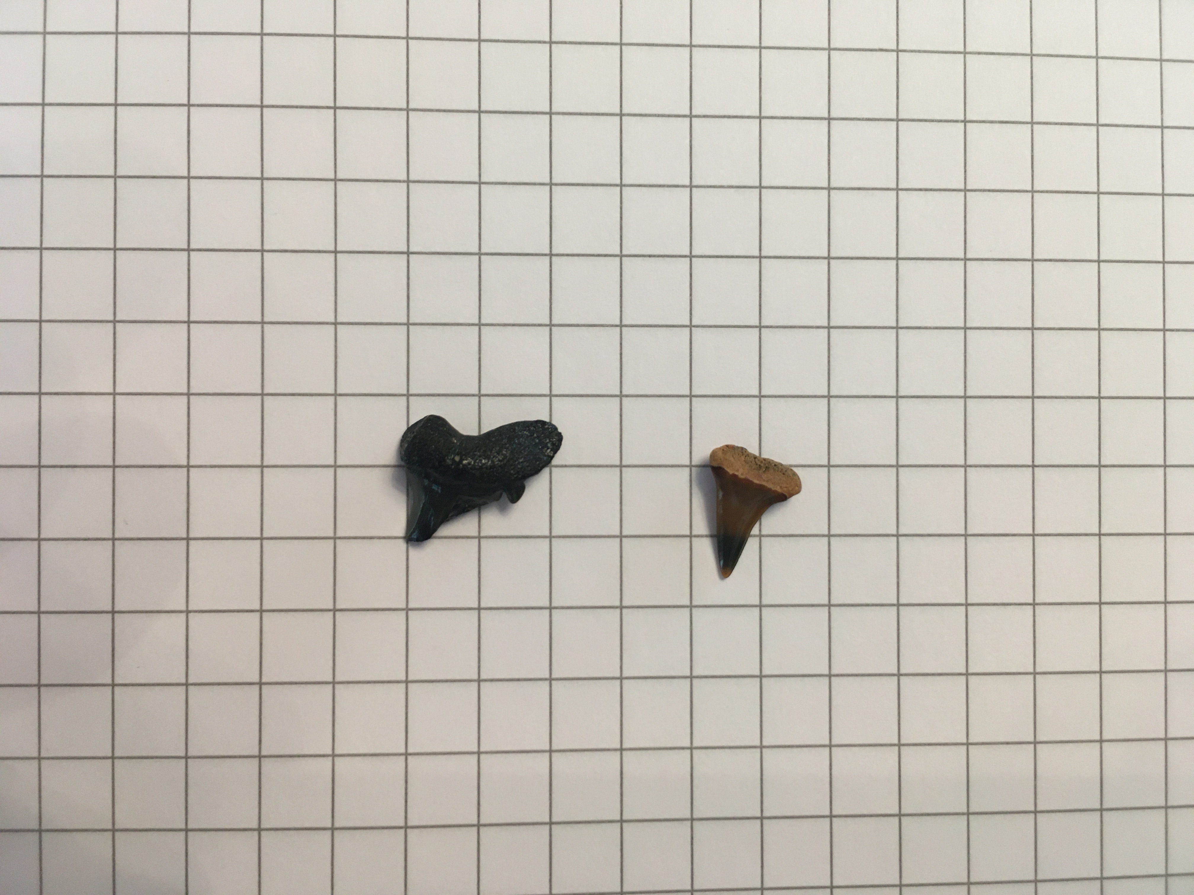 De bruine tand werd in een andere post door FossilDude al bepaald als Cosmopolitodus hastalis. Fascinerend om zo in detail te kunnen gaan bij zo'n klein tandje.