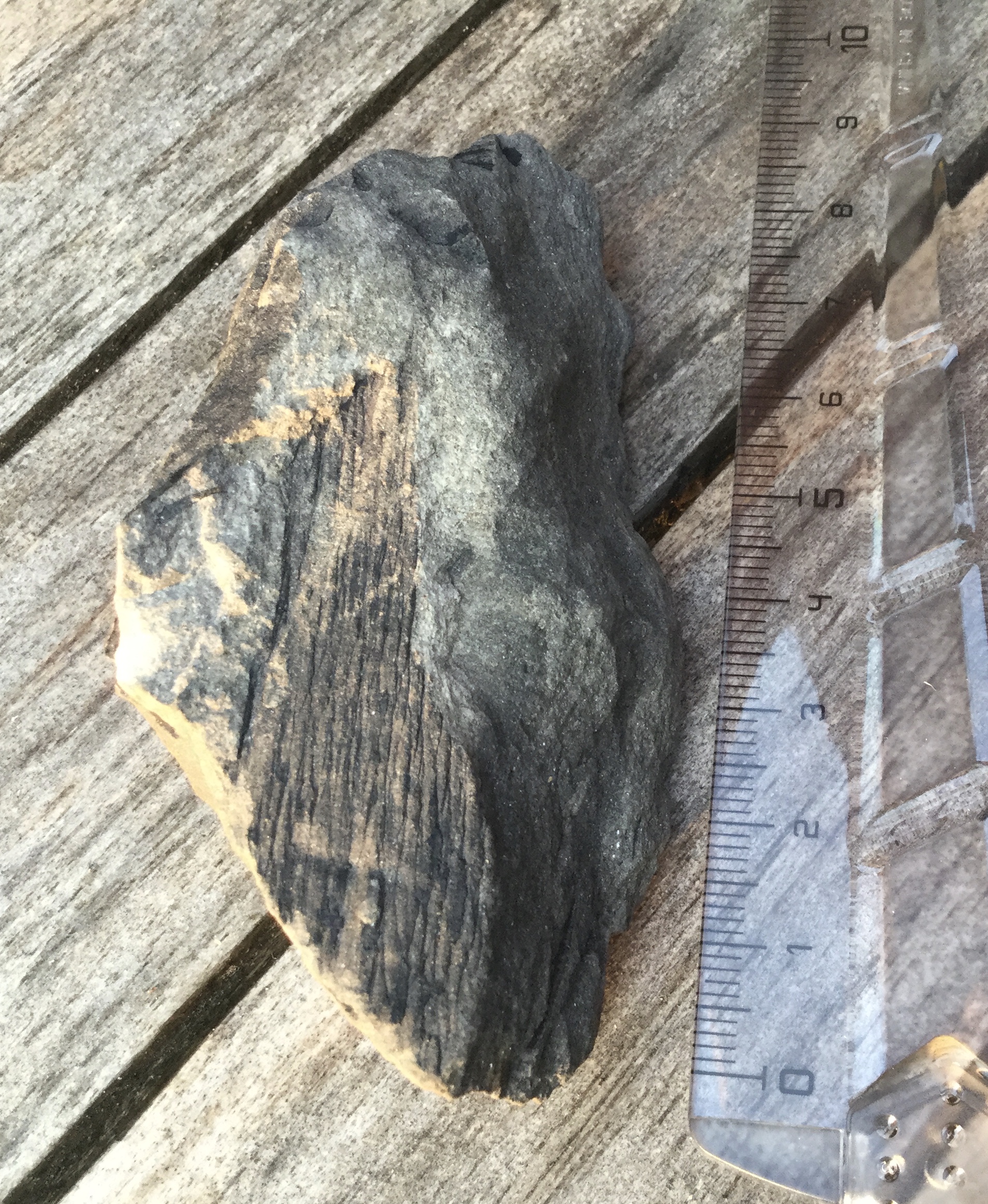 Aan de onderkant een stuk blad, ik denk Cordaites. Daarom dacht ik eerder een stukje Cordaites schors.