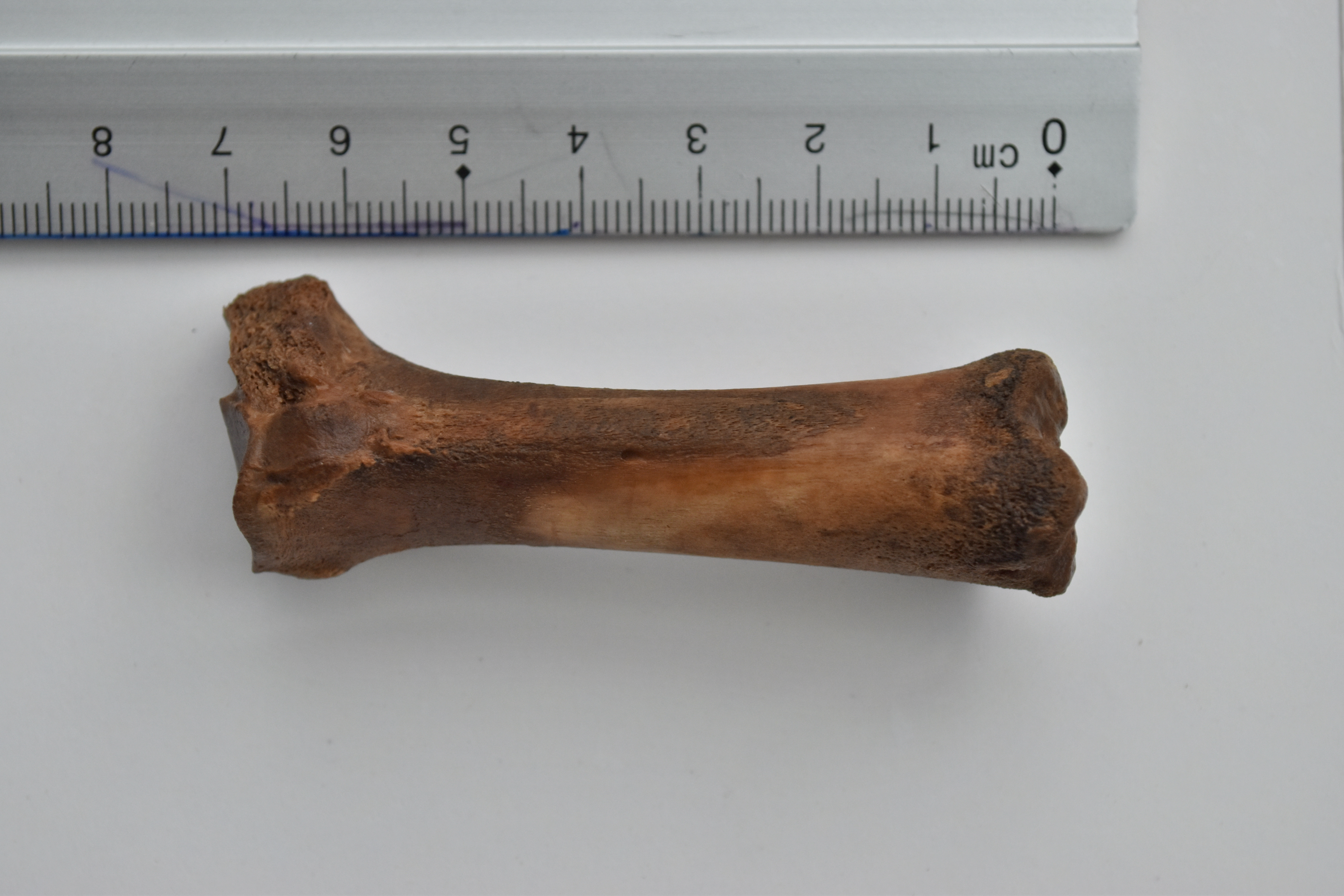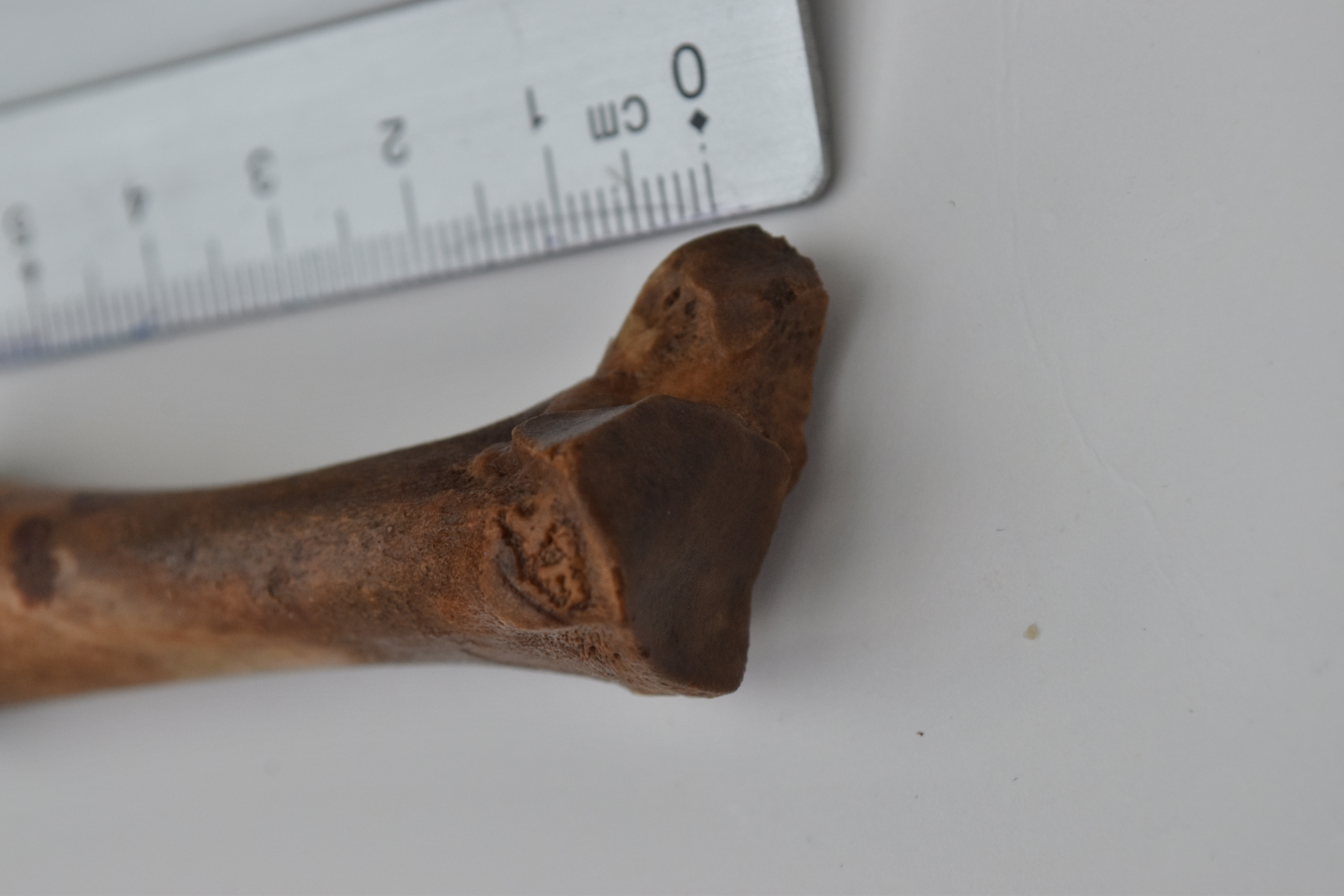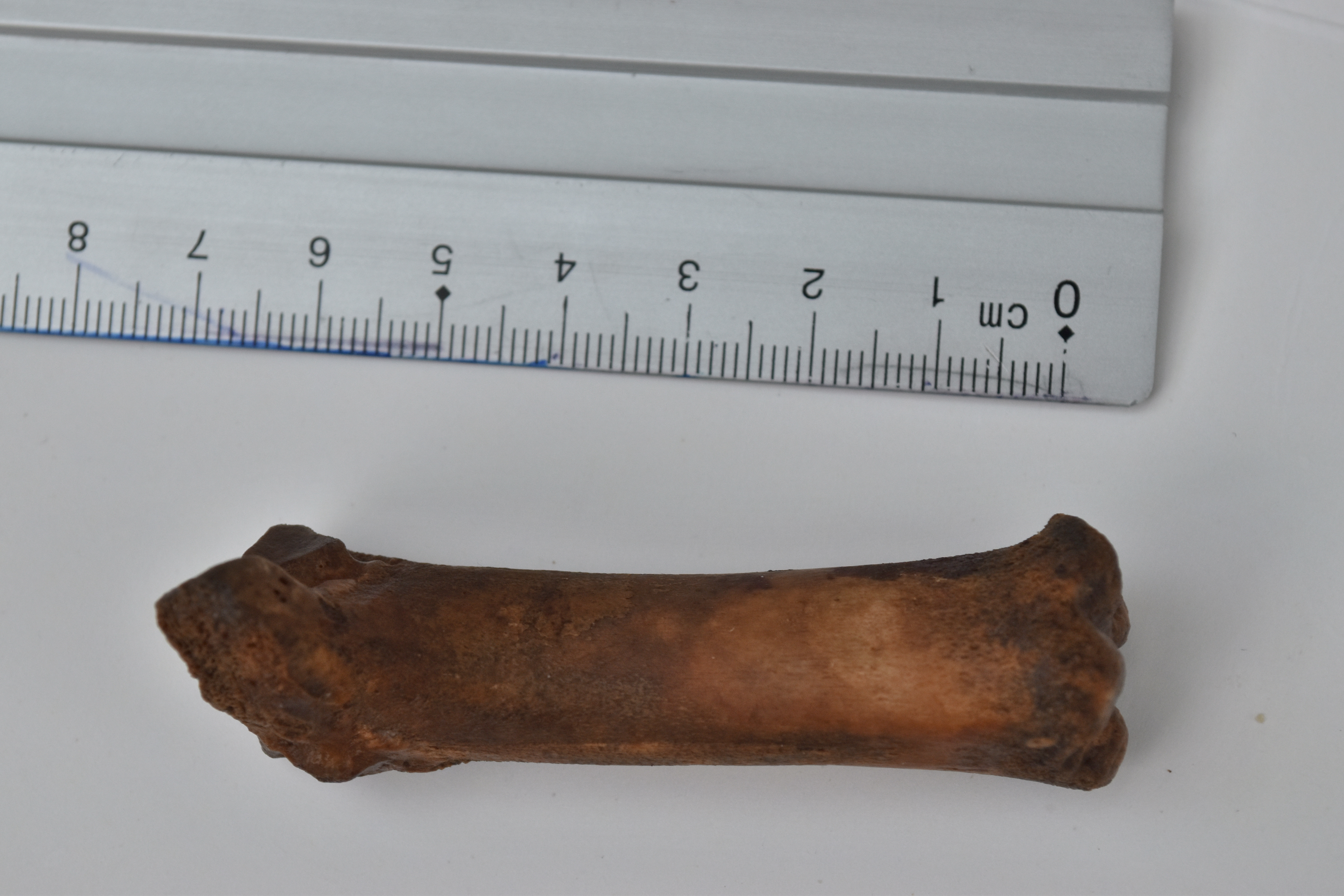 Het is zelfs nog een jong varken, de onderste epifyse ontbreekt. Verder nog een kaakje van een haas / konijn en het onderste deel van het dijbeen van een vogel.