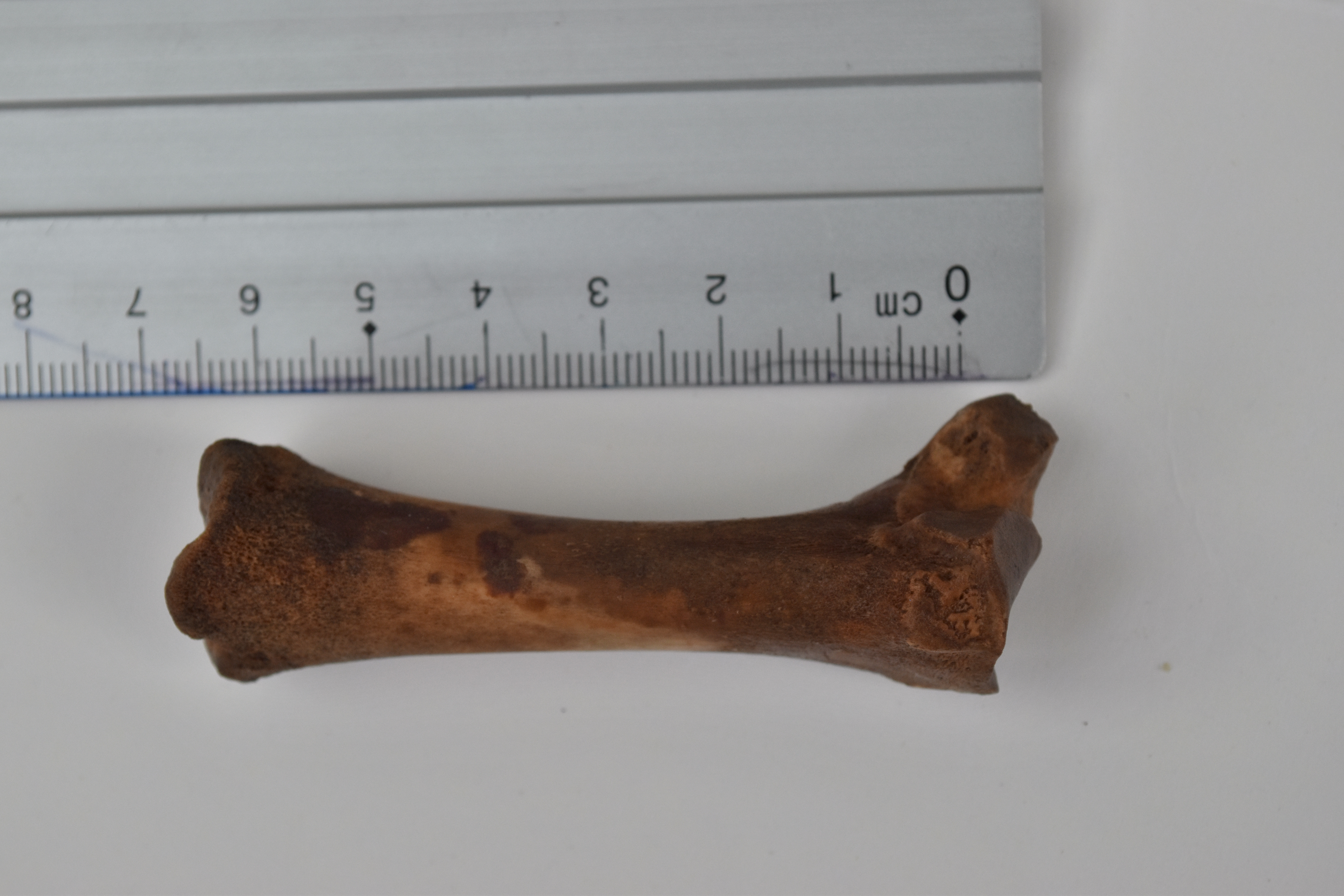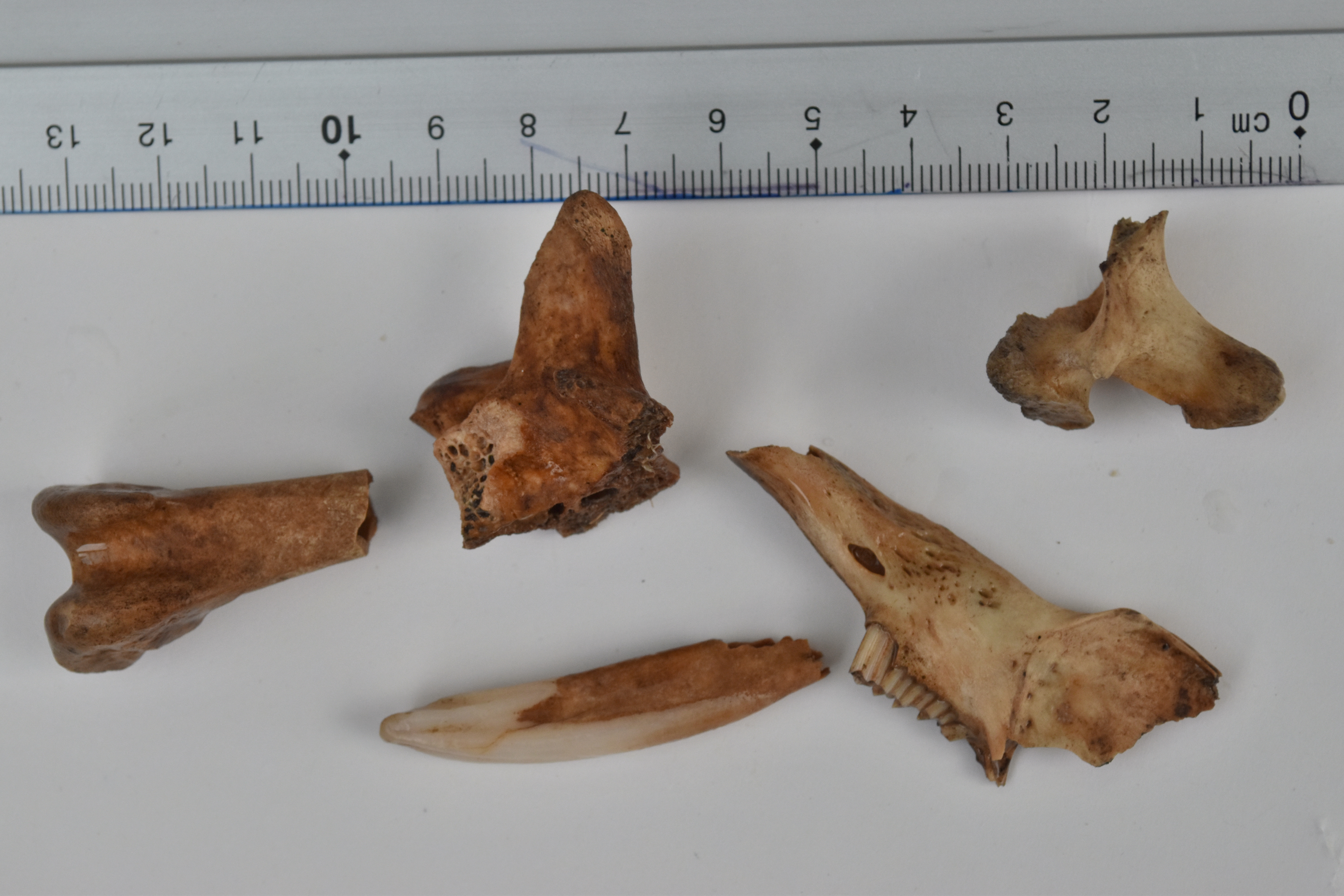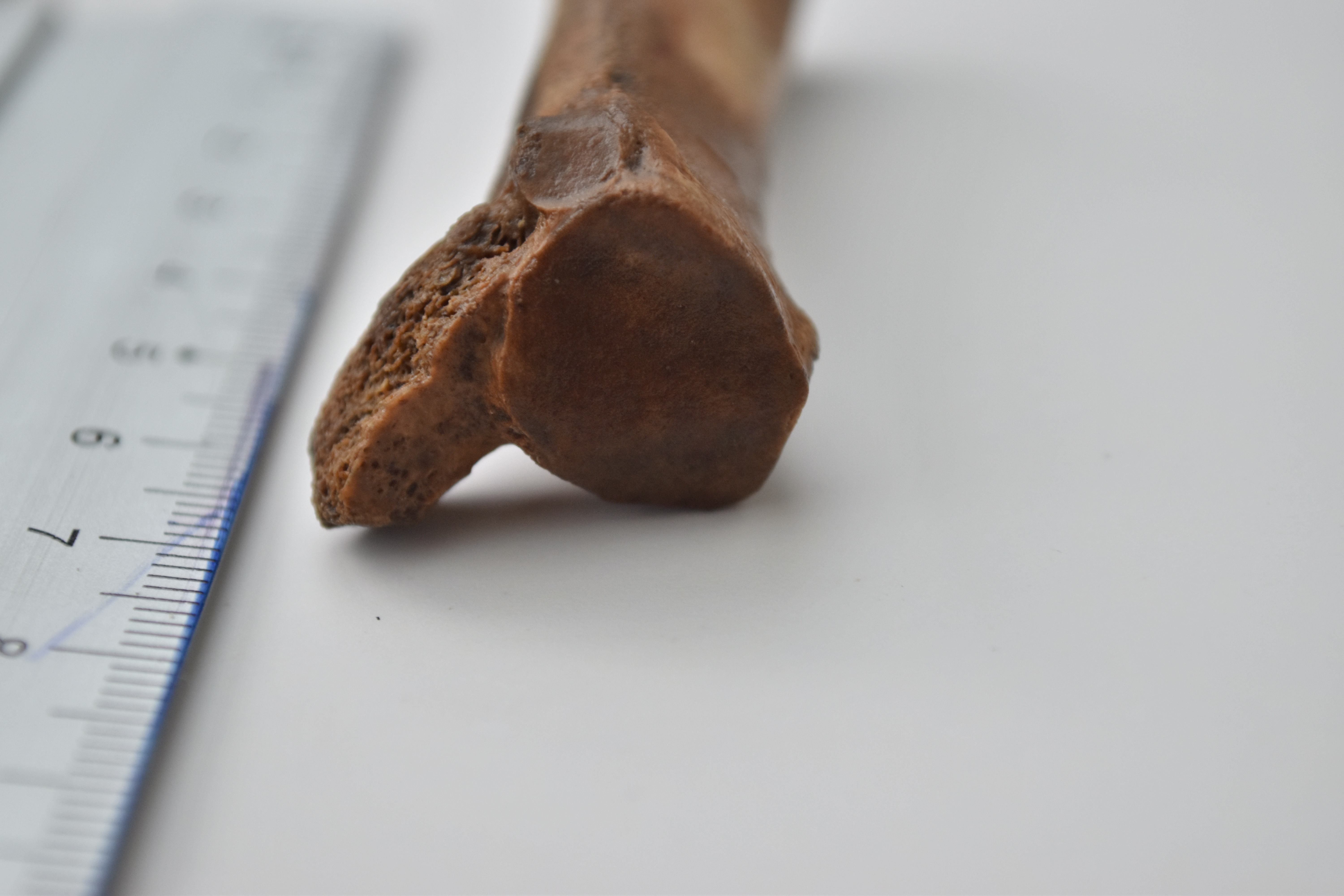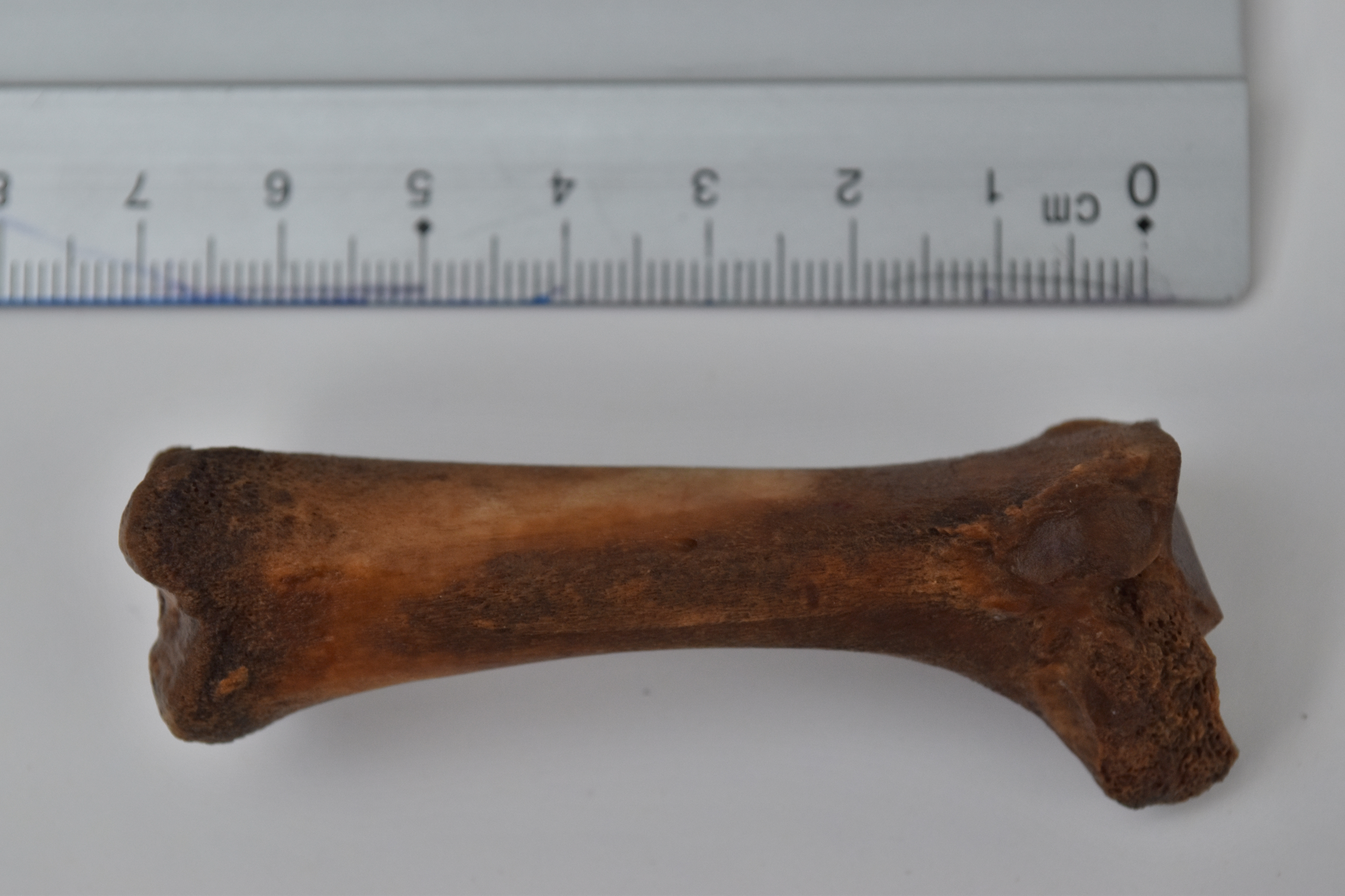 Het is zelfs nog een jong varken, de onderste epifyse ontbreekt. Verder nog een kaakje van een haas / konijn en het onderste deel van het dijbeen van een vogel.