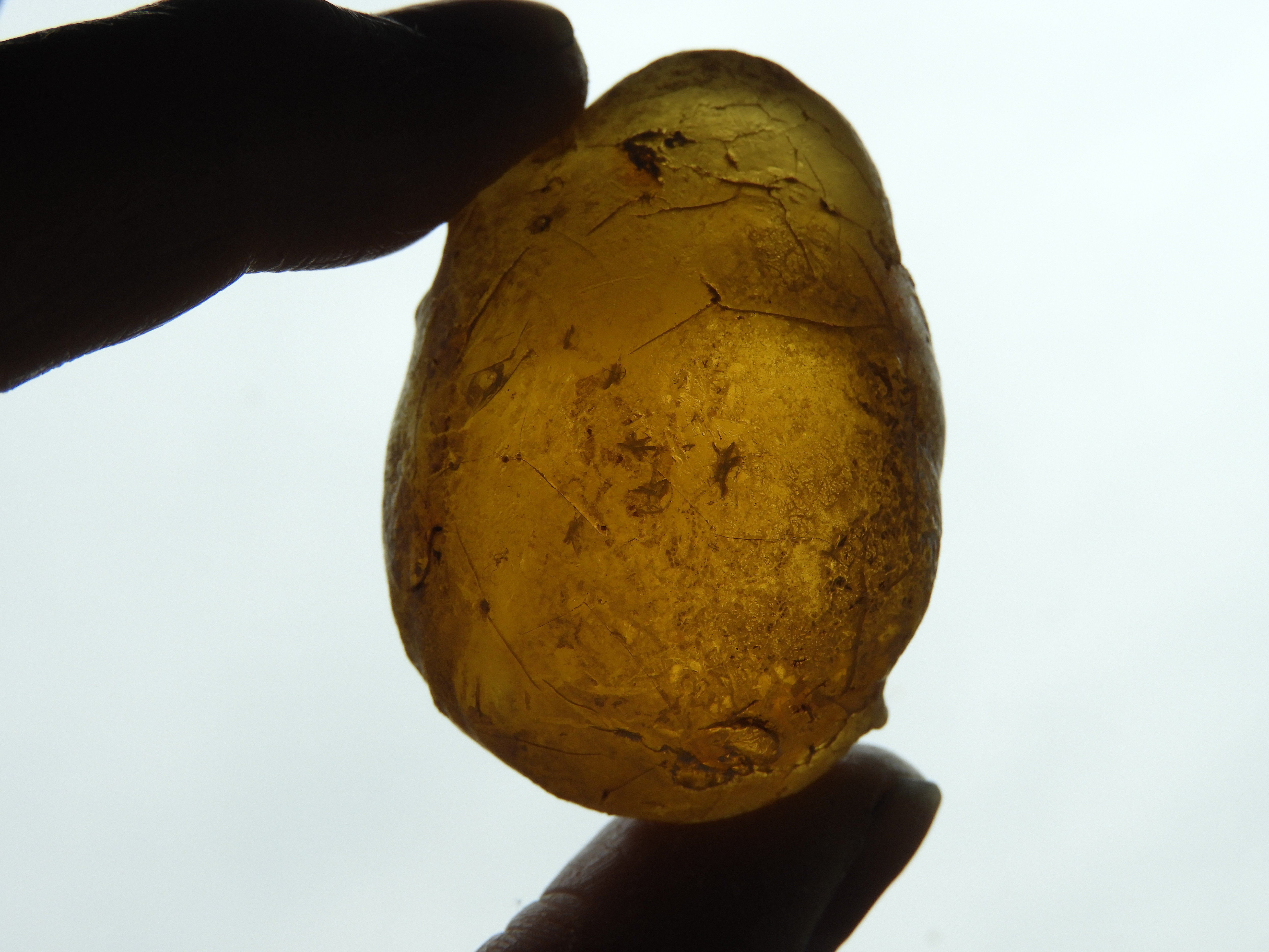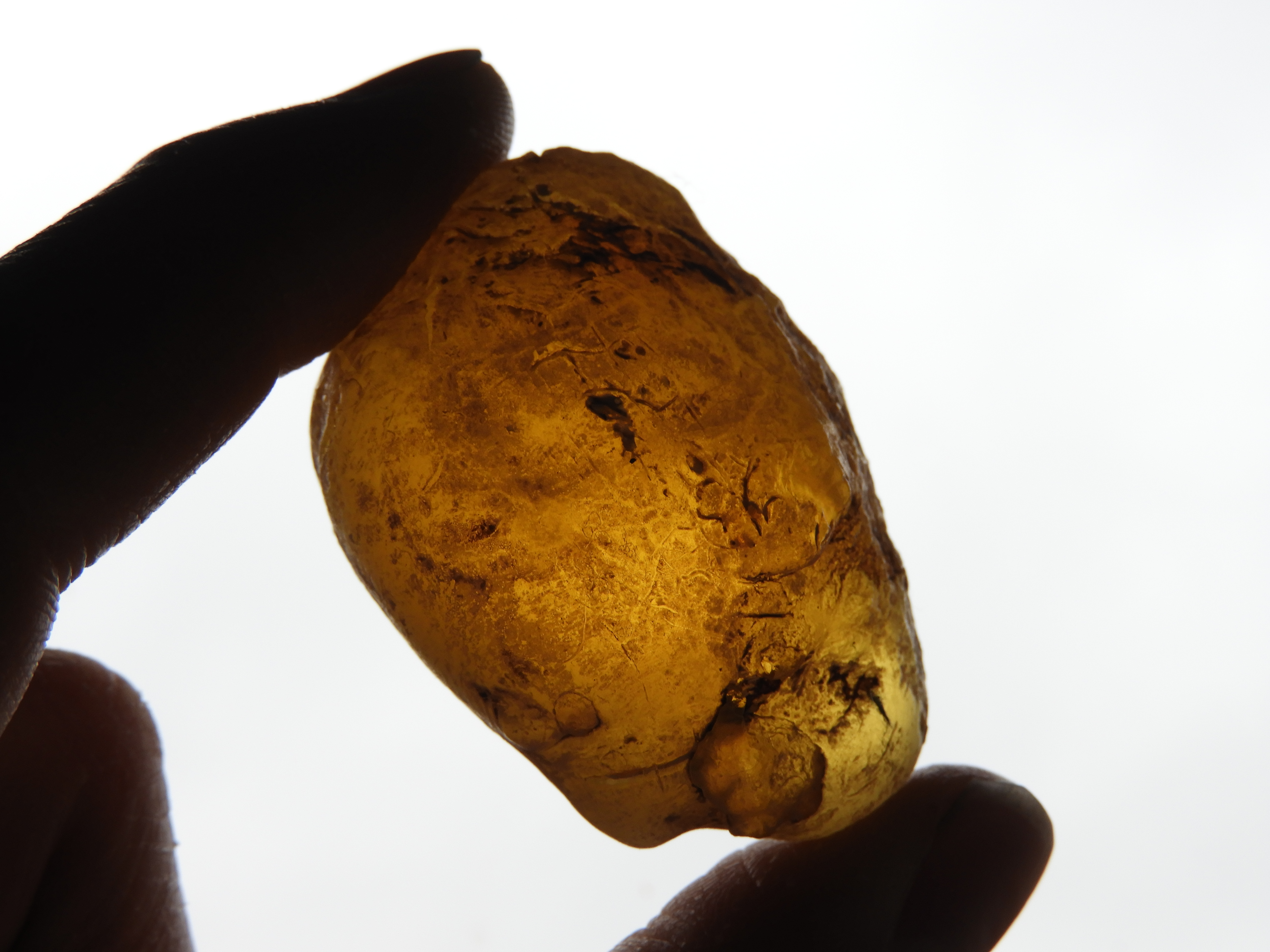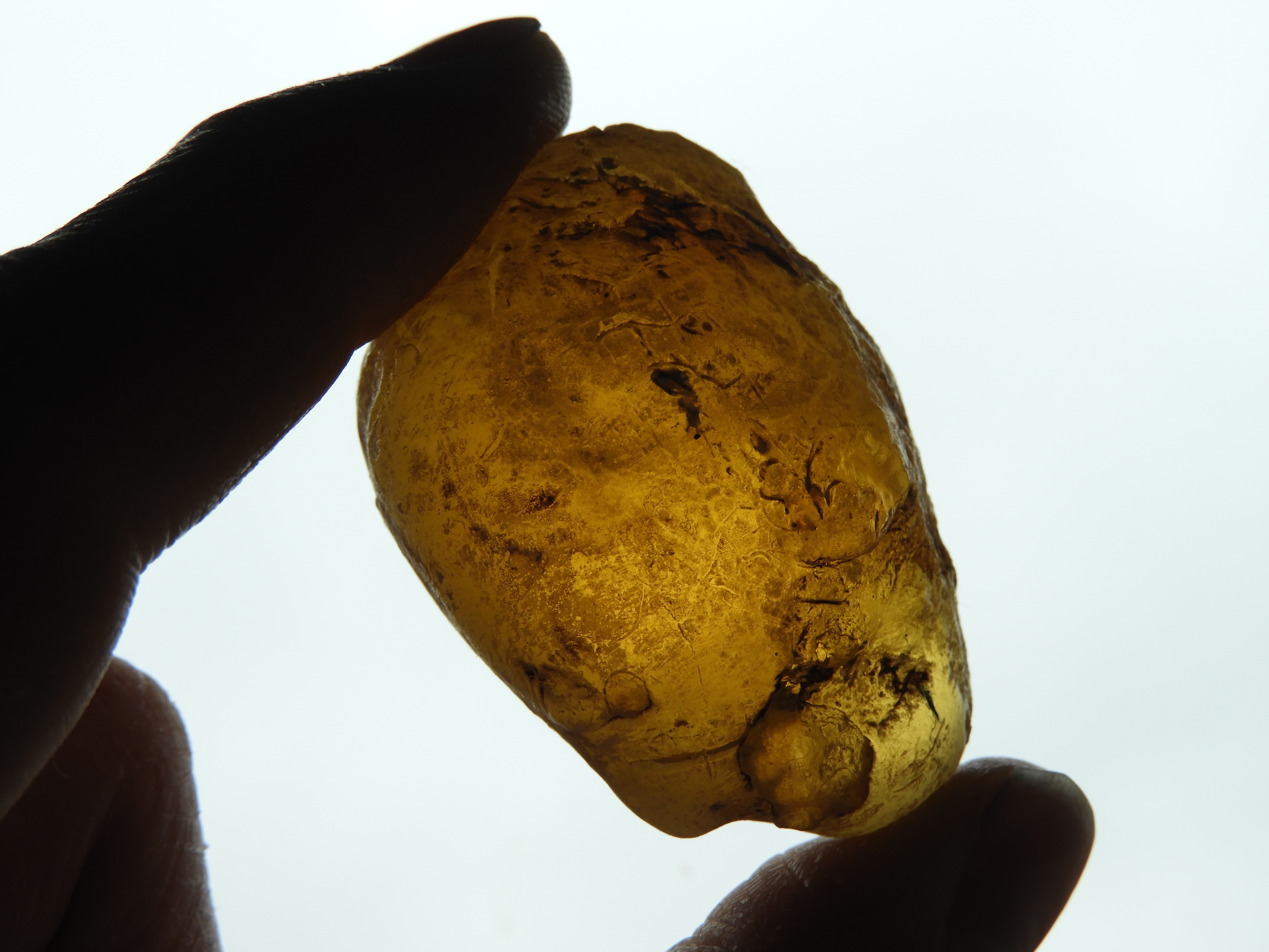 Toen ik laatst bij mijn tuinstenen, een bakje met vuurstenen, keek, zag in ineens dat deze 'steen' ertussen lag. Doordat de steen wat licht doorliet, heb ik in de zon kunnen zien dat het lichtgeel doorschijnend bleek te wezen. Ik was verrast, want ik dacht dat dit misschien wel een stuk copal zou kunnen zijn. Nadat ik de steen had schoongespoeld, was hij nog meer lichtdoorlatend. Vermoedelijk heb ik de steen een keer samen met de vuurstenen op een akker in de buurt van Hoogezand of Drenthe gevonden. Zou het hier om copal kunnen gaan? De steen voelt warm aan en hij klinkt hard als je ertegenaan tikt. Ook zijn bepaalde plekjes wat plakkerig/ kleverig. Ik ben benieuwd wat het is. De afmeting is 3,5 X 5 cm.