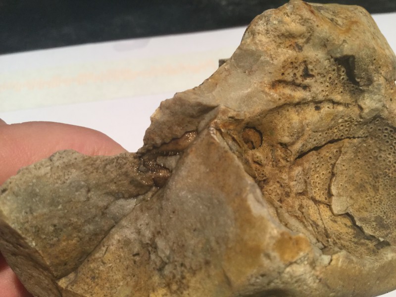 Maar er is ook nog een nieuwe ontwikkeling. Toen ik de teer van de steen had verwijderd zat er nog een verrassing in de steen. Geen idee wat het is, een diertje denk ik toch wel.