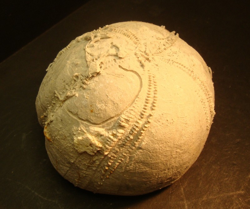 En als je er een afdruk van maakt (bv. met silicone), krijg je een goed beeld hoe de buitenkant van deze zee-egel er uitzag.