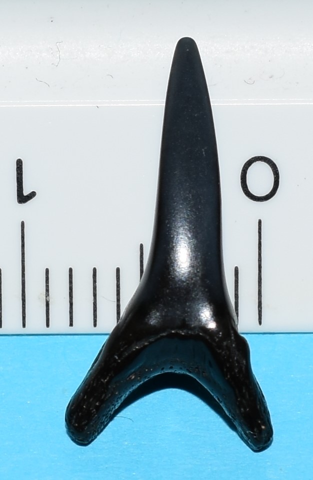 De tand heeft een afgesleten zijspits en bevat stria. De kroon is sterk gebogen (zie zijkant) en de wortel (waar de voedingsgroef zit) heeft een opvallende verdikking. De voedingsgroeve is goed zichtbaar via de schaduw op de foto van de bolle kant.