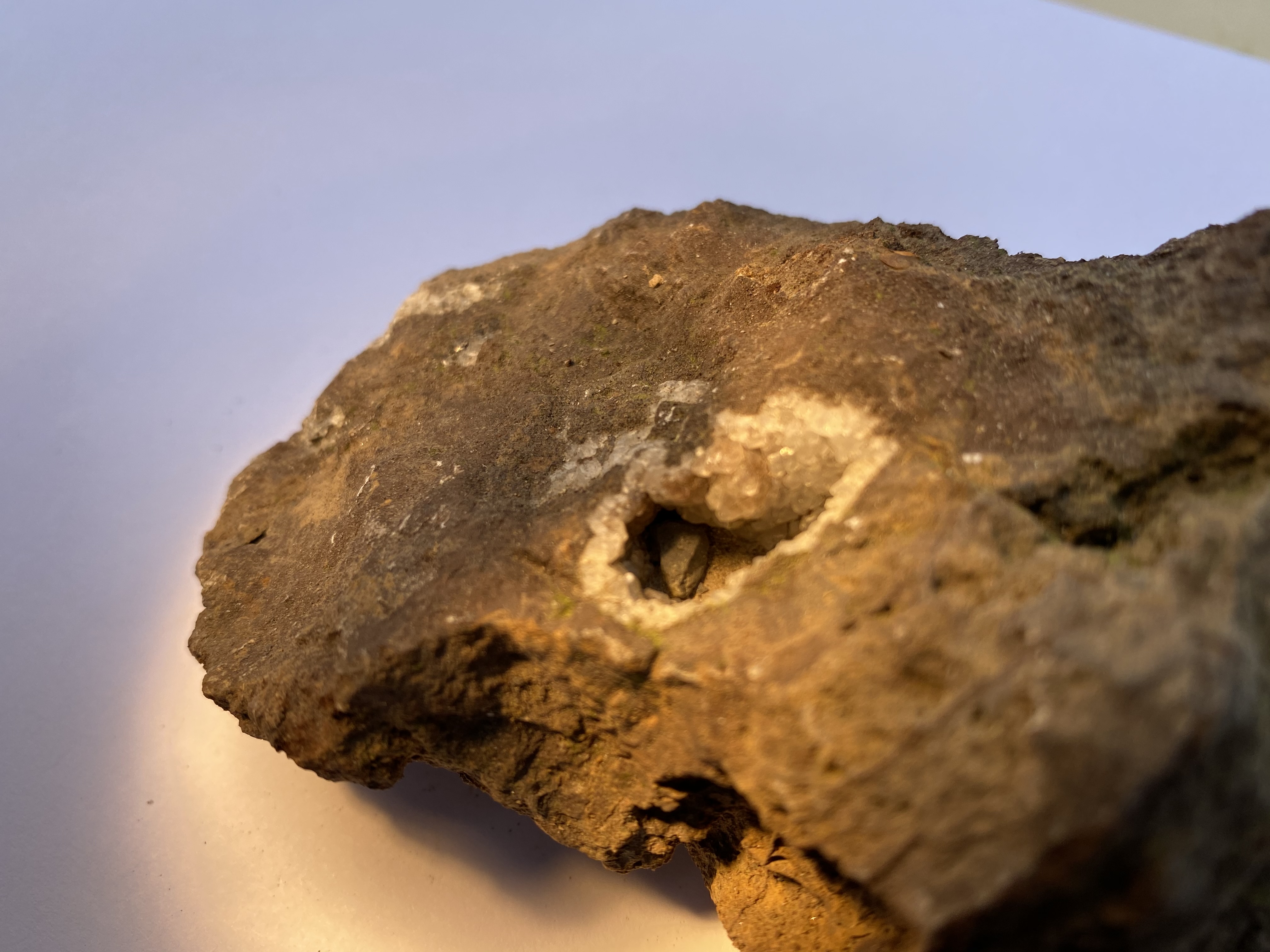 1 foto is van een mineraal. Volgens ons zit daar een grijs/zwart mineraal/kristal in.