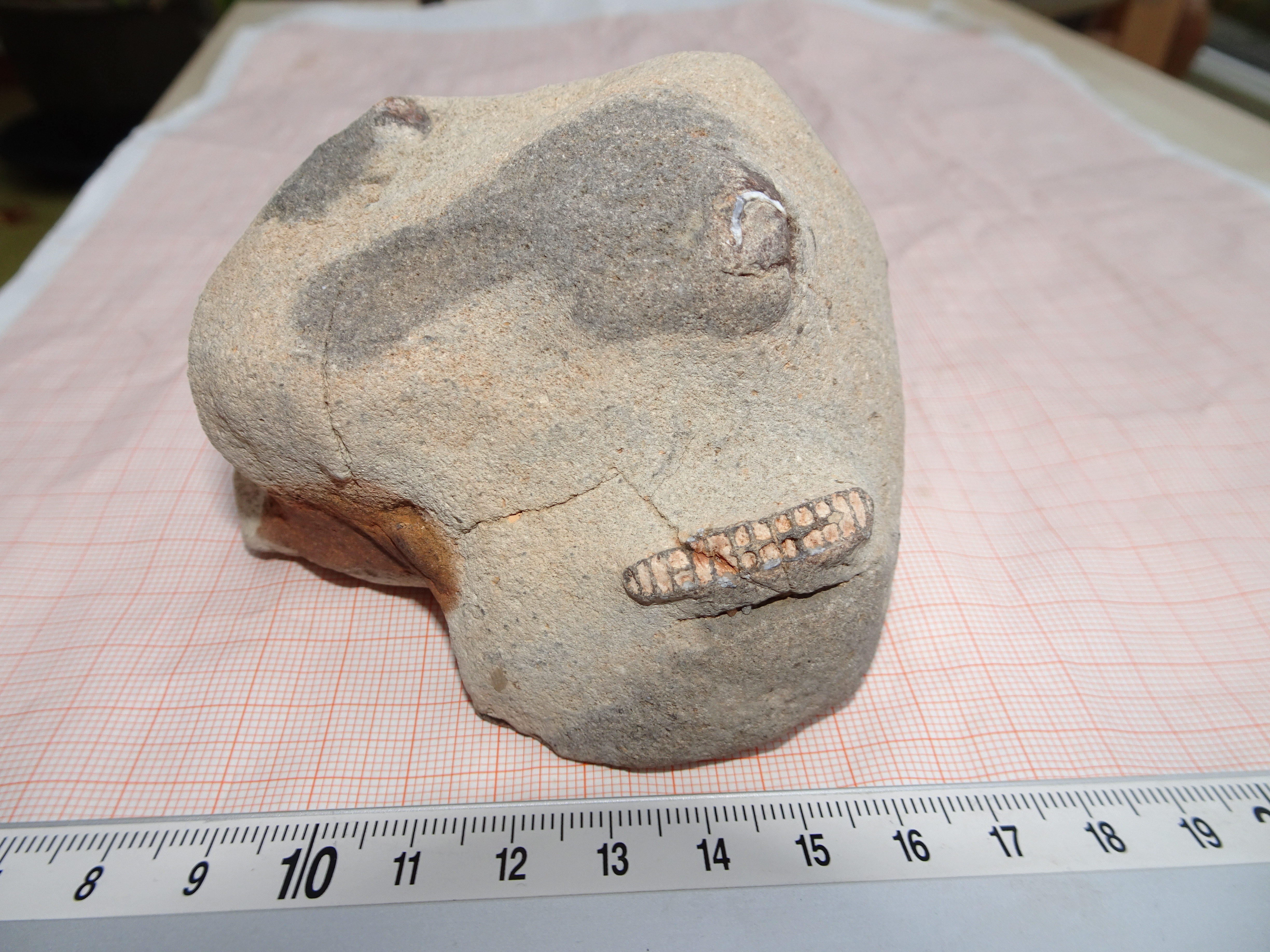 Deze steen heb ik opgeraapt op de 2e Maasvlakte. Behalve botten en kiezen uit het Pleistoceen zijn daar ook zwerfstenen (klein formaat) te vinden. Zo worden er onder andere af en toe Gryphaea's en koralen uit de Jura, en zeeëgels en sponzen uit het Krijt gevonden. Maar van bijgaand exemplaar (ik heb hem natuurlijk meegenomen voor het langwerpige fossiel met kamertjes, 26 x 5 mm) heb ik geen idee in welke richting ik het moet zoeken . Het lijkt wel een abstract kunstwerk, je kunt er een soort gezicht in zien. Het gesteente is vrij zwaar en compact, behoorlijk kalkhoudend, heeft een fijne korrelstructuur, maar geen gelaagdheid. Ik zou zelfs niet gek staan te kijken als het als iets "man-made" zou worden ontmaskerd, maar aan de andere kant lijkt het ook weer niet op iets beton-achtigs. Het ligt natuurlijk voor de hand om het - al dan niet vermeende - fossiel er uit te prepareren/hakken, maar er loopt precies een barst doorheen, dus ik hik daar een beetje tegenaan. Heeft iemand van jullie een idee wat dit zou kunnen zijn?