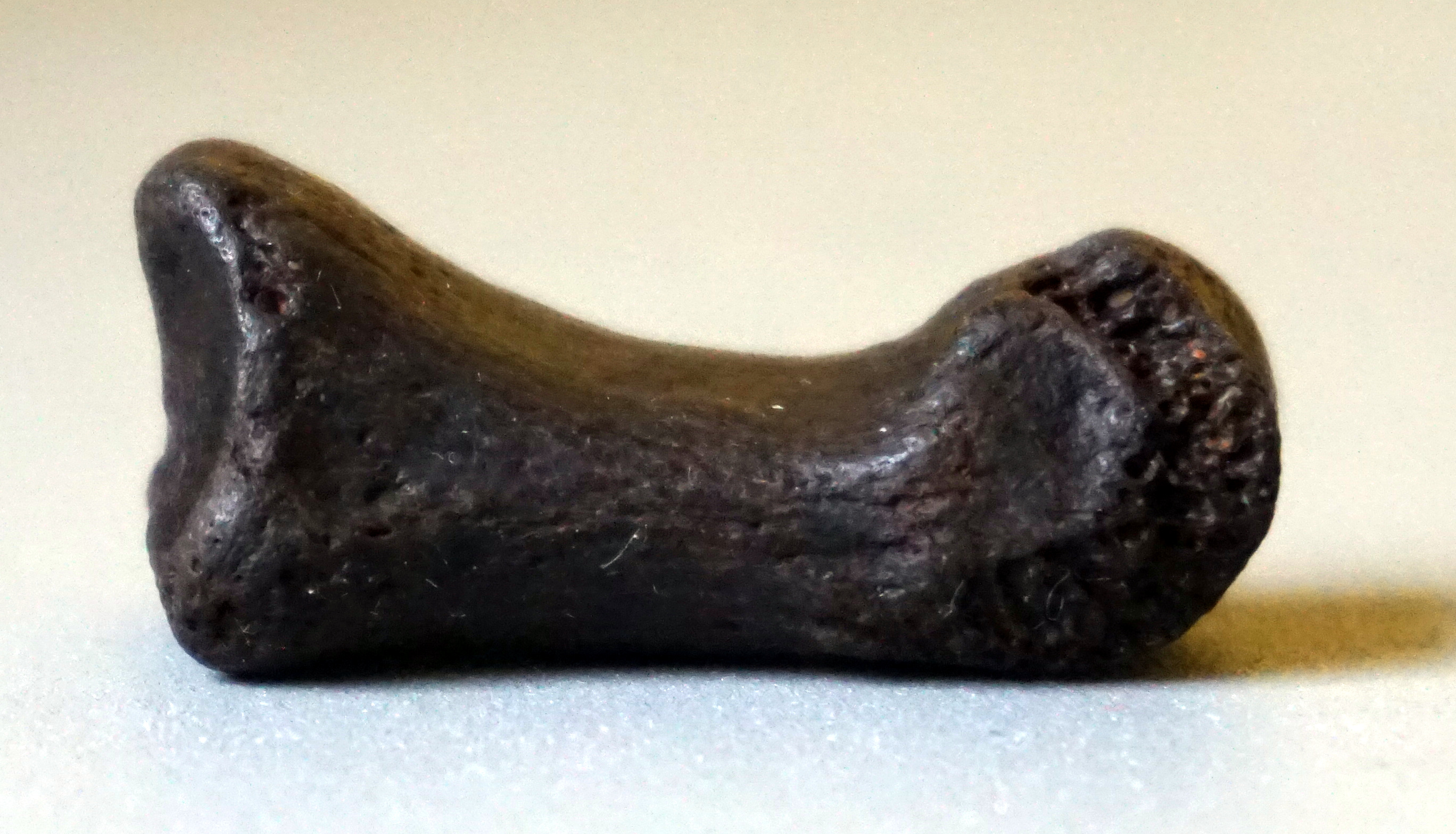 Dit is een tweede phalanx van een bruine beer. Dit is kenmerkend een tweede phalanx, goed zichtbaar op het proximale articulatievlak en de toegeknepen vorm aan de bovenzijde van het distale -vlak. Bij een leeuw is op die plaats een verbreding waarover de laatste koot kan kantelen (intrekken nagel). Genoeg gegevens?