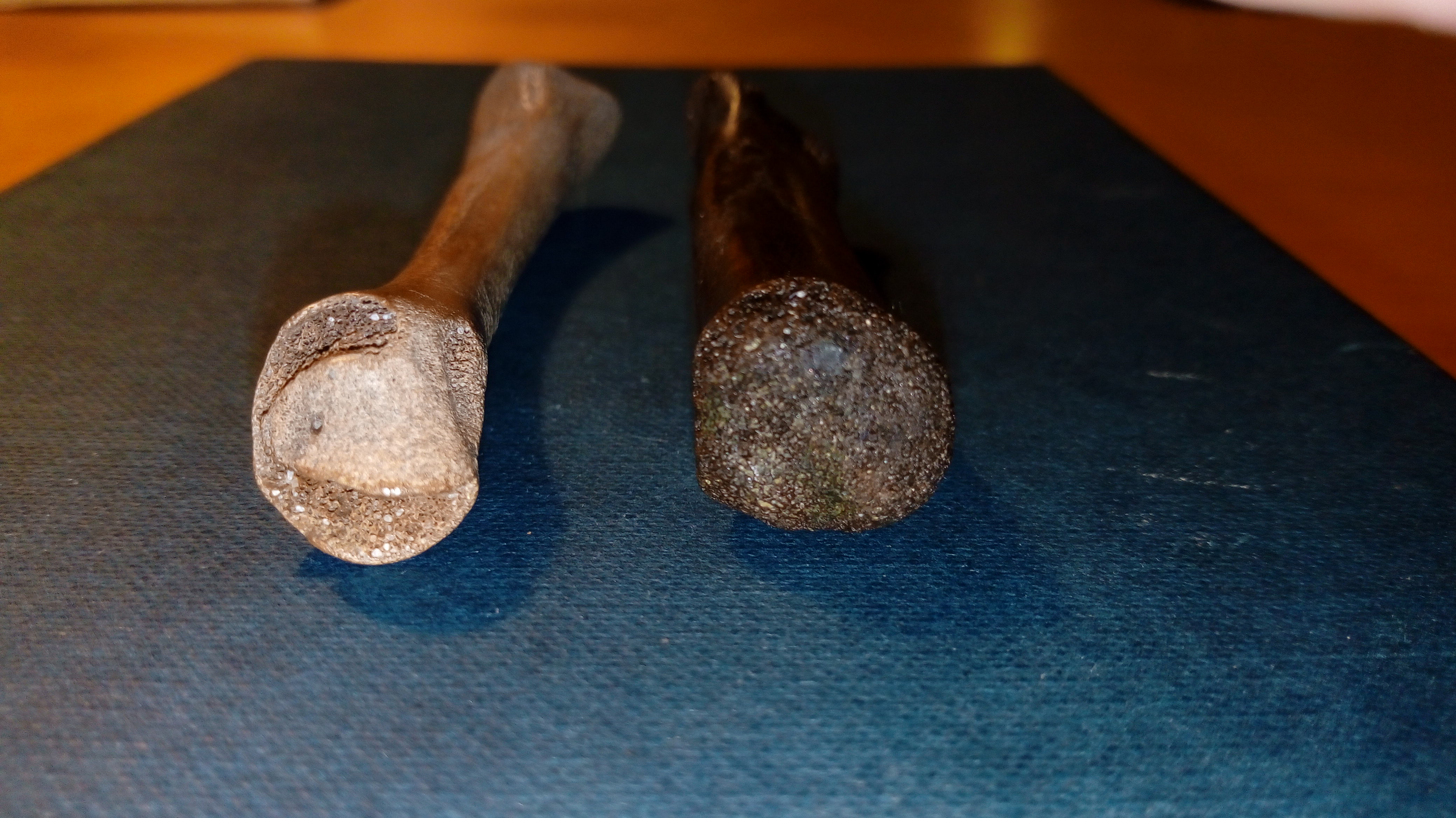 Ze zijn lastig, omdat ze beiden van jonge dieren zijn. De donkere kan een middenhandbeen zijn en de lichte een dijbeen. Van beiden is het een indicatie en geen determinatie.
