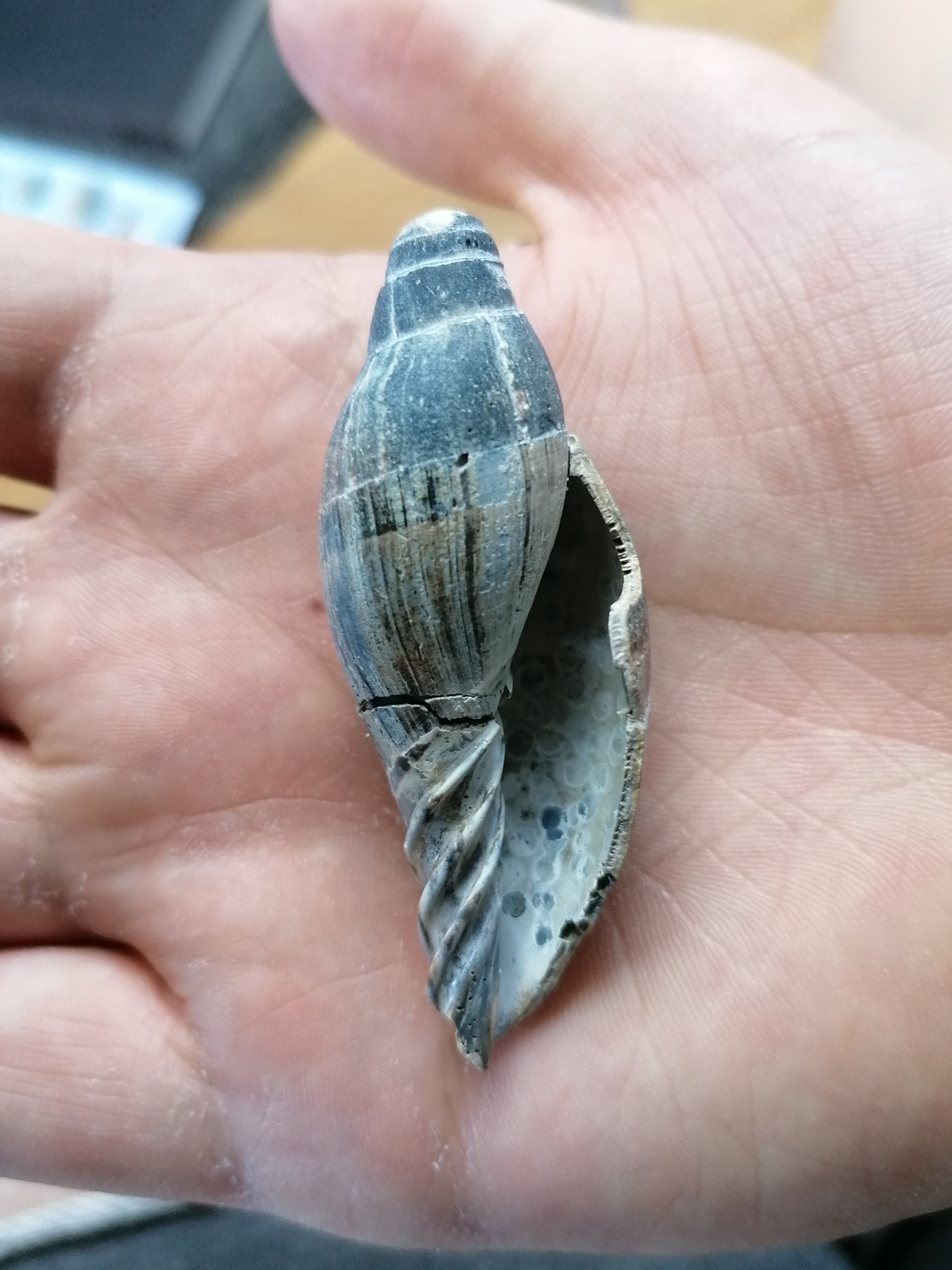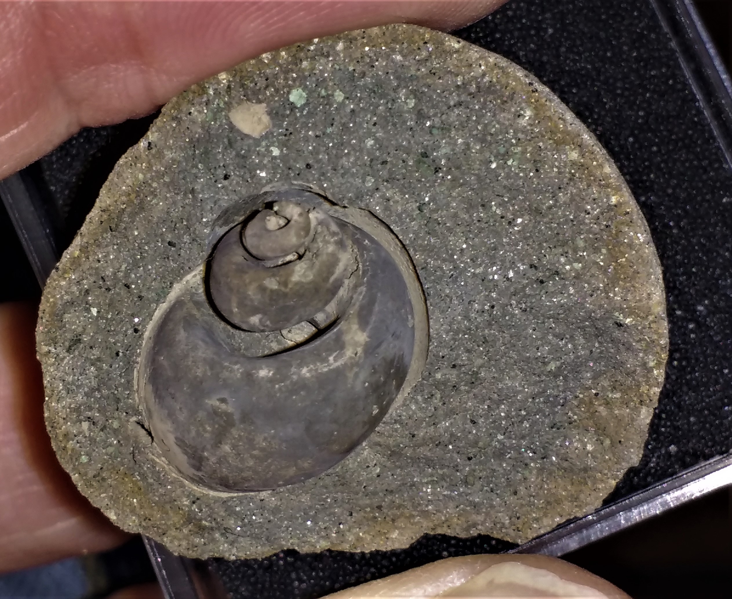 Een afdruk van een gastropode in een fosforietknolletje, waarvan ik in eerste instantie dacht dat het wellicht een rond Ordovicisch sponsje betrof, vervolgens thuis glauconietkorreltjes zag en er de hamer op los liet. Opmerkelijk gaaf tevoorschijn gekomen