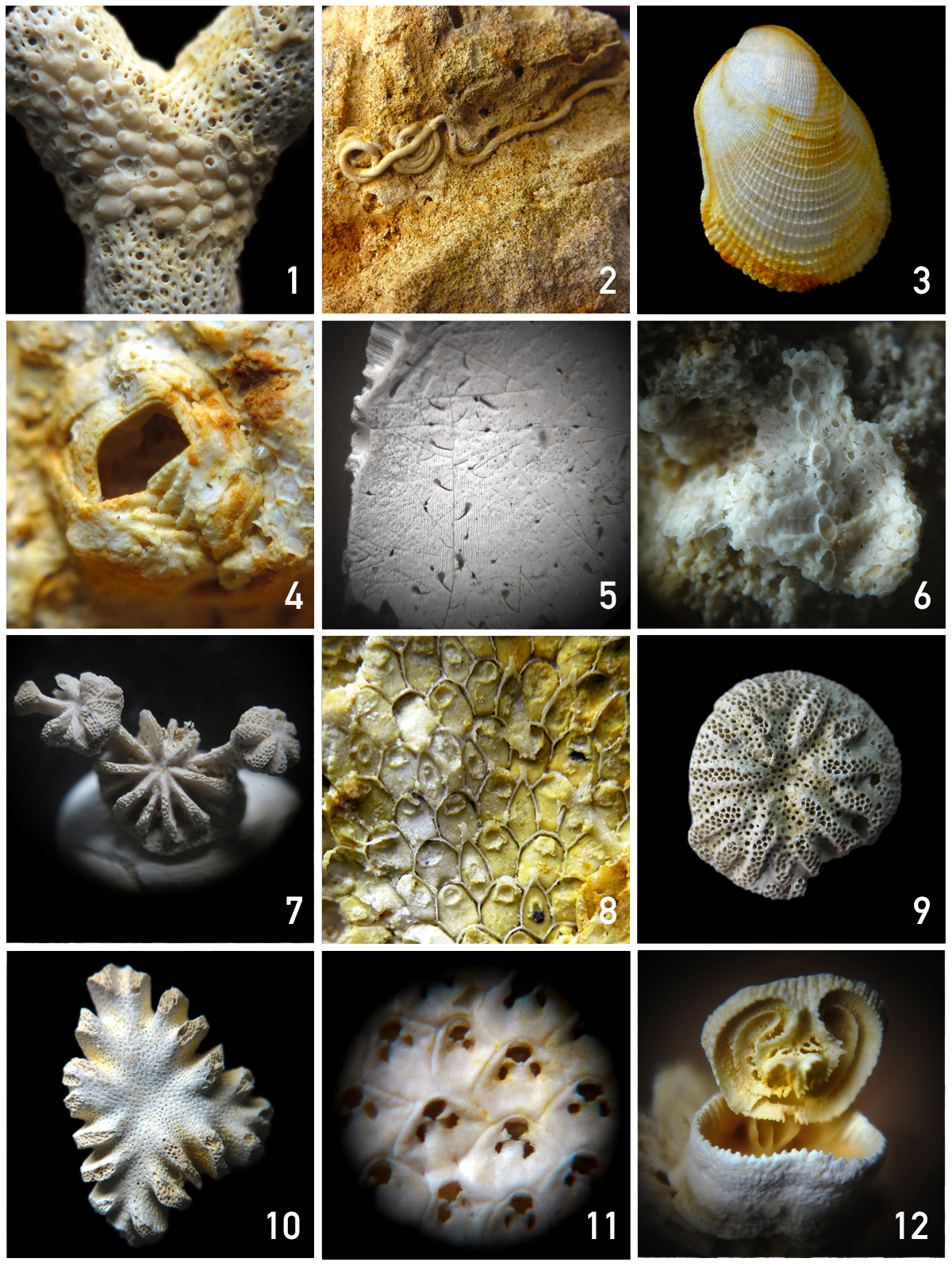 plaat 8: exceptionele preservatie van de bryozoa-soort Nudonychocella nuda uit de Meerssen member van de ENCI groeve. De simpel gebouwde cellen werden met fijn sediment gevult als de weke delen van de kolonie nog aanwezig waren. Hierdoor werden ook de celdekseltjes (opercula) als afdruk bewaard.