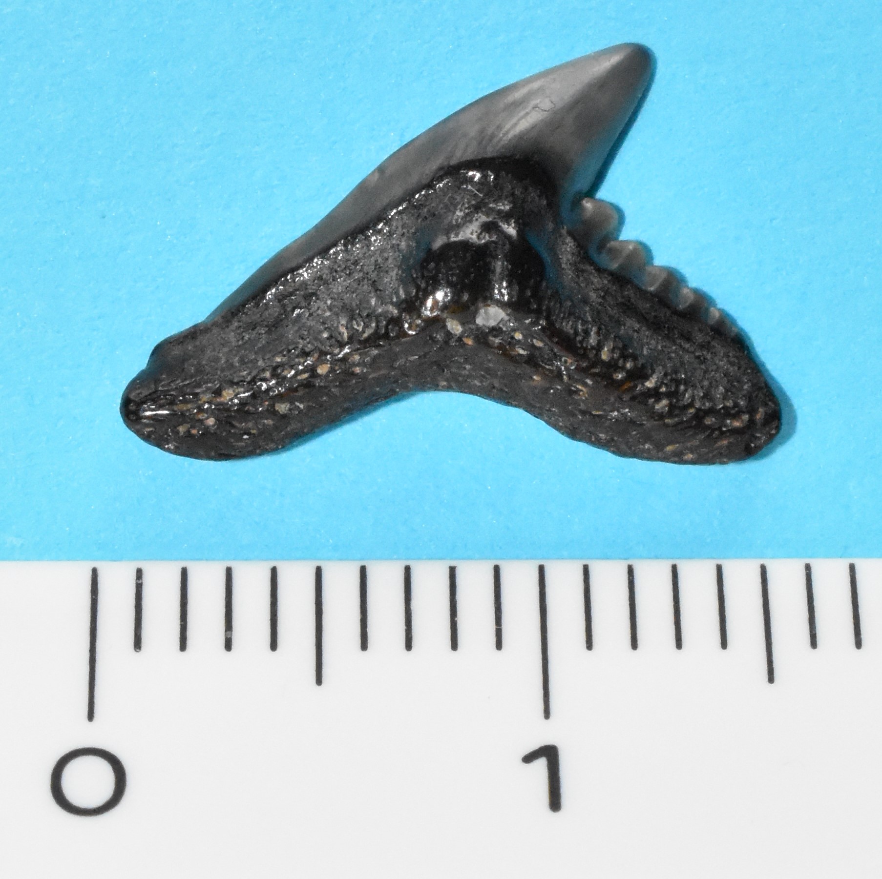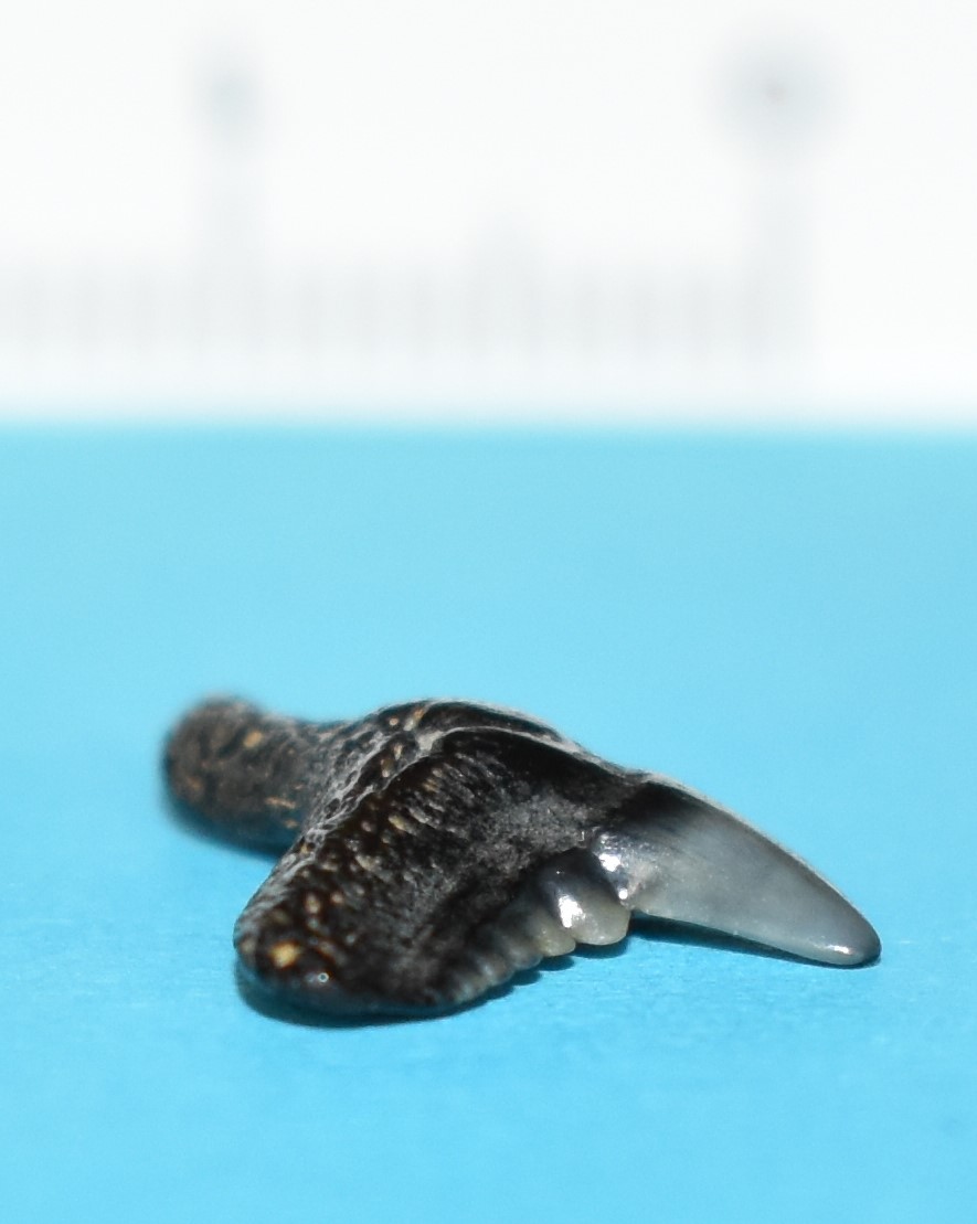 Deze tand komt uit Knokke. Ik vermoed dat het een Galeocerdo latidens is maar omdat de kleine tanden langs de zijde van de mesiale snijrand ontbreken vraag ik het even na. Ik heb ook niet de indruk dat deze tandjes ontbreken doordat ze volledig weggesleten zijn. Wat is jullie mening?