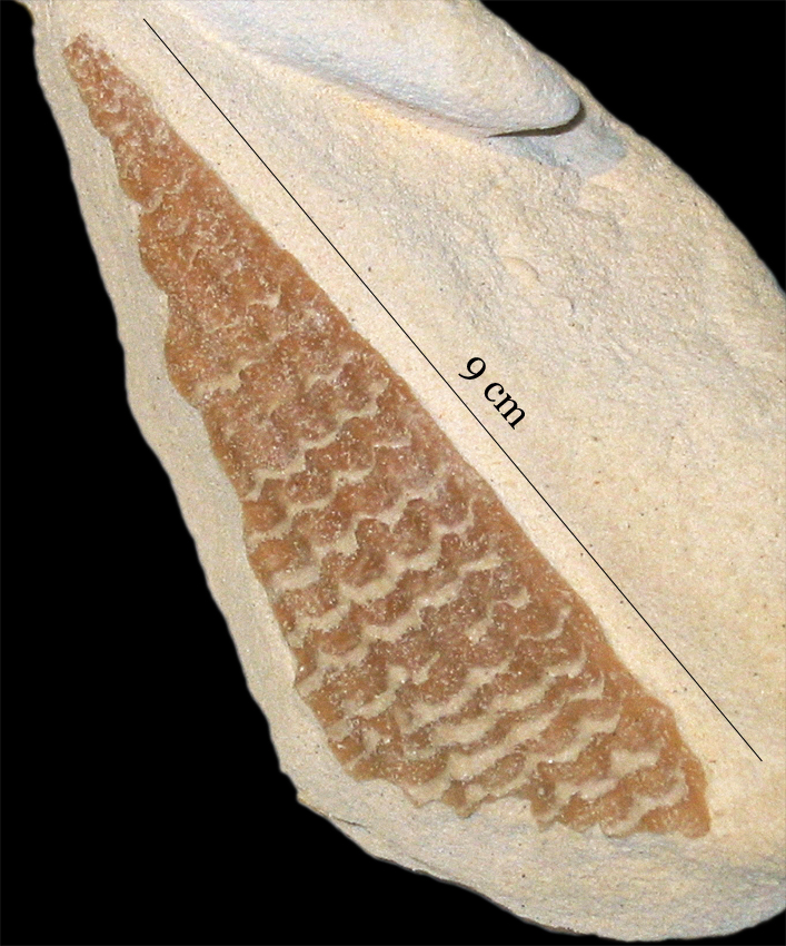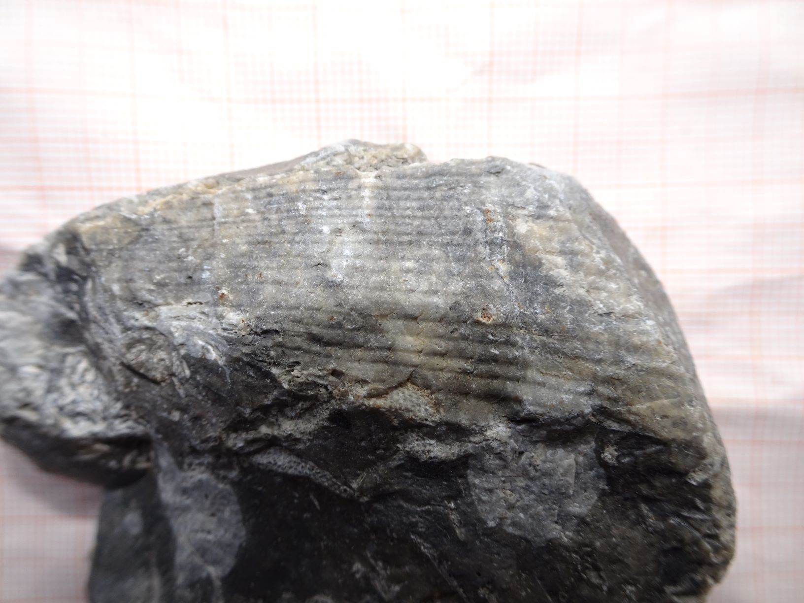 Dit zwerfsteentje heb ik twee jaar geleden opgeraapt bij een zandzuigerij in NO-Twente. Het is denk ik een stukje verkiezelde kalksteen (het heeft wel wat weg van Bryozoënvuursteen, maar de schelpvormige breuk van vuursteen ontbreekt). Er zitten wat verschillende Bryozoëntakjes in, maar het gaat mij om de structuur in de bovenste helft, 2,5 x 4 cm groot. Een tweedimensionale structuur met lengteribbels en dwars daarop regelmatig om de ca 2 mm golvende sutuurlijnen. In eerste instantie dacht ik dat dit ook een Bryozo zou zijn, in de richting van bijv Fenestella. Maar de typische "gaatjes-, c.q.doosjes-"structuur van mosdiertjes ontbreekt. Misschien is het dus wel iets heel anders. Wie heeft een goed idee ?