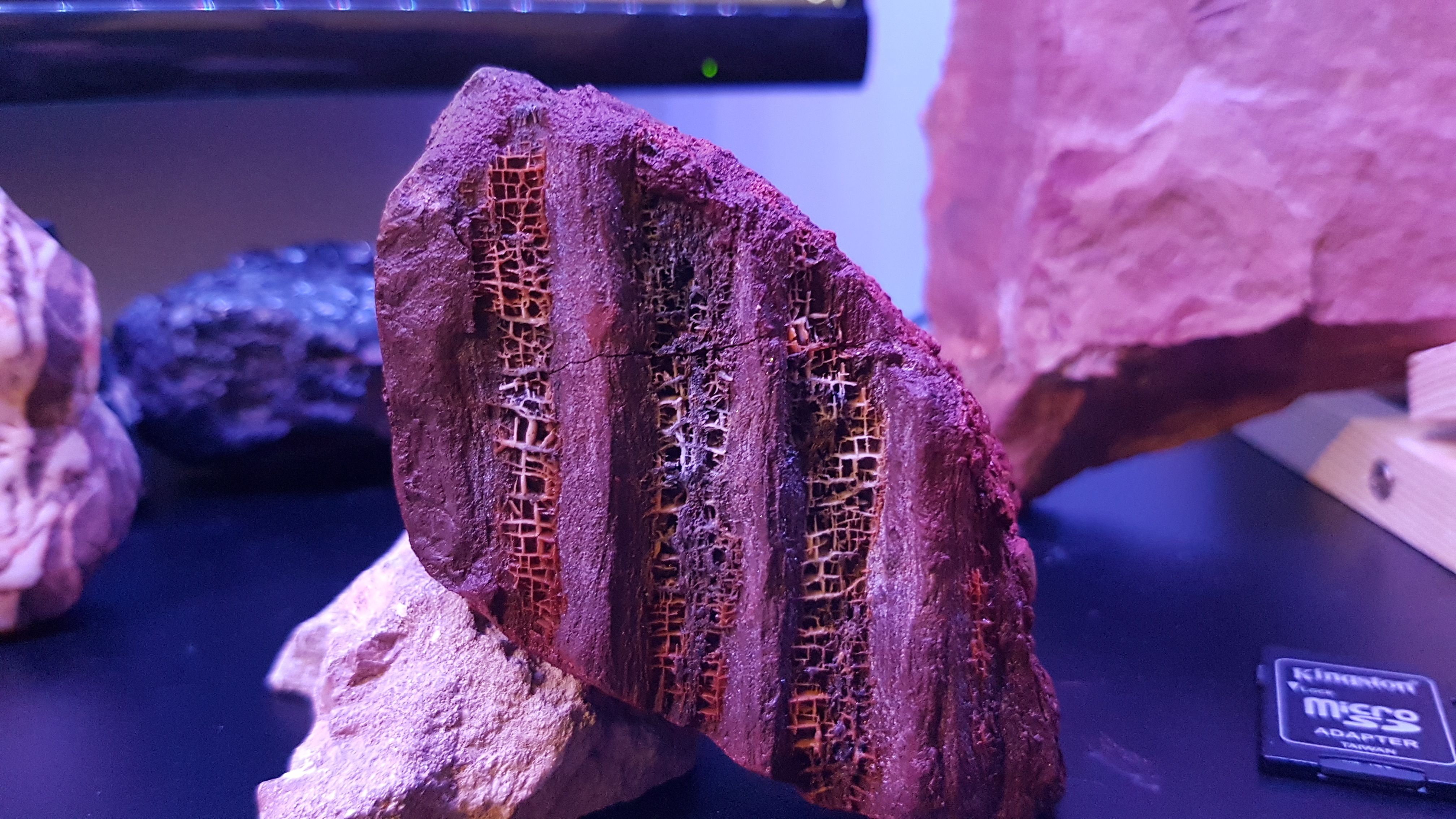 Dit soort hout heb ik nog niet gevonden. Aan de ene zijde een stuk met schors en onderaan een ontschorst stukje hout.