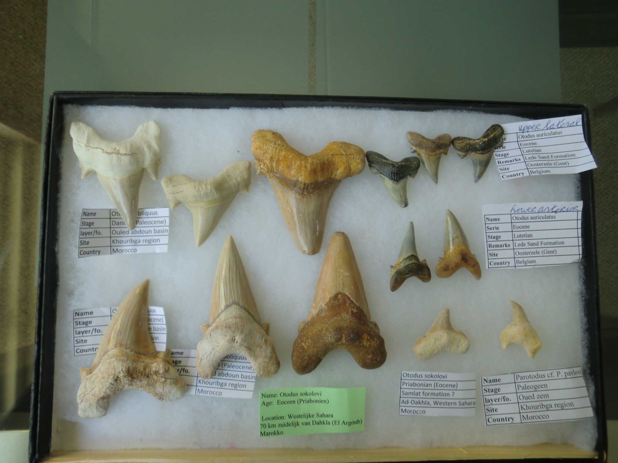 ]Graag gedaan. Bijgaand nog een impressie van een aantal Otodus tanden in mijn verzameling, mijn favoriete soort. Er zitten ook een paar bij uit Oosterzele (rechtsboven). Hopelijk heb jij er ook wat van uit deze lokatie.