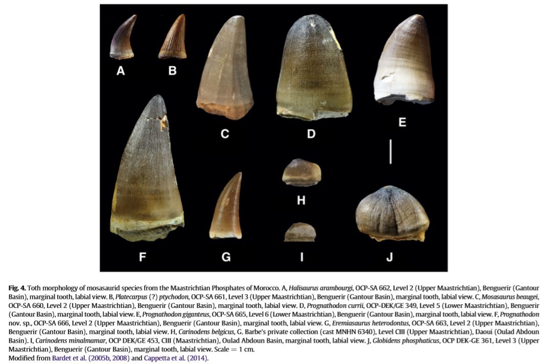Bardet et al. (2016) "Durophagous Mosasauridae (Squamata) from the Upper Cretaceous phosphates of Morocco, with description of a new species of Globidens" geeft trouwens ook een nuttige korte omschrijving van de tanden van Prognathodon currii.