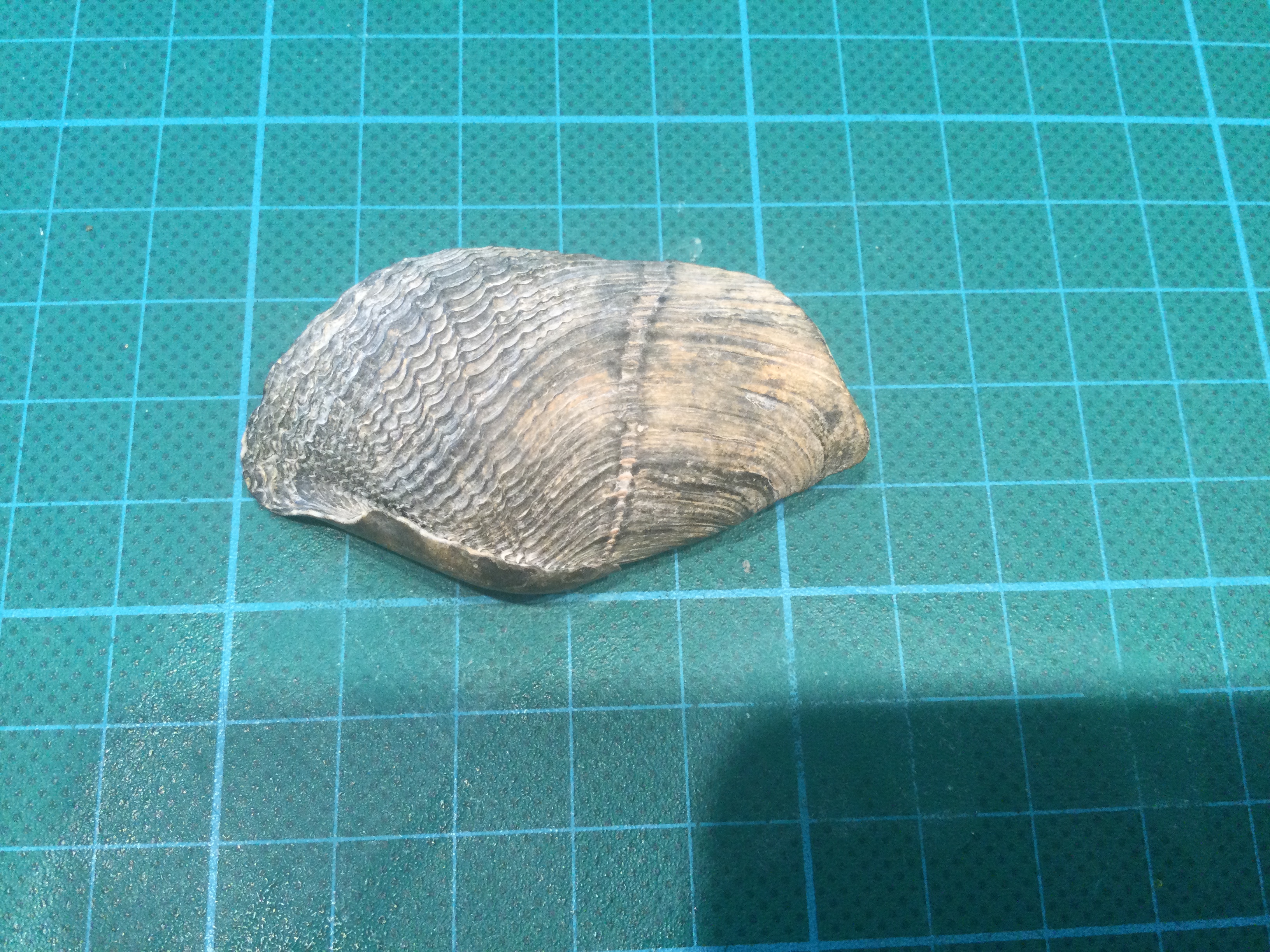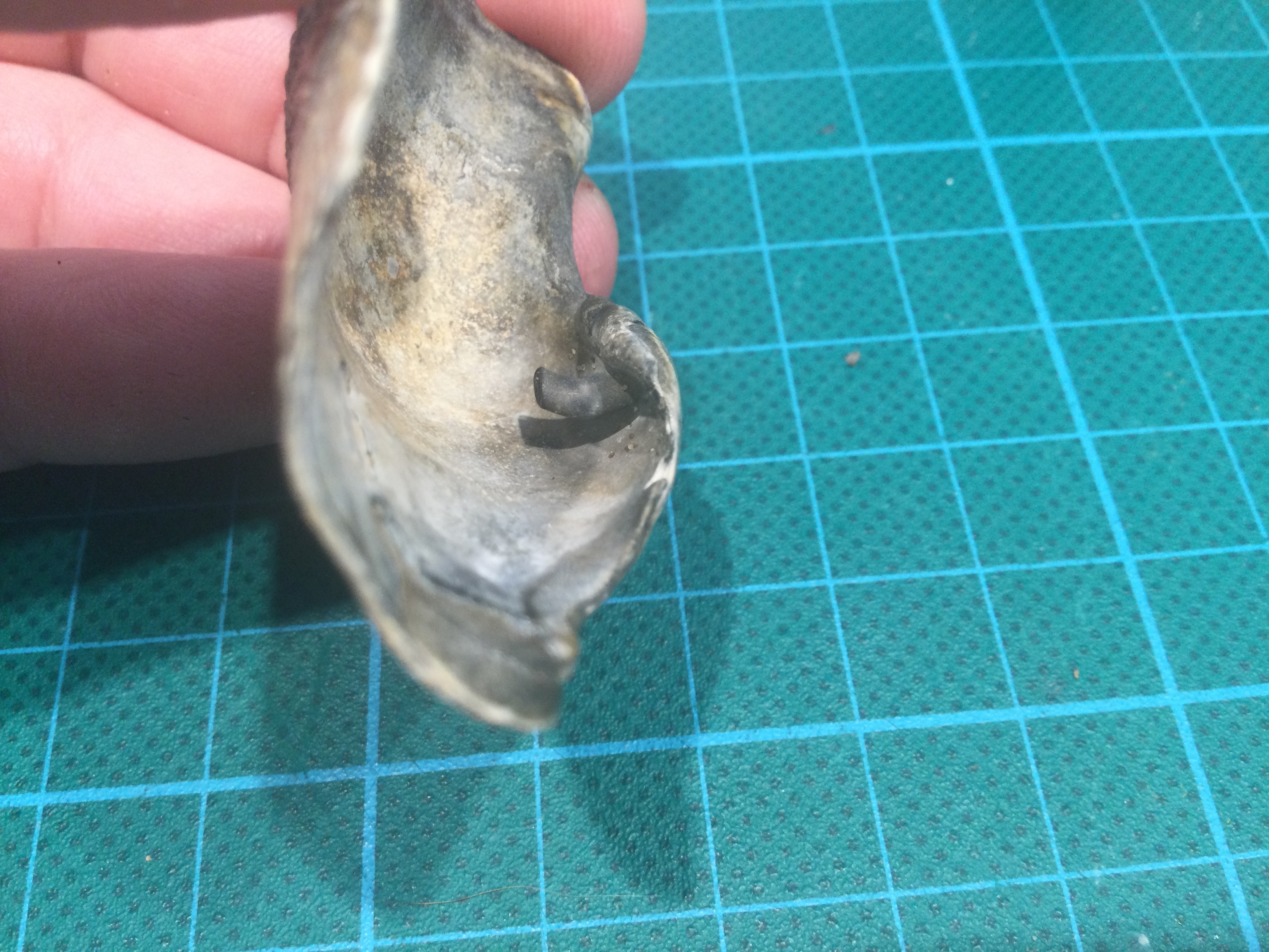 Het is een fragment van een brachiopode (misschien spiriferina?), lijkt niets bijzonders. Maar aan de binnenkant zit dat steeltje vast. Is dat de voet waar ze mee vastzaten aan de ondergrond?