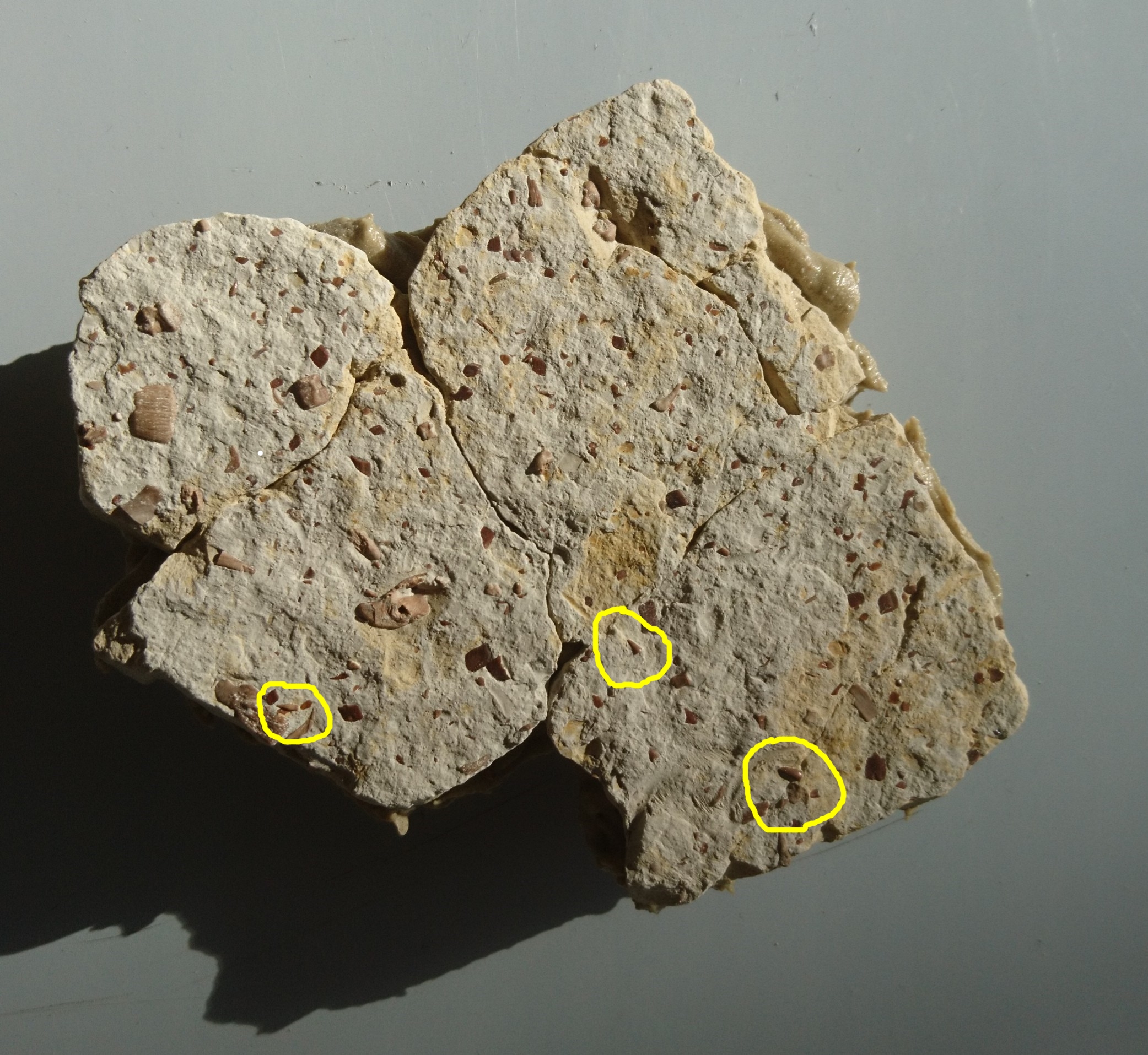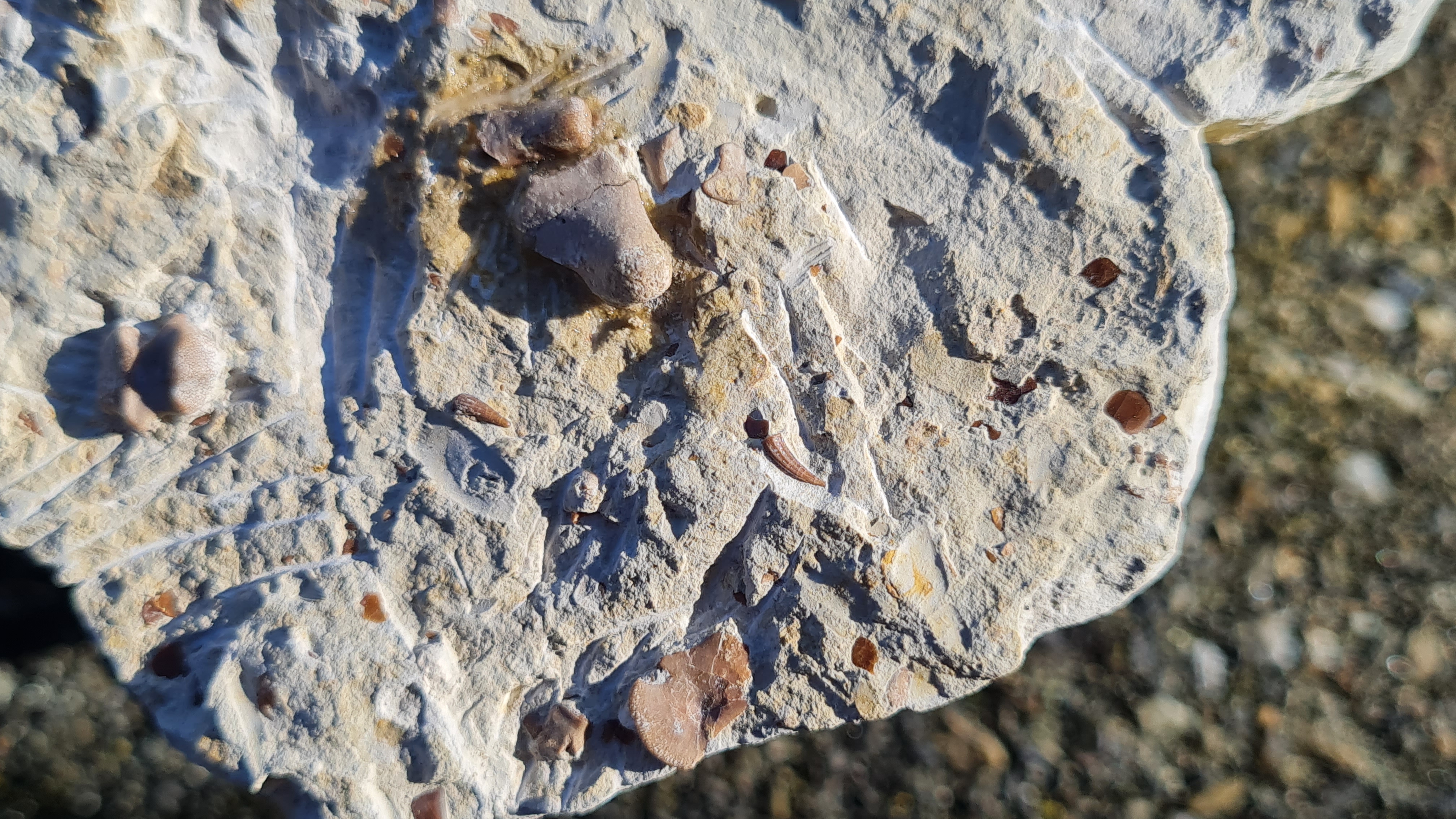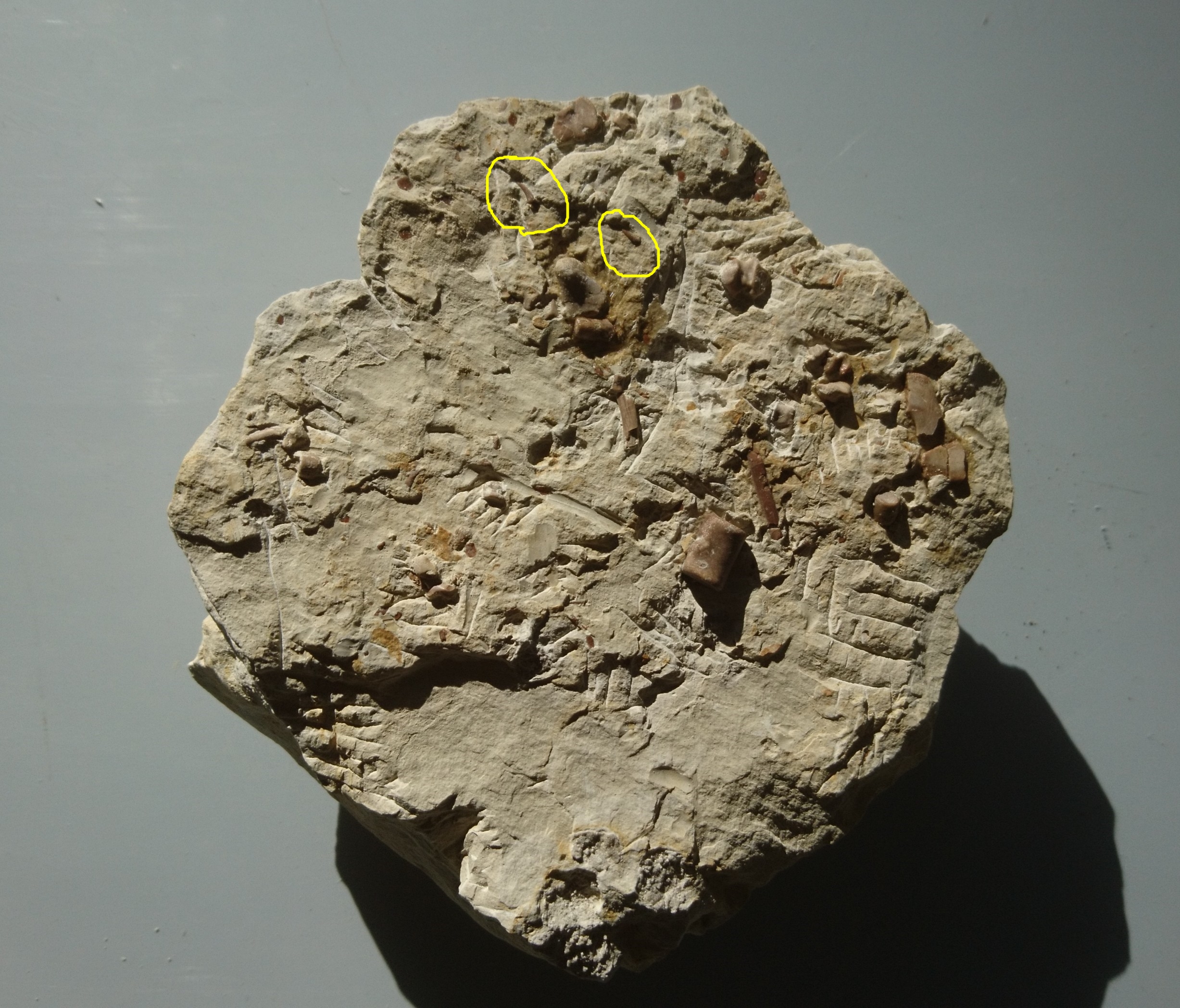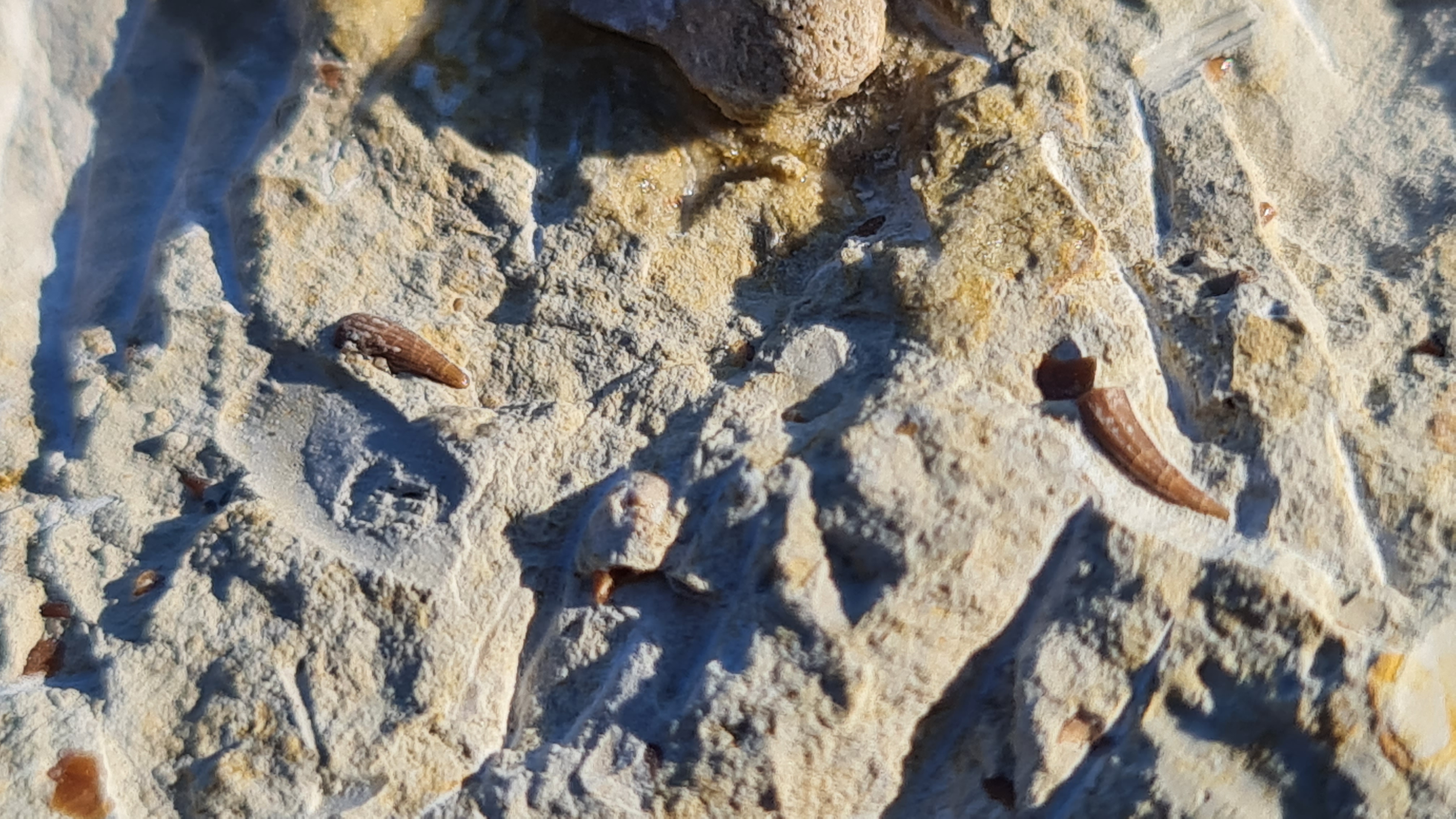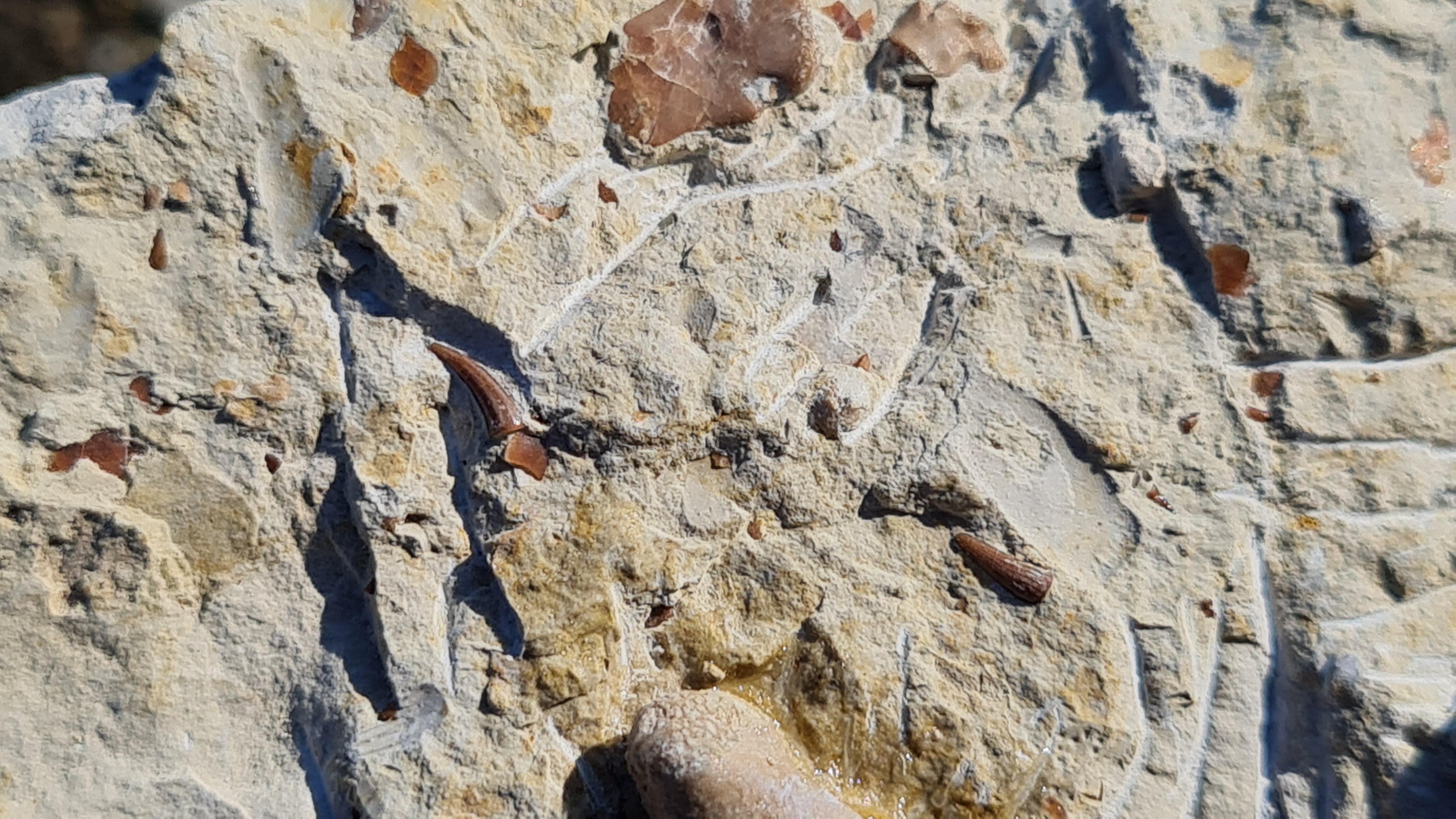 Ik heb twee stukken steen uit het midden Trias van Rüdersdorf. Op de steen zitten zeer kleine tandje. Heb 5 cent erbij gelegt om de grote te vergelijken. Ik vermoed juveniele Nothosaurus sp., maar ben lang niet zeker. Iemand een idee?