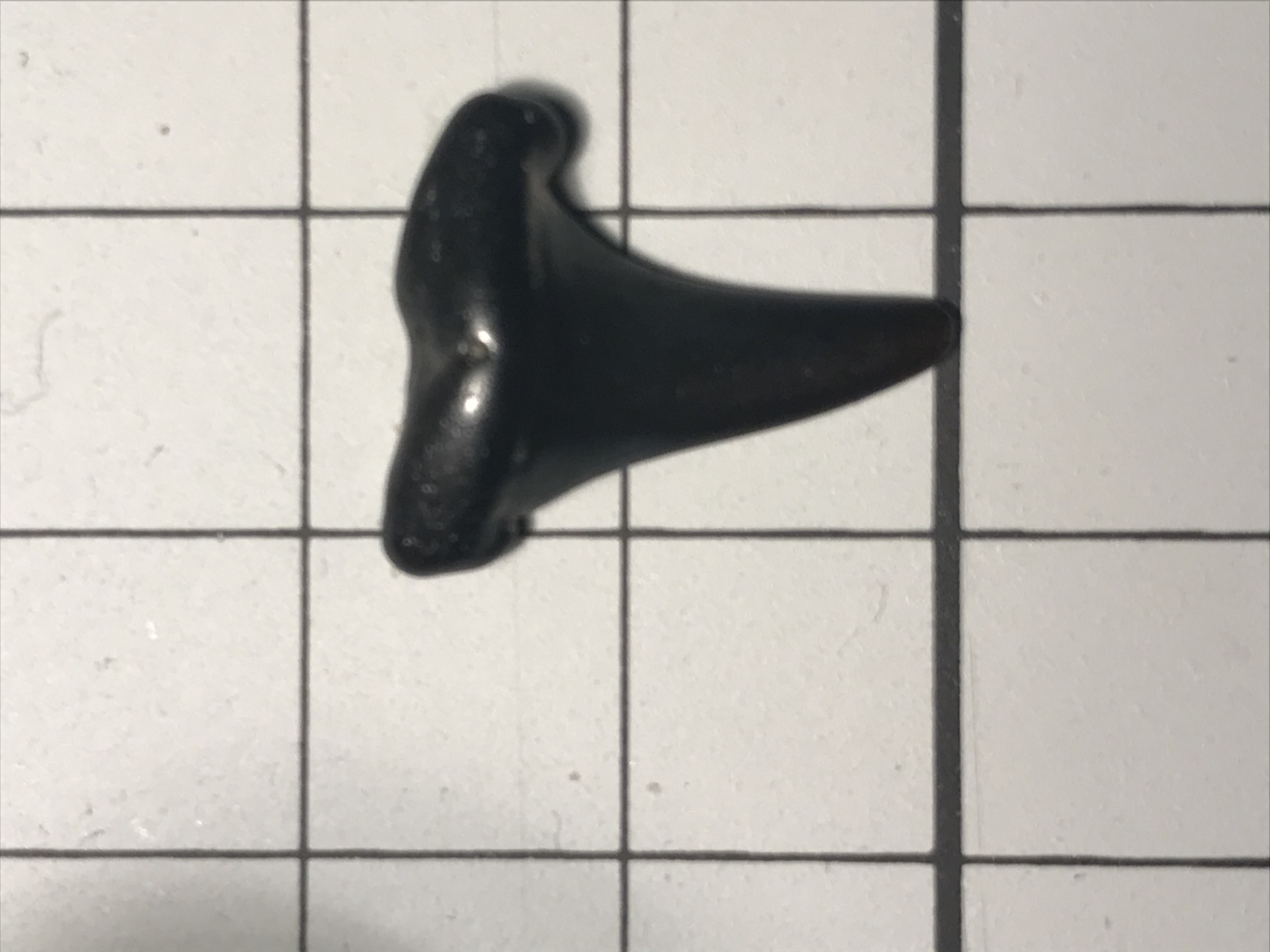 Het is een erg verrold tandje. Dat maakt een sluitende identificatie vrij lastig. Het tandje lijkt mij te plat voor een Jaekelodotus robustus (de soortnaam geeft al aan: die tandjes zijn eerder vrij robust). De vorm van de kroon doet eerder iets van Hypotodus verticalis vermoeden. Maar, zoals gezegd: bij dergelijke afgerolde tandjes blijft het een beetje gokken.
