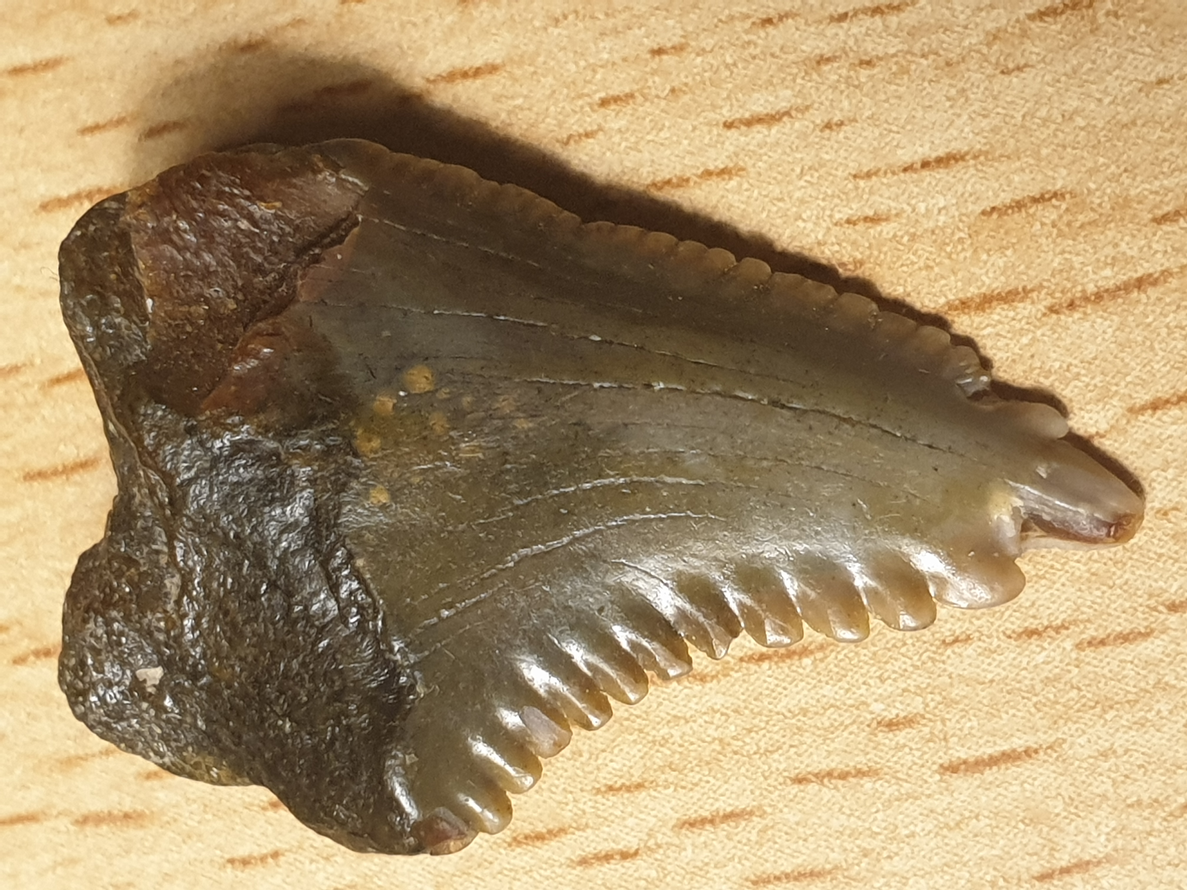 Deze eerst haaientand betreft meteen de meest afwijkende die ik daar heb gevonden. Zover ik heb kunnen vinden komen deze tanden in Amerika vaker voor, maar zijn ze in deze regio redelijk zeldzaam.
