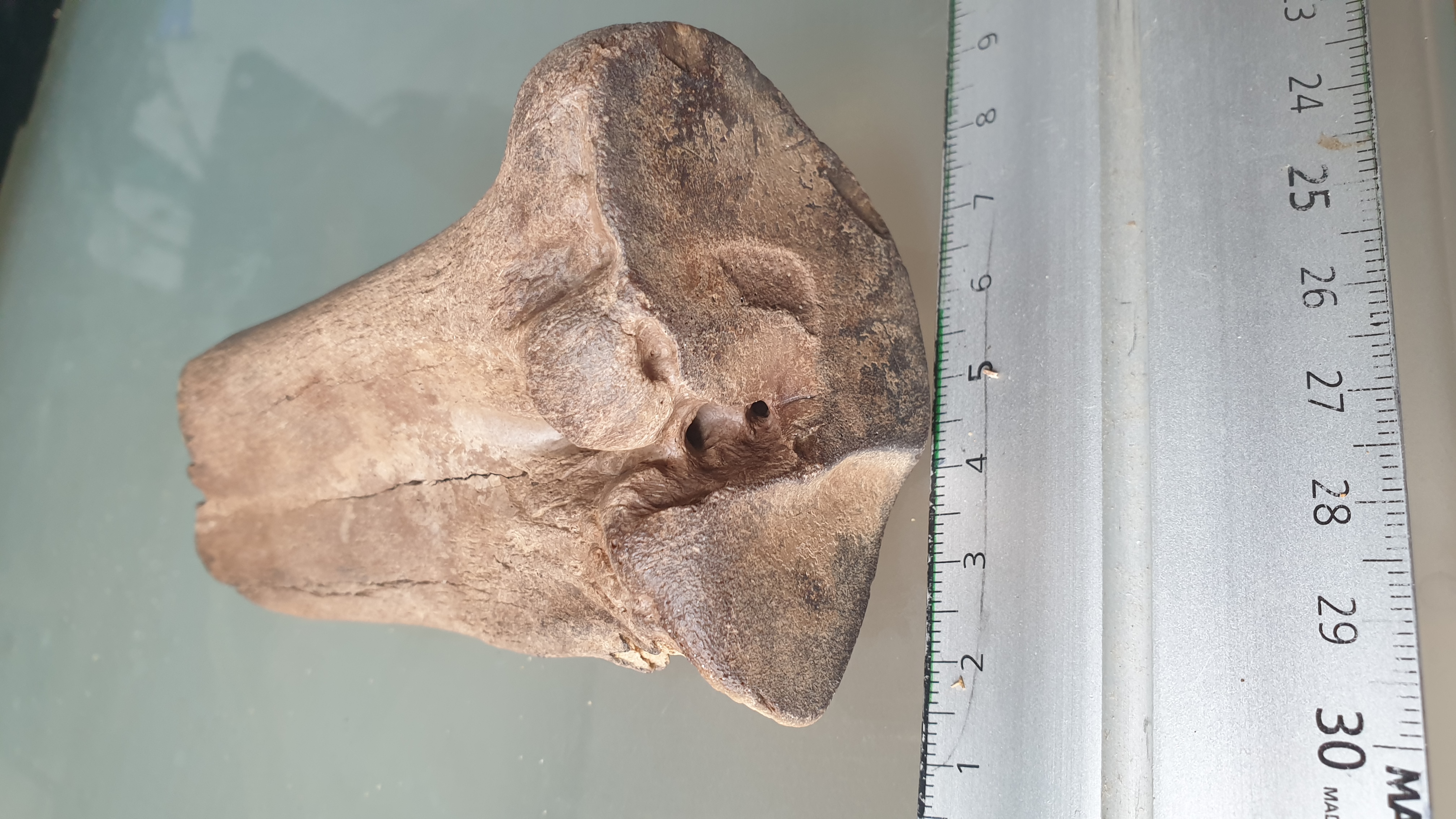 Dit is het proximale deel van een middenhandsbeen (metacarpus) van een rund. Hert is smaller.