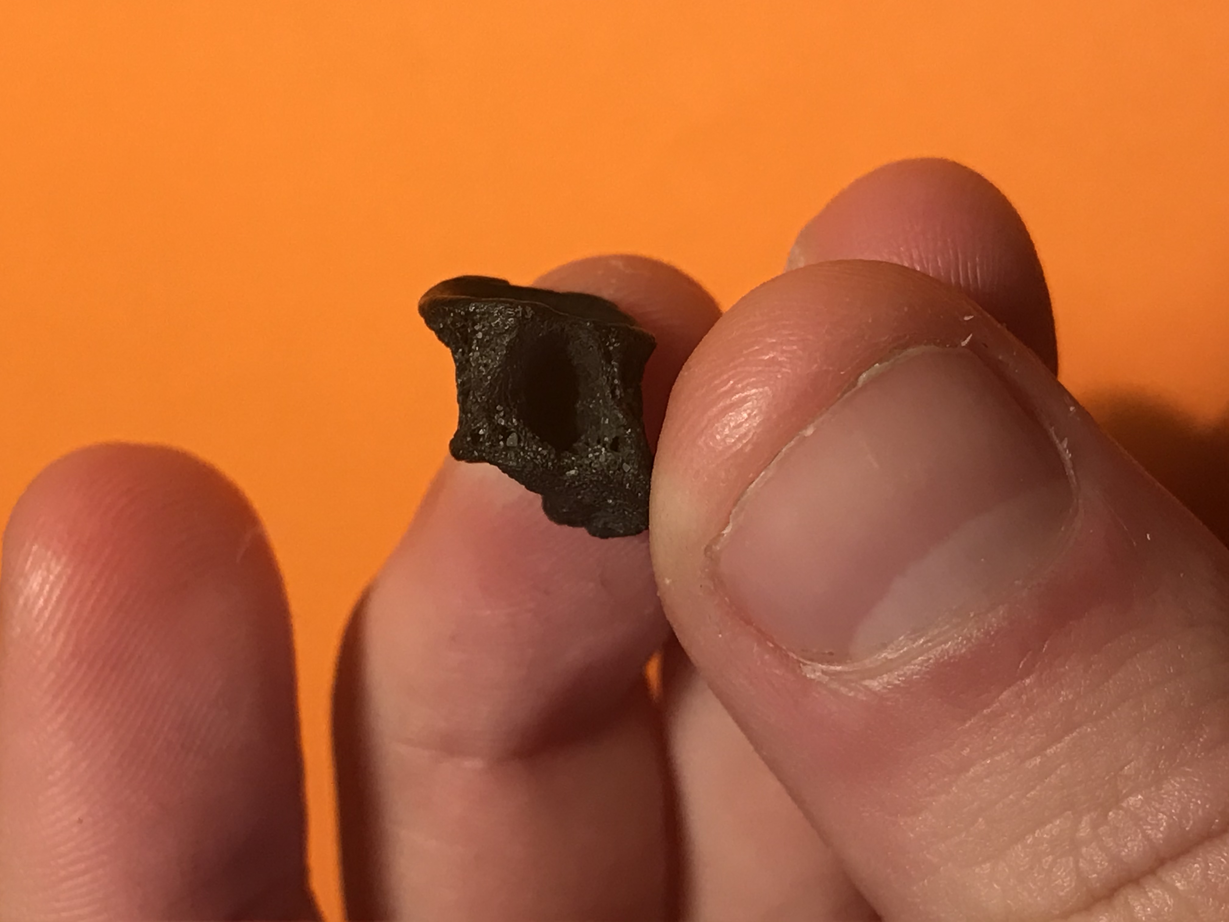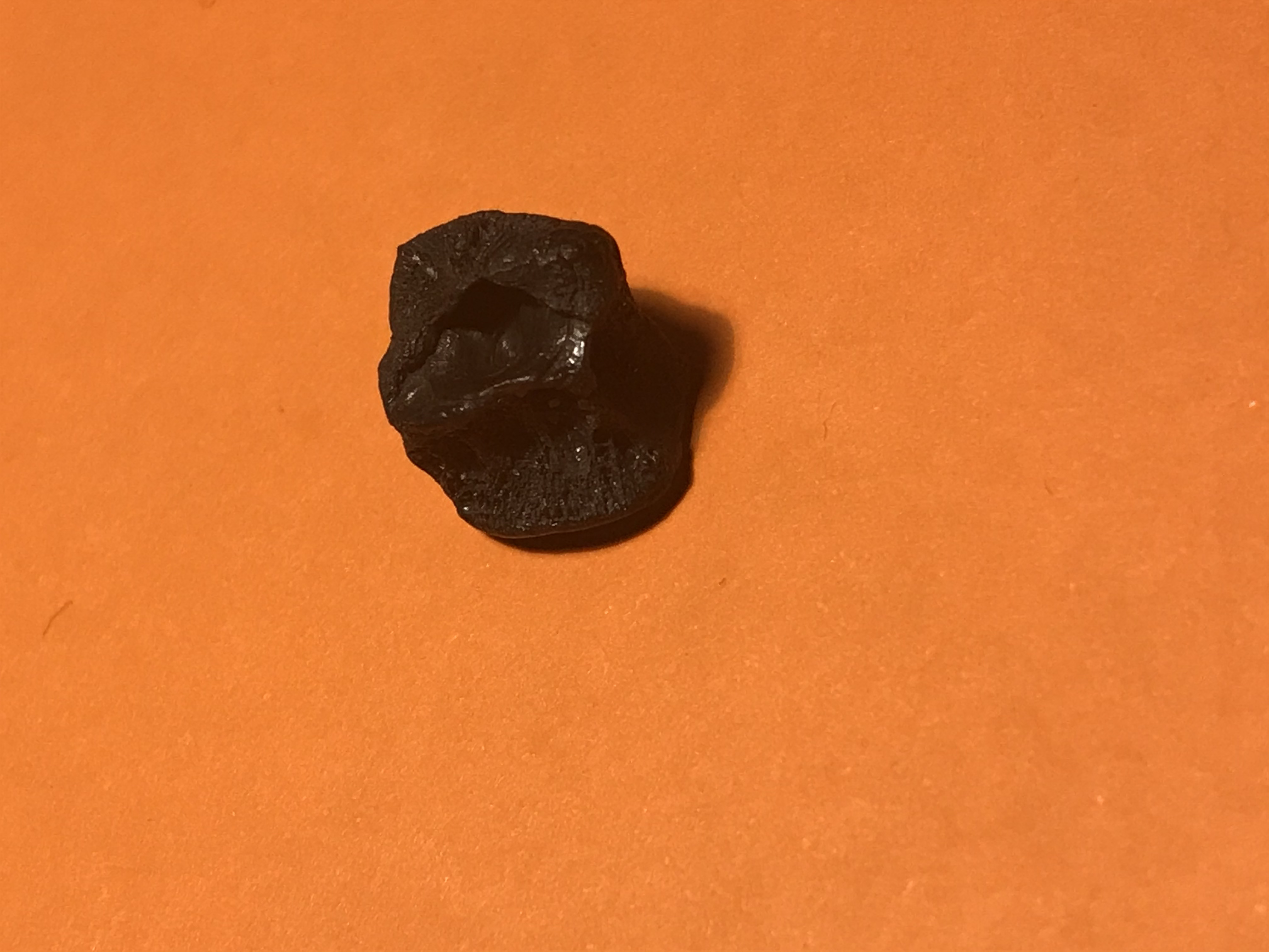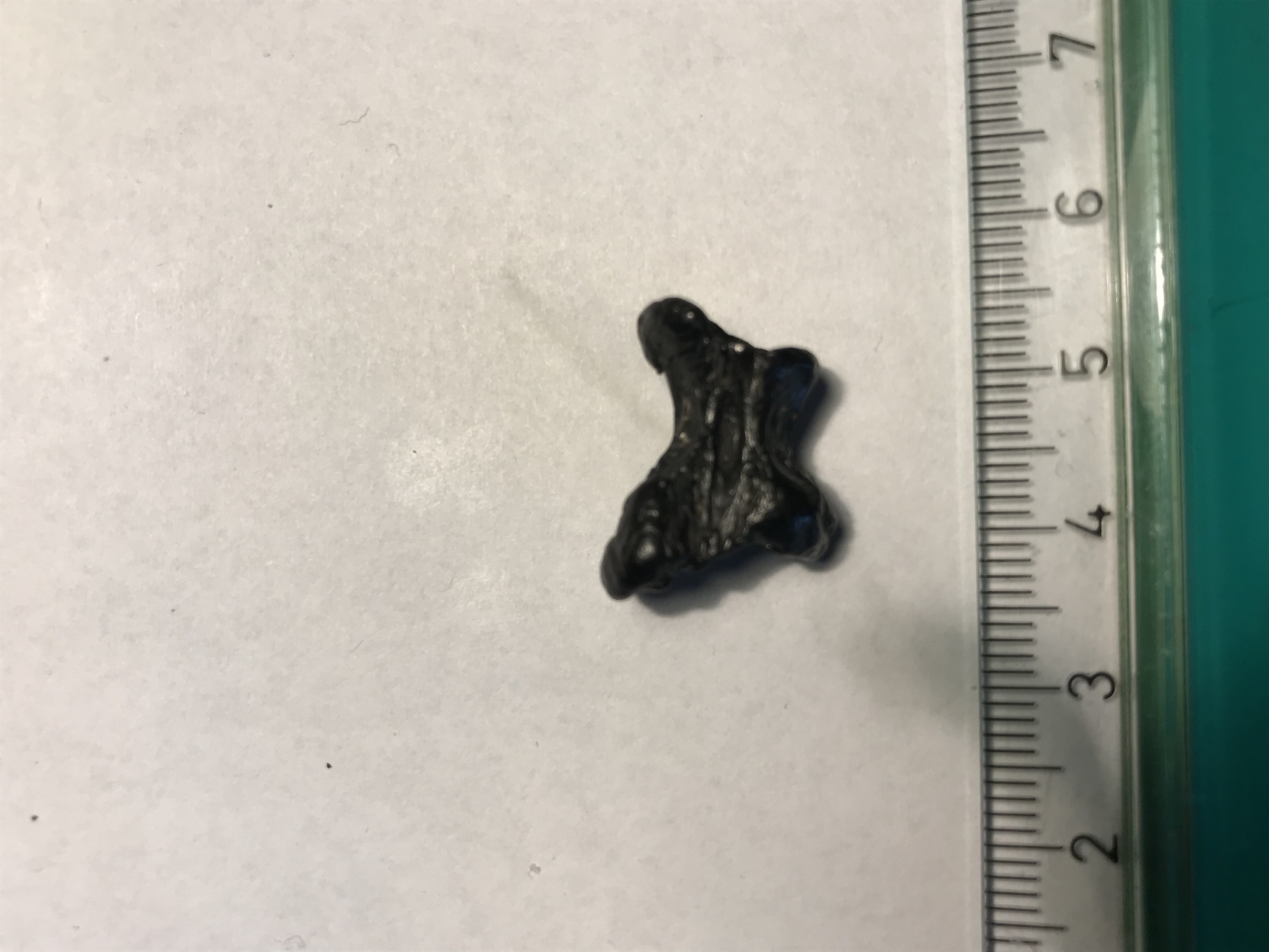 Hierbij m’n andere viswervel. Deze is vervormd en er is een andere wervel bij aangegroeid. Het leek me toch geen fijn leven als een van je wervels zo is vergroeid, ook omdat je bewegelijkheid dan wordt beïnvloed lijkt me. Ik durf ook geen zekere uitspraken te doen over de soort omdat deze zo vervormd is maar ik vermoed een kabeljauwachtige.