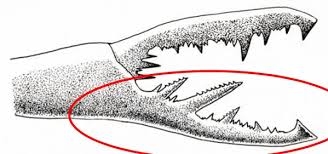 Heeft een tweede haakje, terwijl de meeste er slechts 1 hebben. Otodus obliquus
