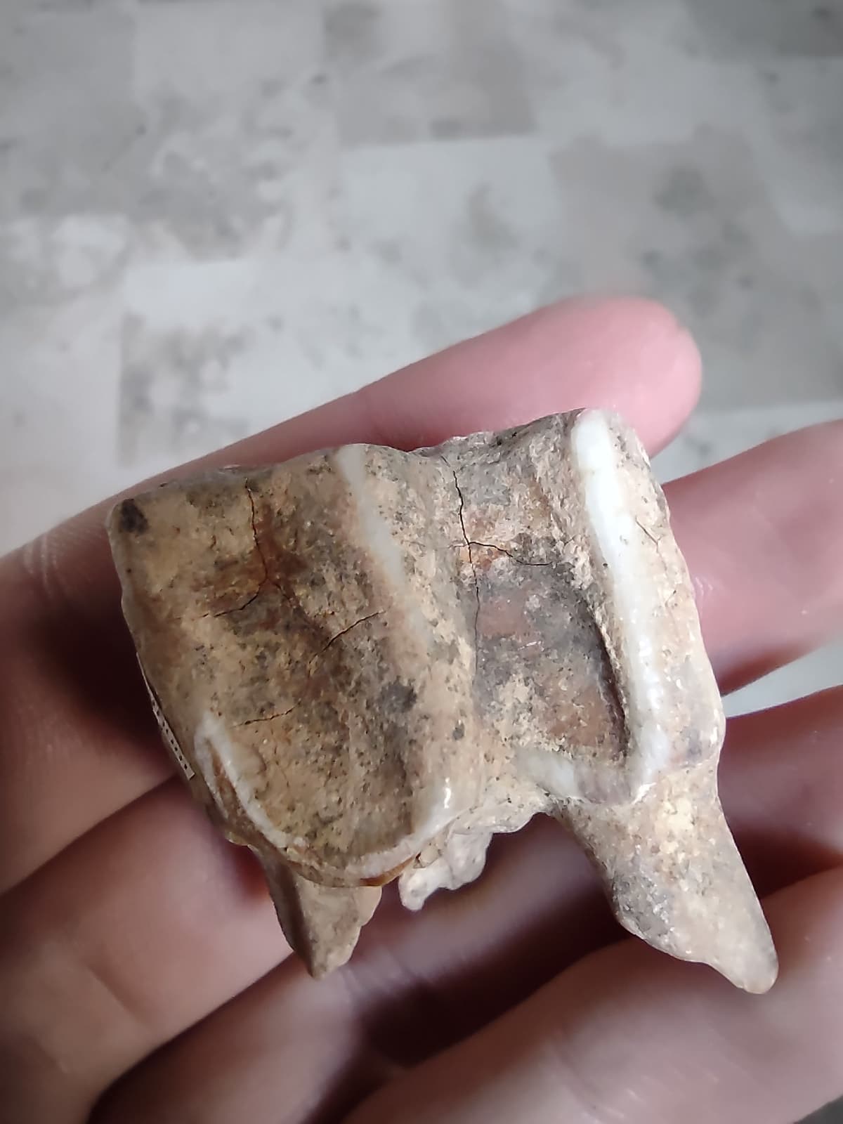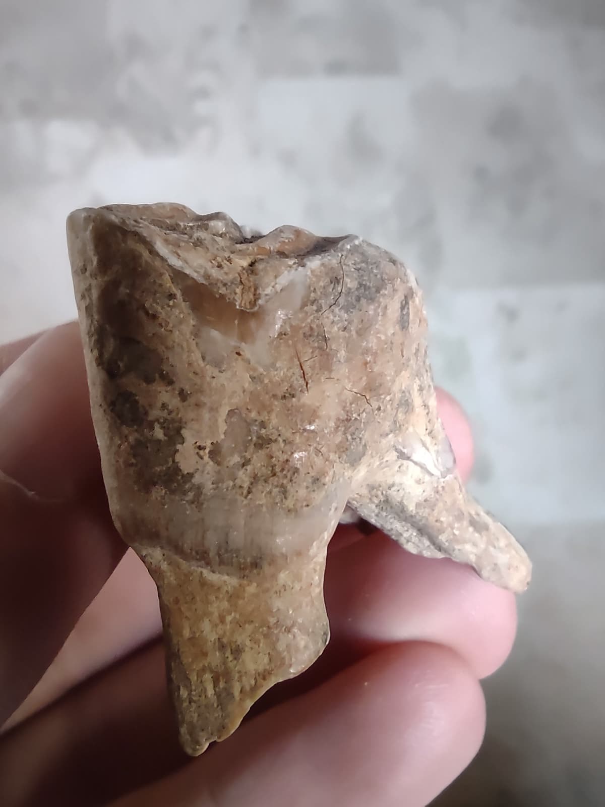 Deze tand (kies) werd gevonden in Lathum. Kan iemand mij verder helpen of het hier om een een paard- of runderkies gaat. Bijkomend zou ik willen vragen hoe men het verschil tussen beide tanden kan herkennen.