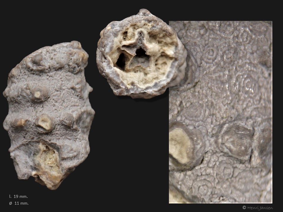 Afgelopen week zat ik even bij zijn zoon en schoondochter achter het huis, toen ik van mijn kleindochter (ruim 1 ½ jaar) twee steentjes uit de grindbak kreeg. “Gamma” grind dus wat mij betreft is de herkomst van het grind onbekend, maar waarschijnlijk zuidelijk. Eén van de steentjes is duidelijk fossiel, maar opa weet het antwoord niet. Het is een stengeltje met duidelijk knobbeltjes in kransen er omheen geplaatst. De buitenzijde is dicht chalcedoon-verkiezeld en zijn er mooi Buch’s-ringen te zien.