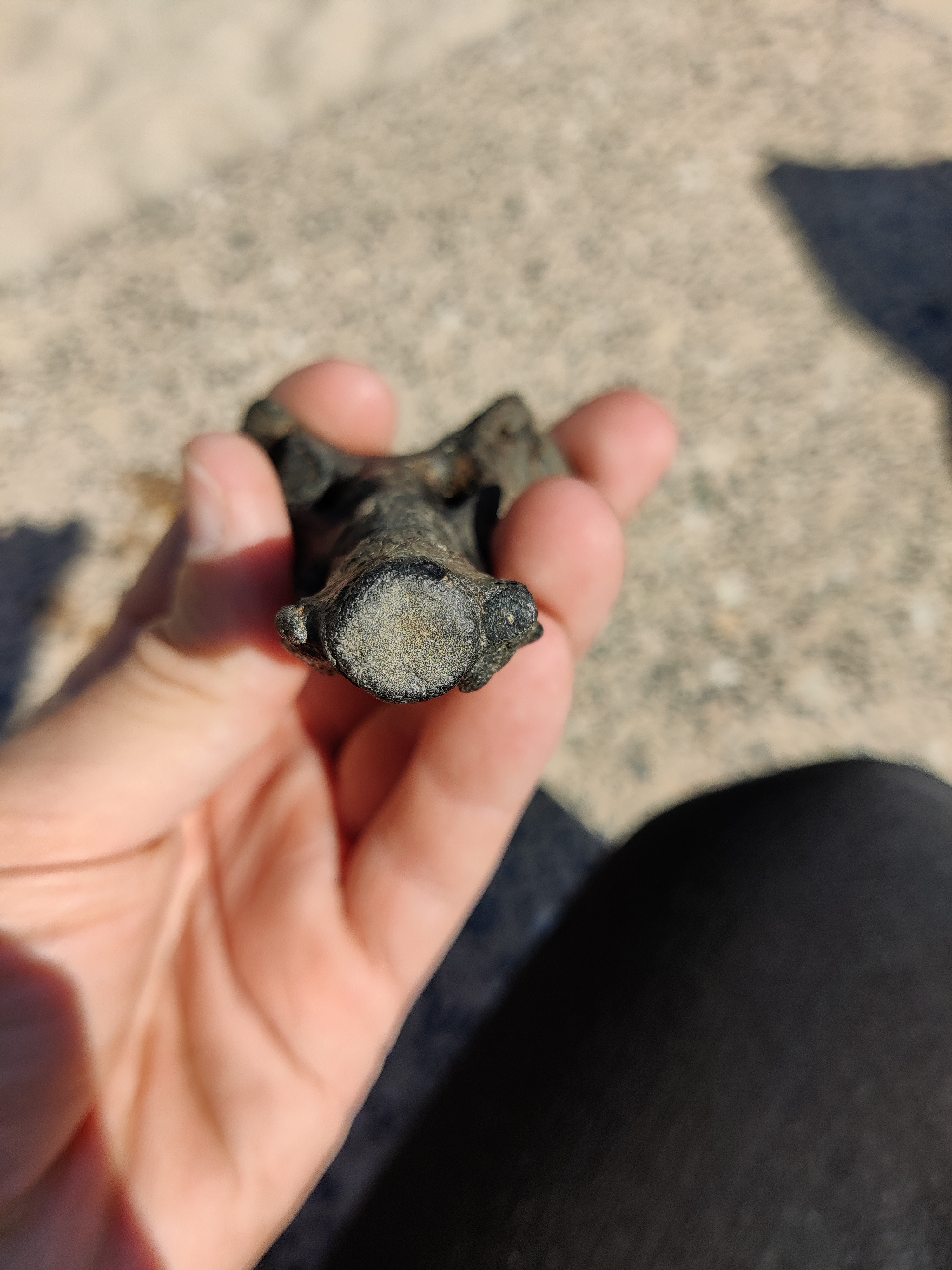 Vanochtend vond ik in Antwerpen (neogeen). Dit versteend bot. Volgens mij is het een stuitbeen van een zeezoogdier, misschien een pliocene zeehond? Ik heb geen meetlat voor schaal bij de hand, ik zal vanavond nog een foto met schaal posten.