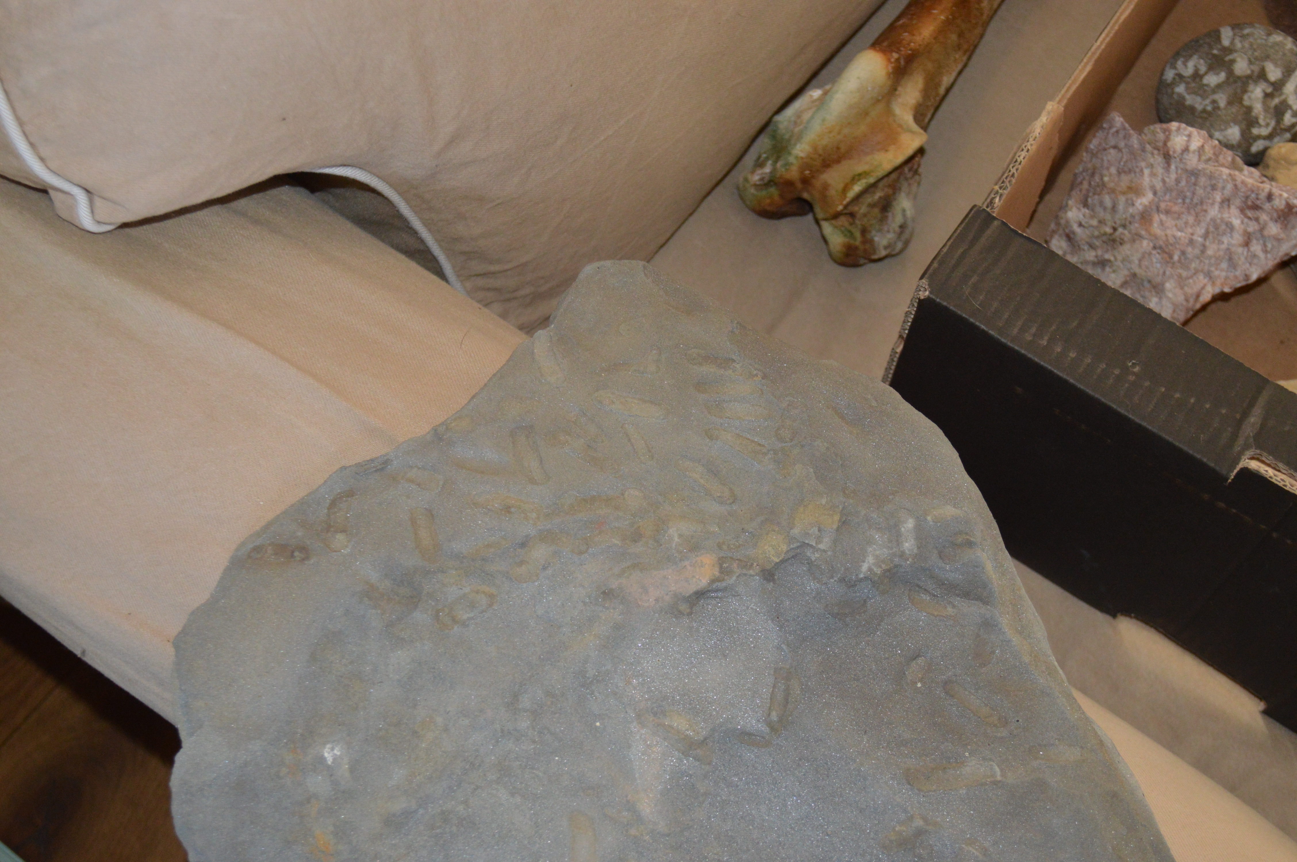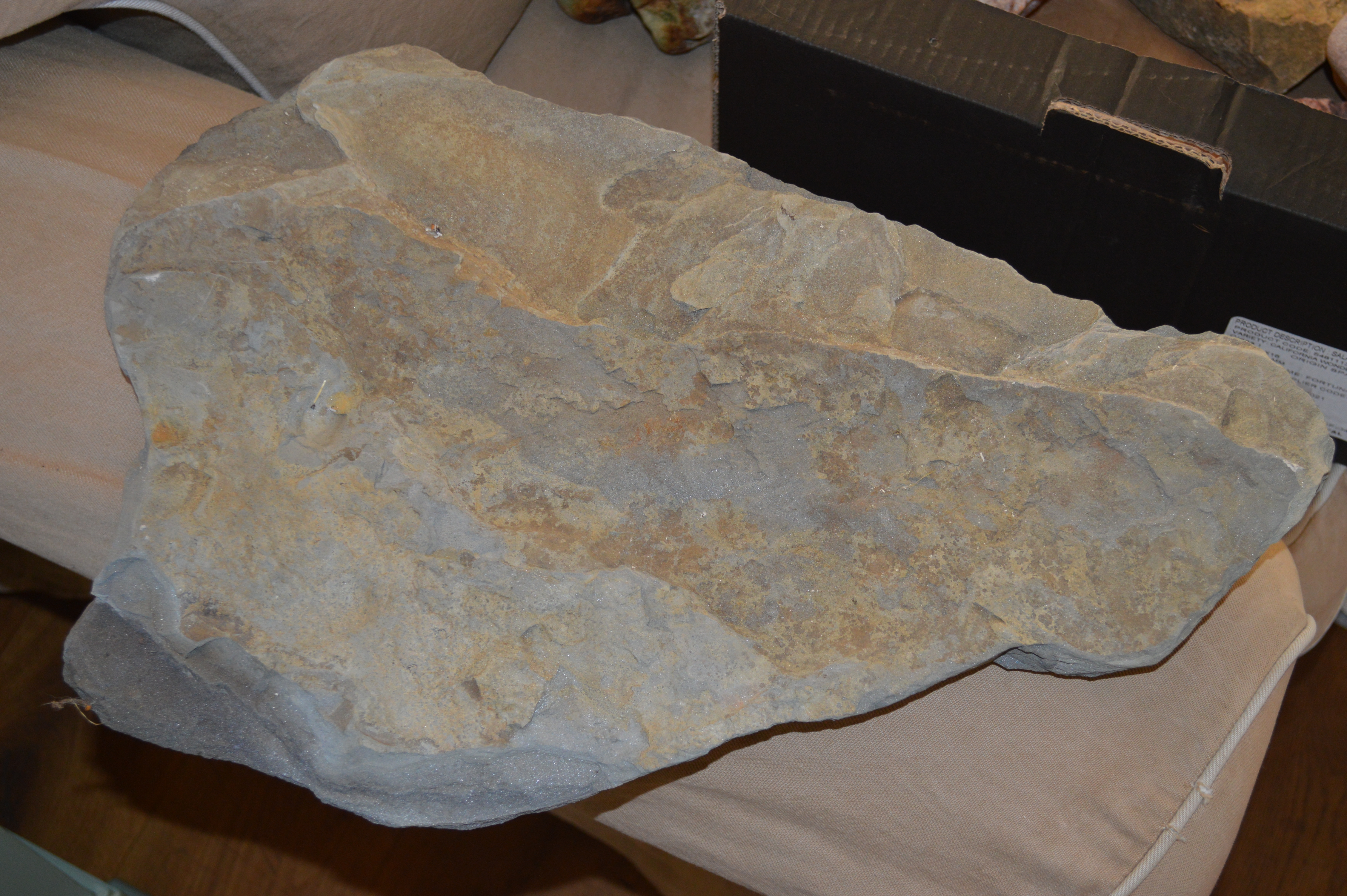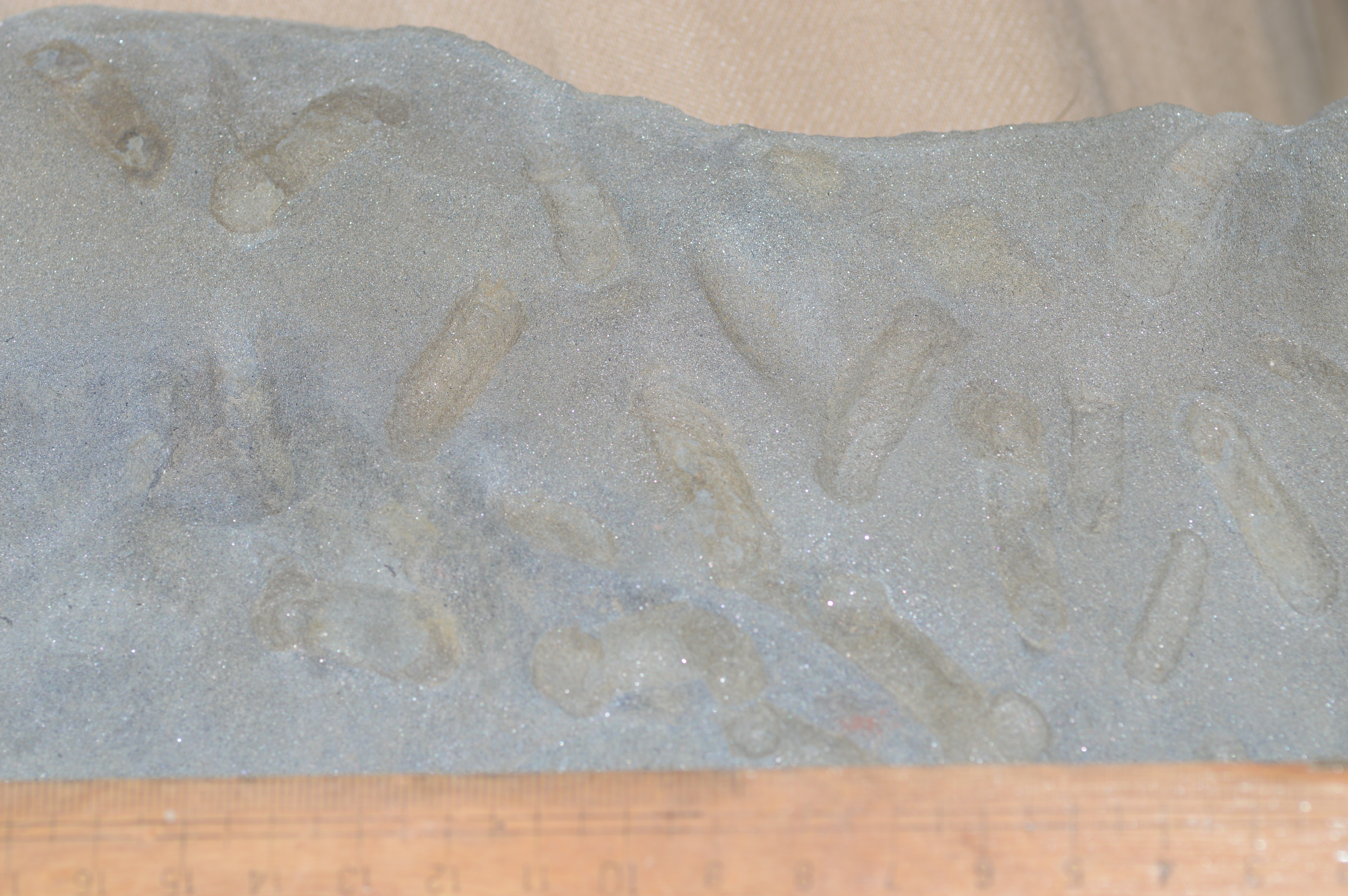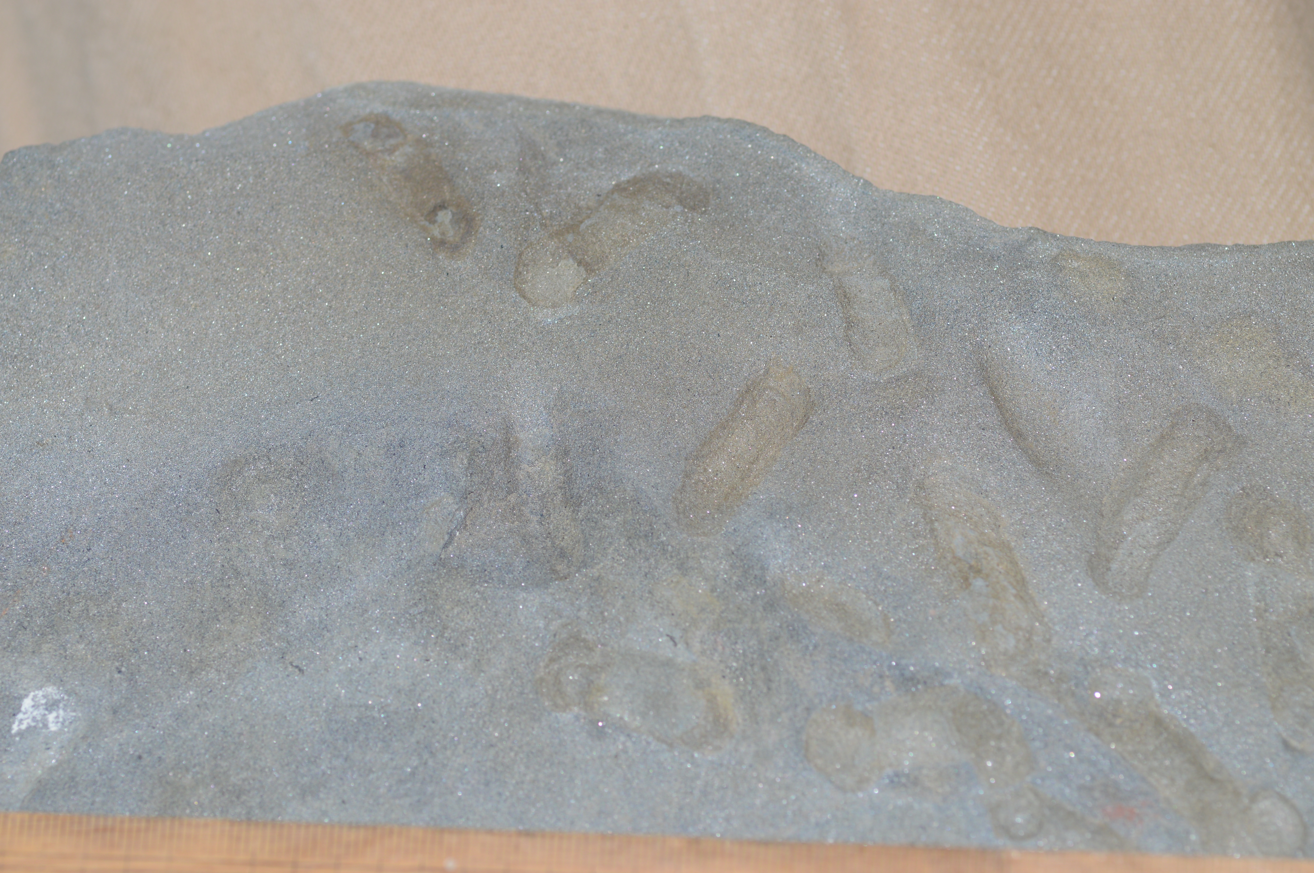 Unknown fossils, they were found in the ballagan formation in southern Scotland, it is in mudstone, it shows fine laminations on the side.